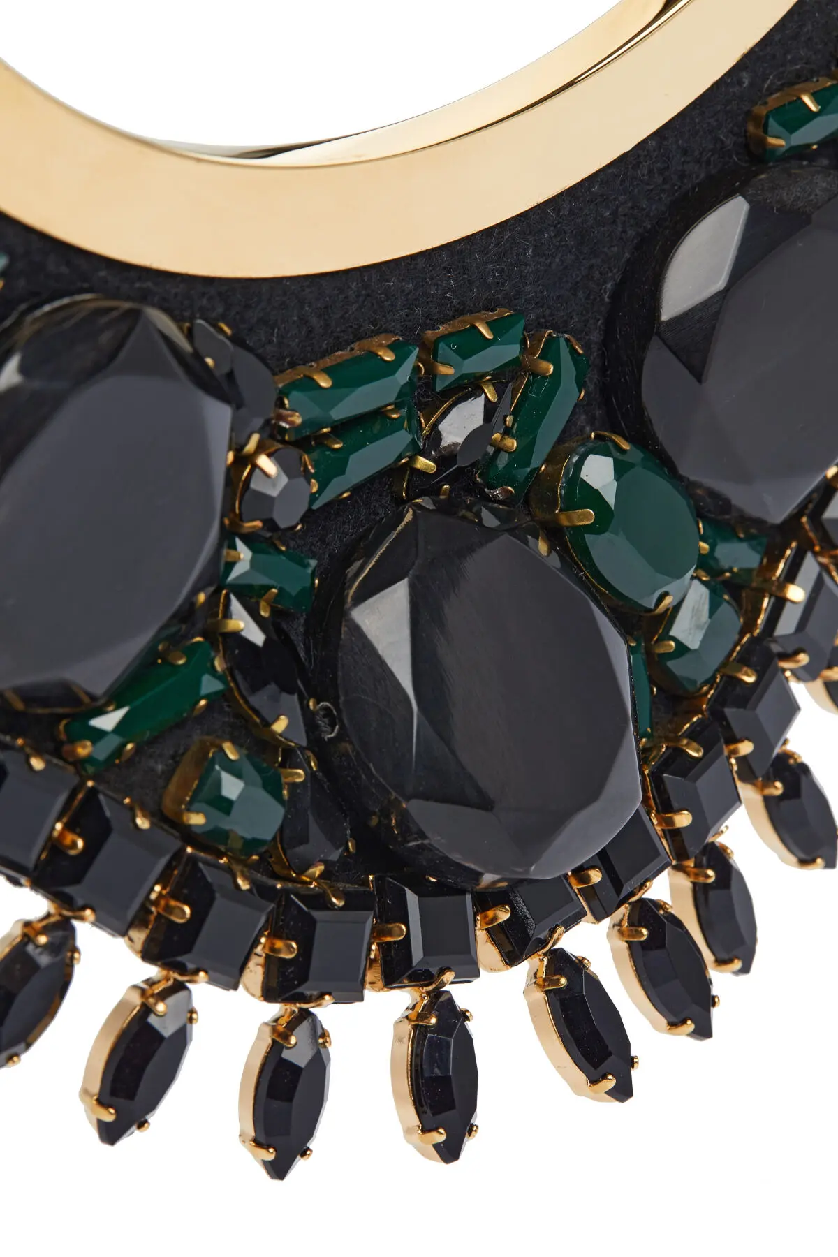 Выразительное колье-«пластрон» на текстильной ленте с золотистой планкой и крупными гранями кристаллов. Контраст черных и изумрудных вставок формирует графичный акцент и эффектно завершает вечерный образ.