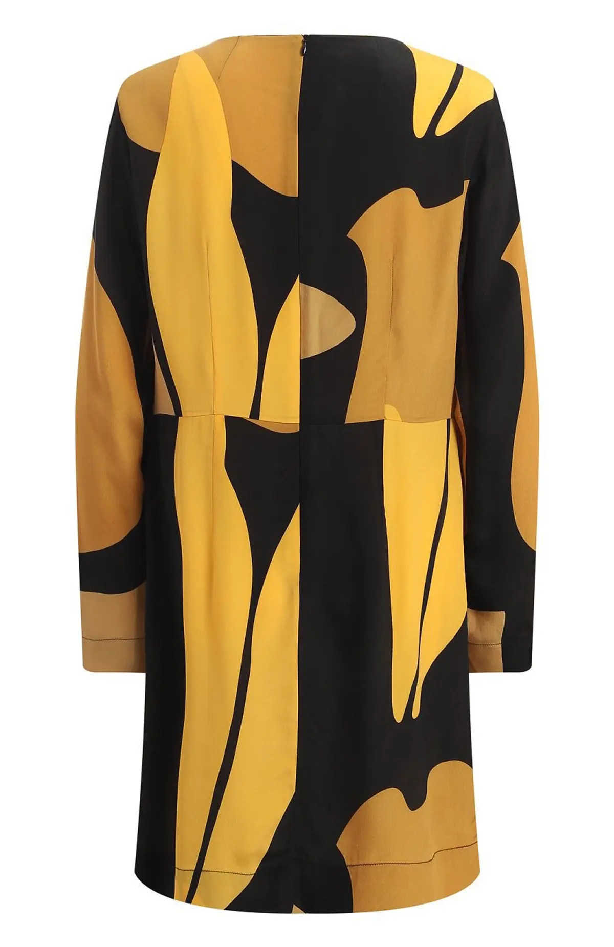 Платье Marni в современном стиле выделяется ярким абстрактным принтом в черно-горчичных тонах. Лаконичный прямой крой уравновешен выразительной деталью – асимметричной драпировкой с рюшей на груди, которая добавляет динамику образу. Длинные рукава делают модель универсальной для разных сезонов, а мягкая фактура ткани обеспечивает комфорт. Это платье органично впишется как в повседневный, так и в более нарядный гардероб, сочетаясь с минималистичными аксессуарами.