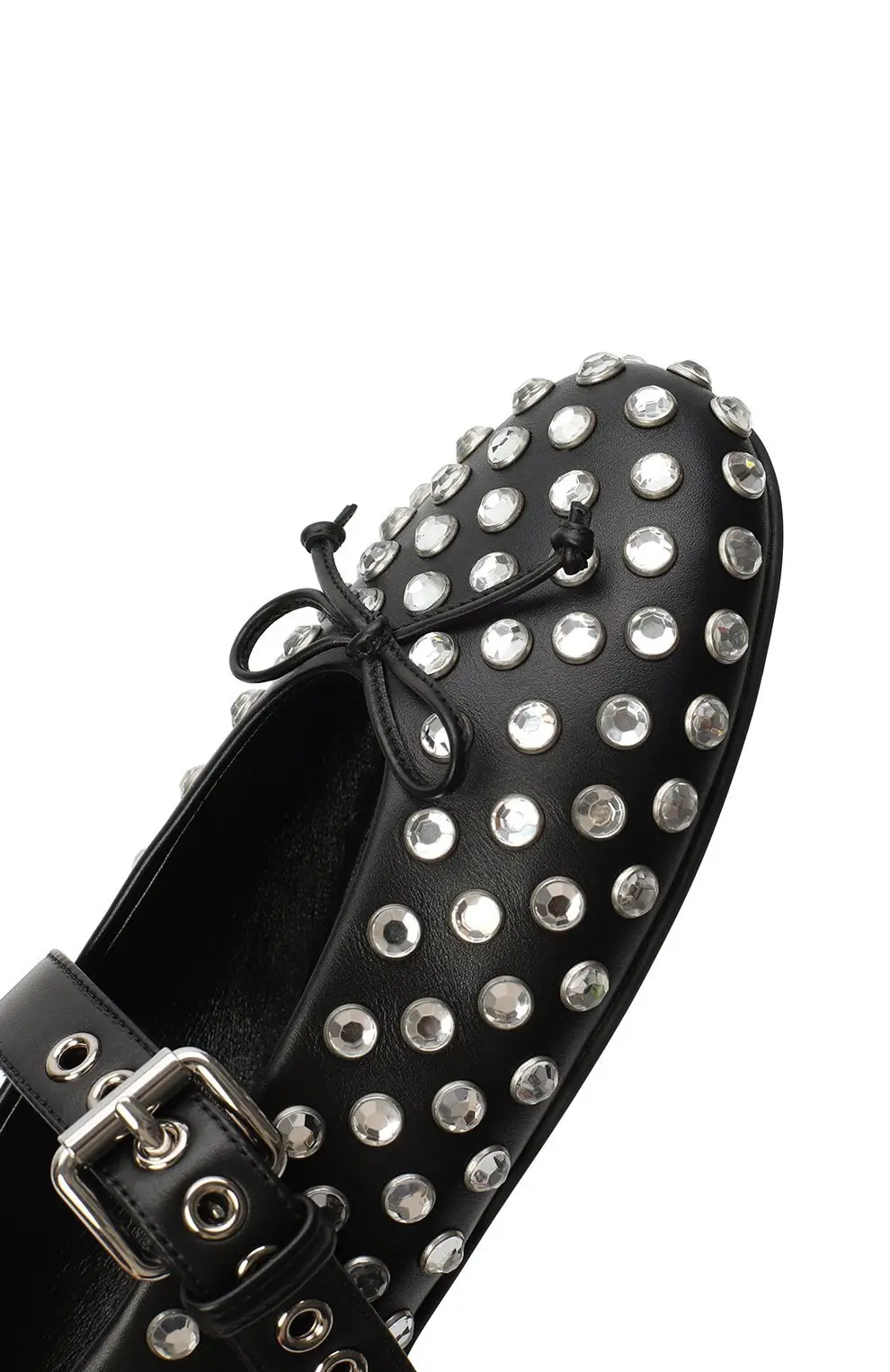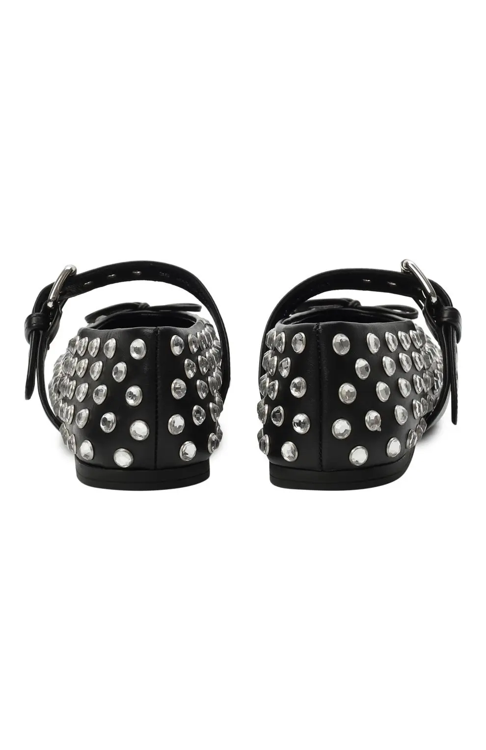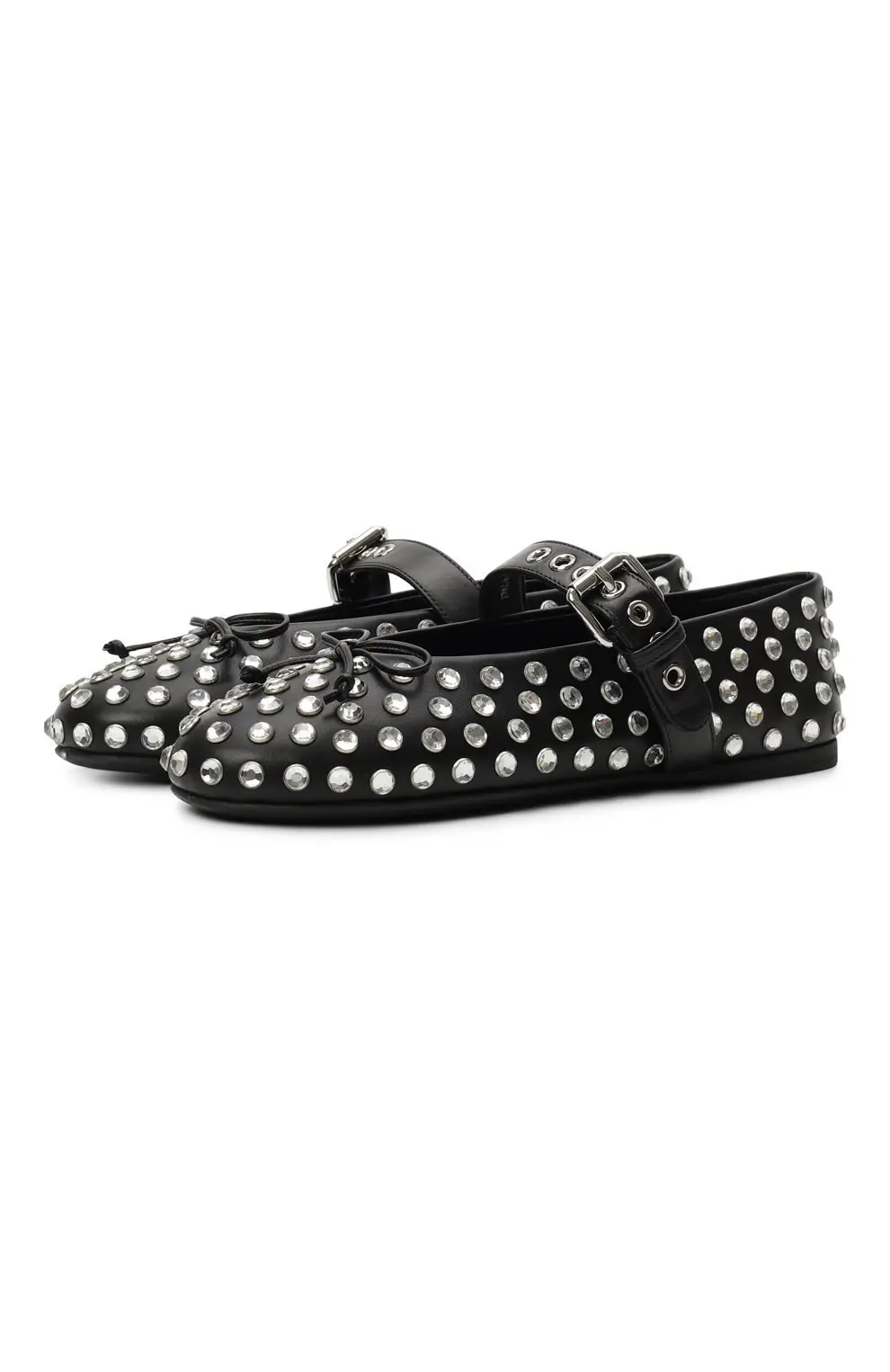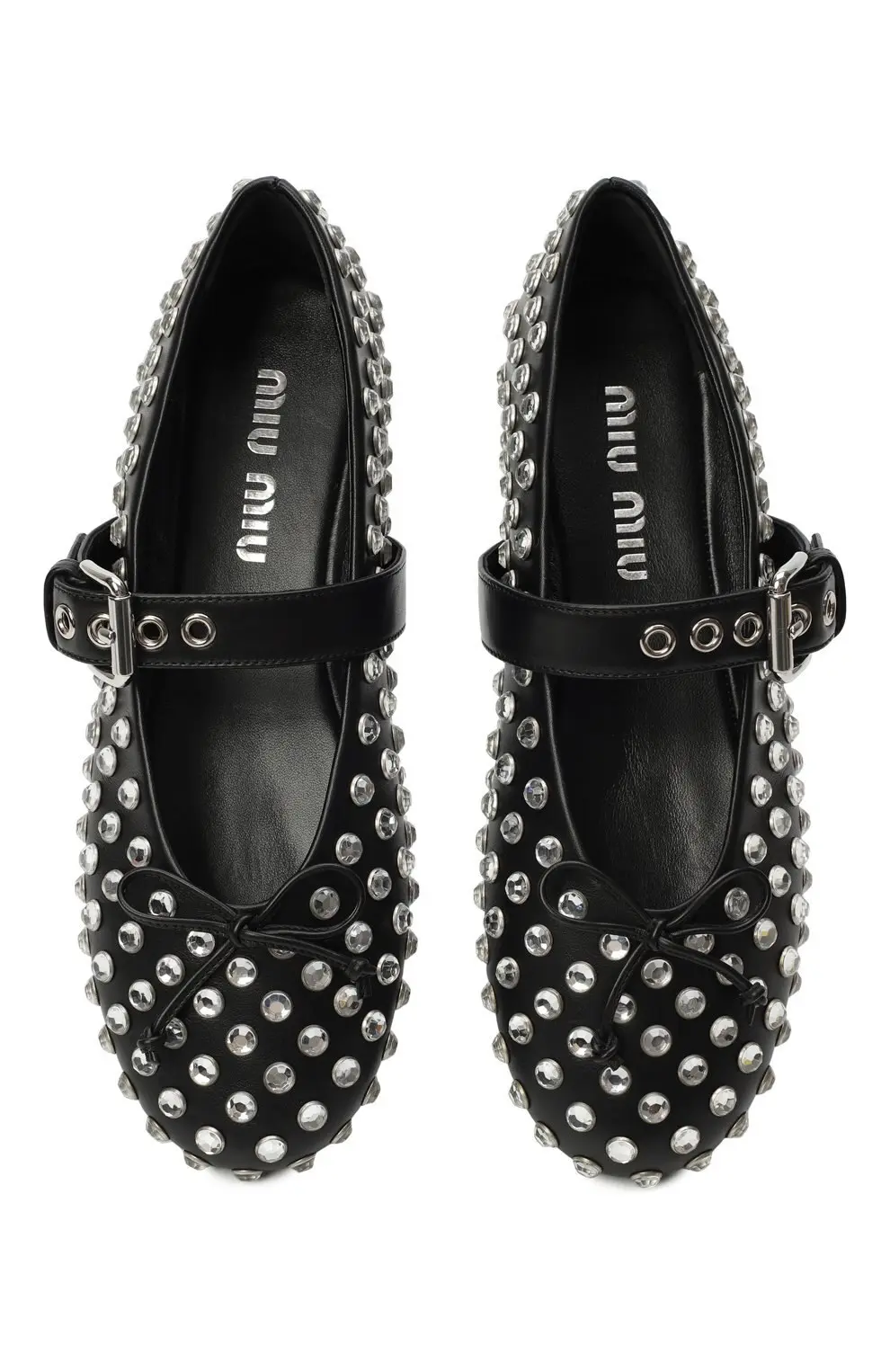 Балетки Miu Miu из чёрной кожи с дерзким и современным акцентом — по всей поверхности они украшены крупными стальными заклёпками, создающими эффект панк-гламура. Фирменные кожаные ремешки с металлическими пряжками и люверсами усиливают бунтарский характер модели, а аккуратные бантики на мыске добавляют нотку женственности.