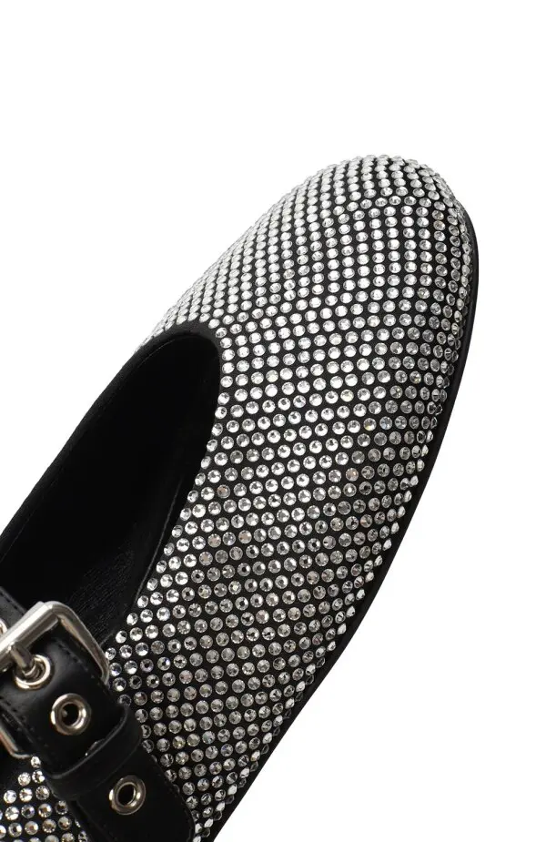 Балетки Miu Miu — изысканная пара, выполненная в стиле «Mary Jane». Модель украшена множеством страз, создающих эффект полного сияния. Дополнена кожаным ремешком с пряжкой и люверсами, что придаёт образу дерзкий и модный акцент. Отличный выбор для вечерних выходов и эффектных повседневных сочетаний.