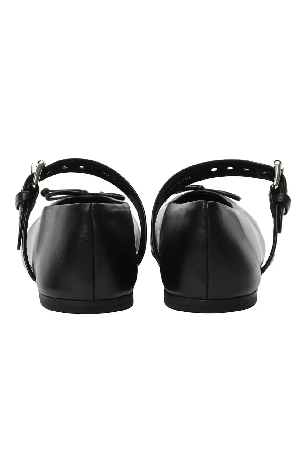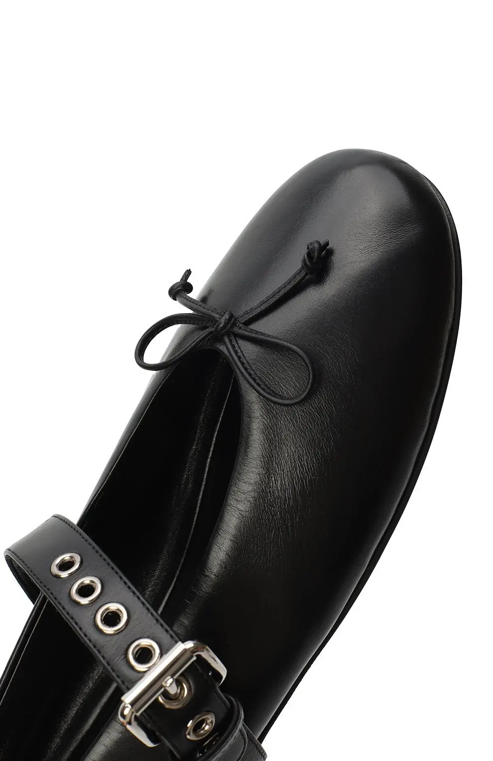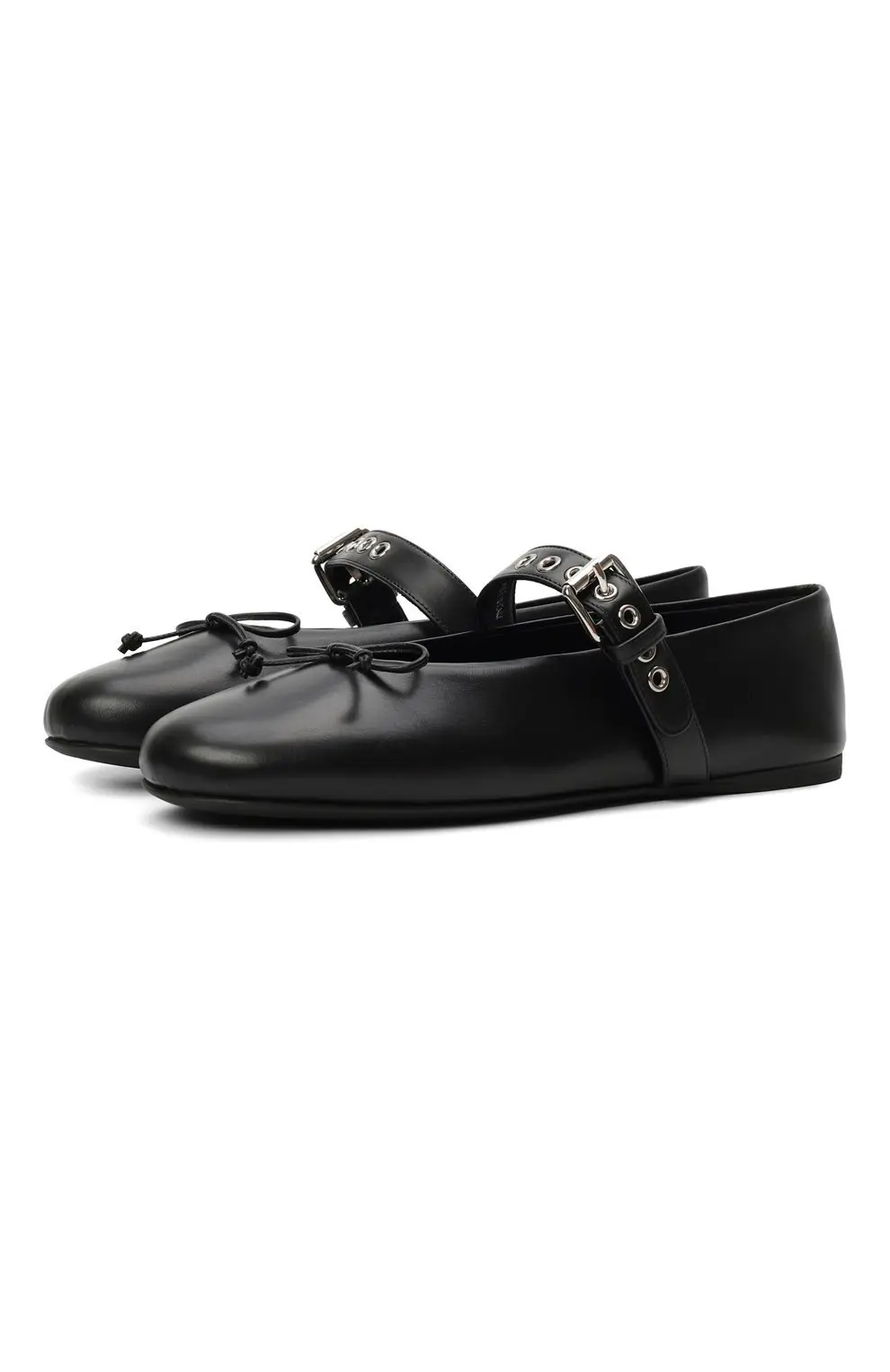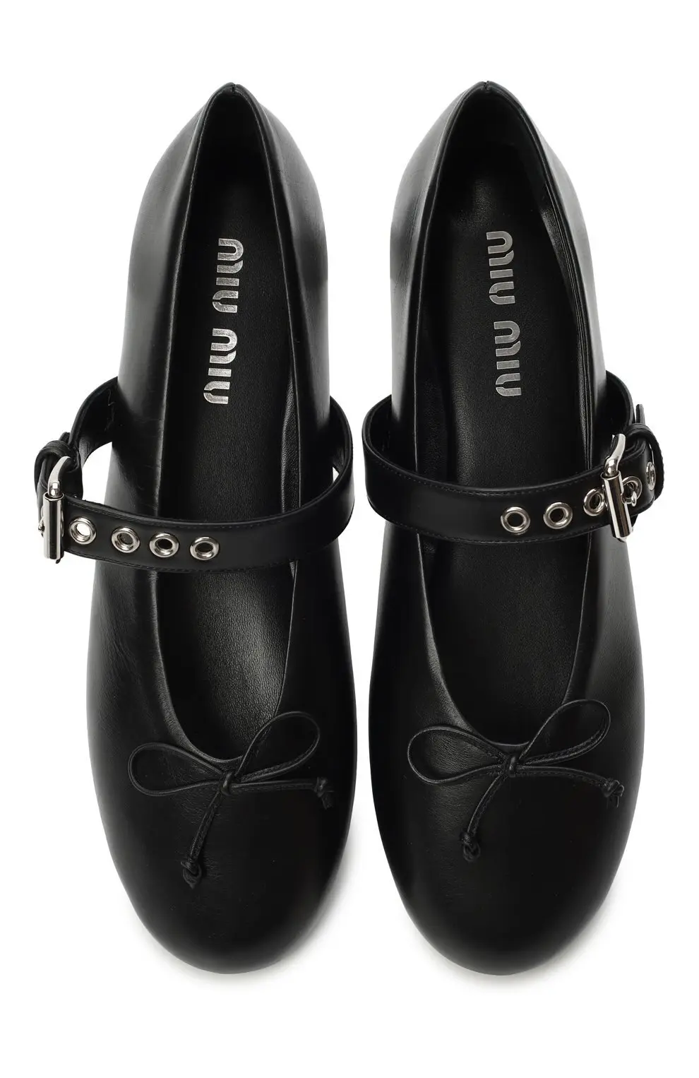 Балетки Miu Miu выполнены из гладкой чёрной кожи и имеют характерный силуэт с округлым носком. Акцент в дизайне делают кожаные ремешки с металлической пряжкой и люверсами, добавляющими современный и немного роковой штрих к классическим балеткам. Миниатюрные бантики спереди подчеркивают женственность модели.