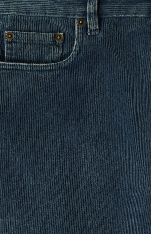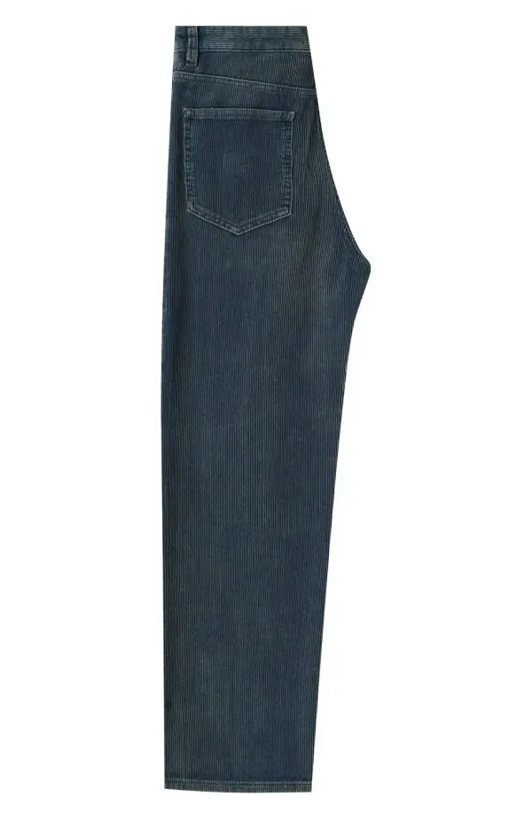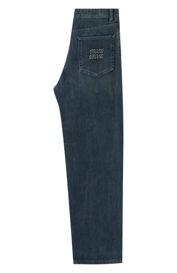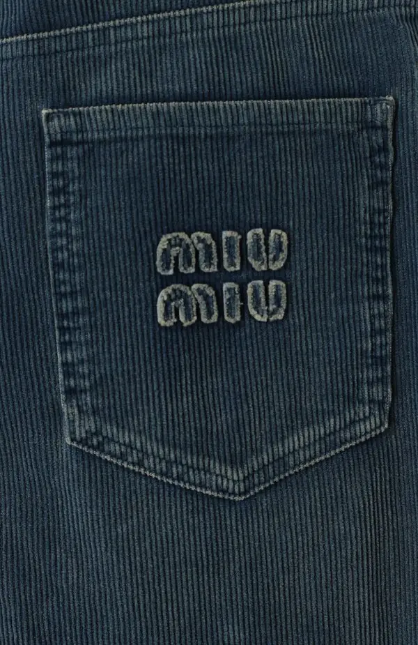Джинсы Miu Miu из вельвета глубокого синего цвета. Модель выполнена в прямом свободном крое с классической посадкой на талии, имеет стандартные пять карманов и застёжку на молнию с пуговицей. Эффект лёгкого винтажного выцветания подчёркивает характер бренда и делает джинсы универсальными для повседневных образов.