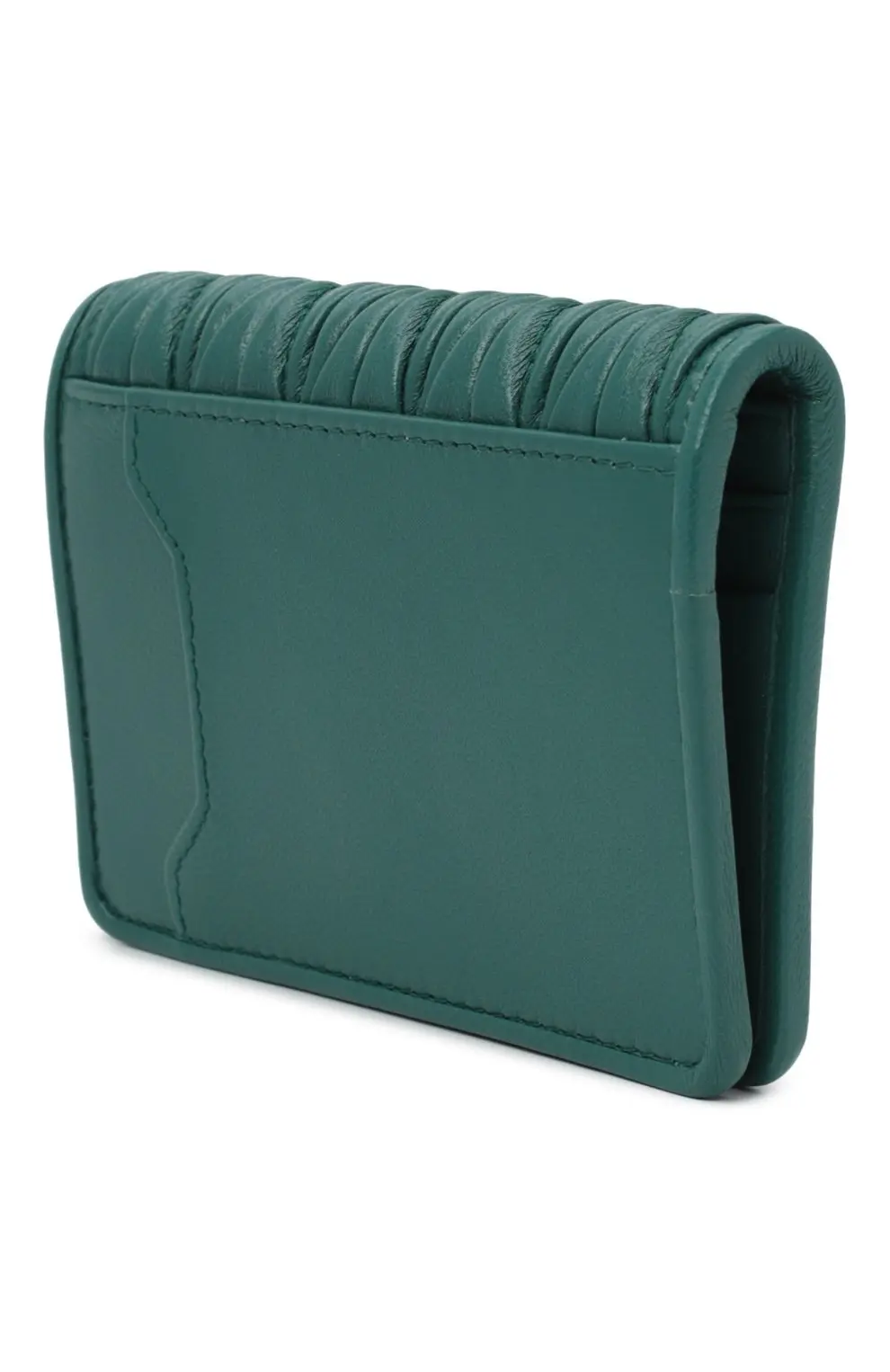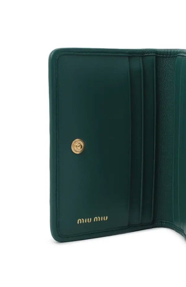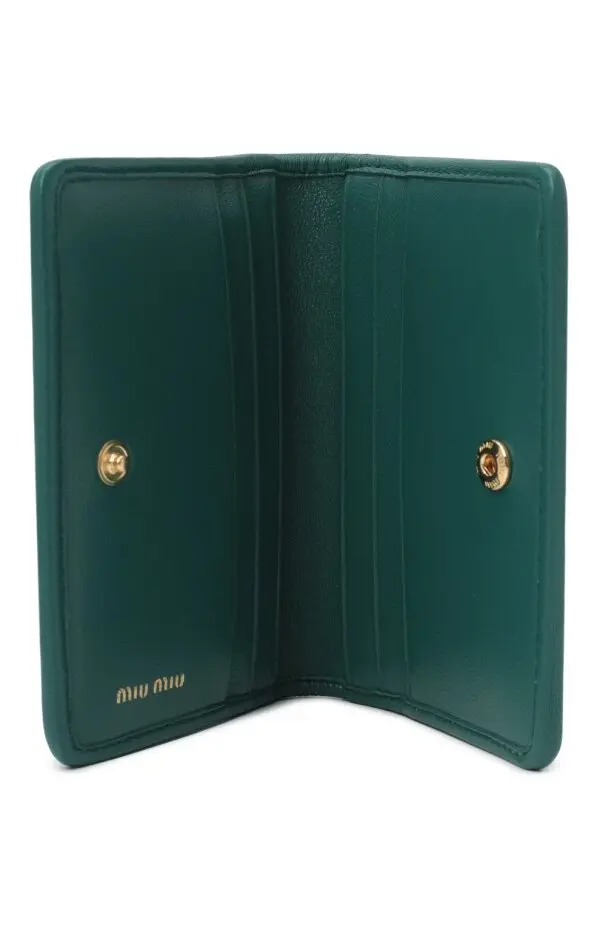 Картхолдер Miu Miu из зелёной кожи с фирменным мателлассе-плетением. Компактный формат с золотистым логотипом бренда спереди сочетает в себе изысканный стиль и практичность — идеально для хранения карт и визиток.