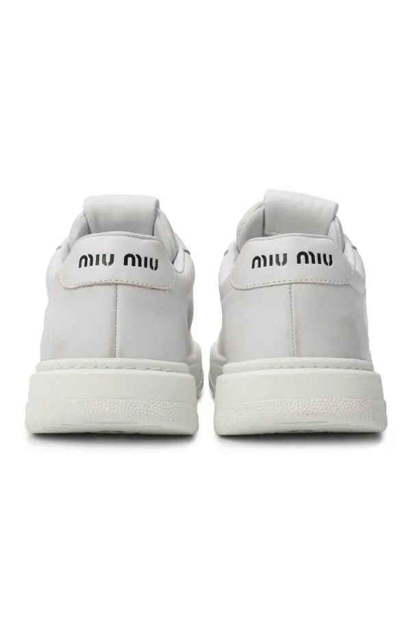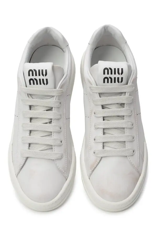 Кеды Miu Miu в минималистичном белом исполнении. Лаконичный дизайн с фирменным логотипом на язычке и боковой подошве подчёркивает универсальность модели. Идеально подойдут для повседневного образа.