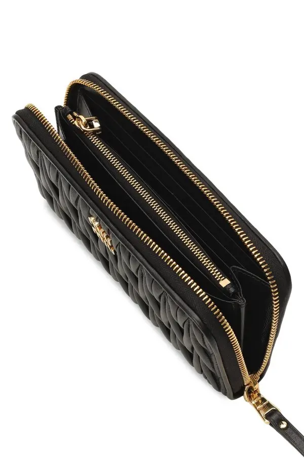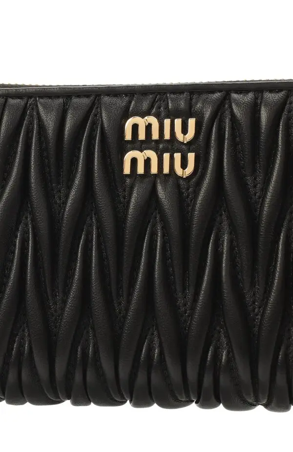 Элегантный кошелёк выполнен из мягкой кожи с фирменным стёганым узором Matelassé. Черный цвет подчеркивает универсальность аксессуара, а золотистый логотип Miu Miu добавляет изысканности. Модель закрывается на молнию по периметру, обеспечивая удобный доступ к внутренним отделениям. Внутри предусмотрены секции для купюр, карточек и монет, что делает кошелёк не только стильным, но и максимально функциональным.