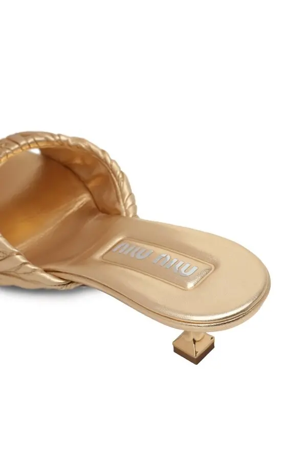 Мюли Miu Miu выполнены из мягкой кожи золотистого оттенка с характерным фирменным плетёным узором Matelassé. Модель на небольшом изогнутом каблуке kitten heel придаёт образу изысканность и лёгкость. Открытый мысок и сияющая поверхность делают обувь выразительным акцентом для вечерних выходов.