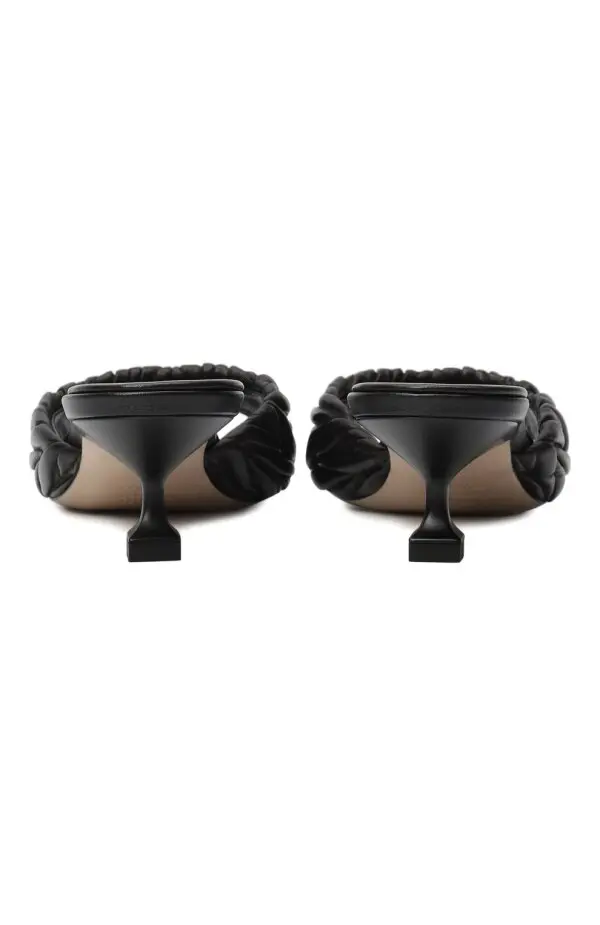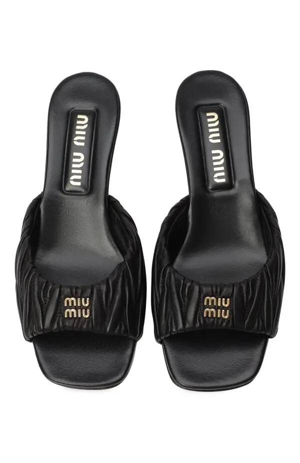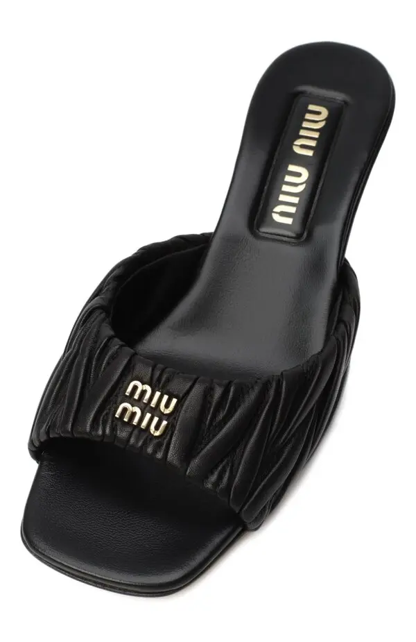 Мюли Miu Miu из мягкой кожи в чёрном цвете выполнены с фирменным стёганым узором Matelassé. Лаконичный дизайн дополнен открытым мысом и небольшим каблуком kitten heel, создающим изящный силуэт. Золотистый логотип на ремешке придаёт модели утончённый акцент.