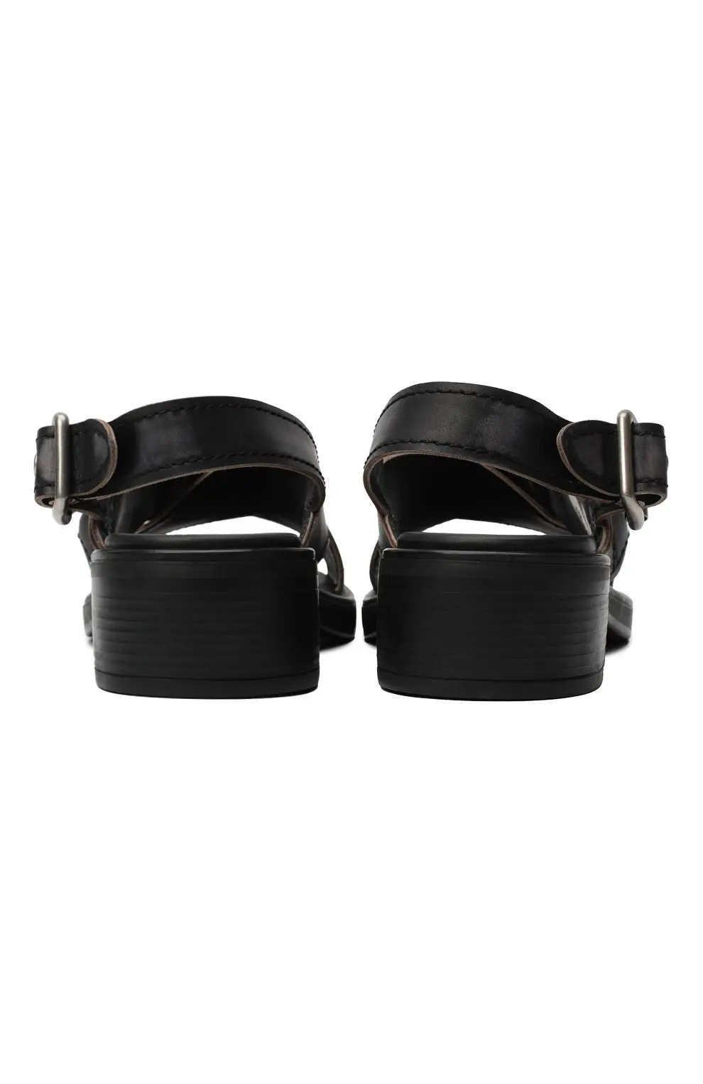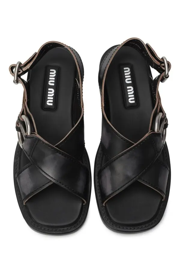 Сандалии Miu Miu выполнены из чёрной гладкой кожи с перекрещивающимися ремнями. Деталью дизайна служит крупное металлическое кольцо с гравировкой бренда и регулируемые пряжки, которые обеспечивают комфортную посадку. Массивная подошва с небольшим каблуком придаёт модели современный и стильный вид.
