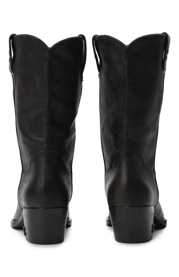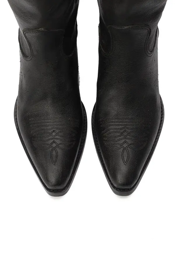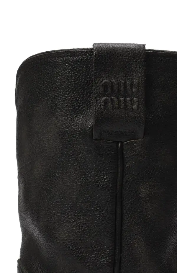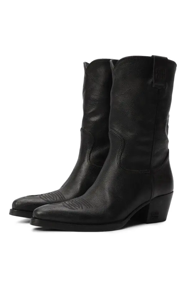 Казаки Miu Miu из мягкой чёрной кожи. Дизайн вдохновлён классическими вестерн-ботинками: заострённый нос, характерная прострочка и устойчивый каблук средней высоты. На боковой части и петельке — фирменный логотип бренда. Модель сочетает в себе дерзкий стиль и универсальность, подойдёт как к джинсам, так и к платьям в стиле бохо или кэжуал.