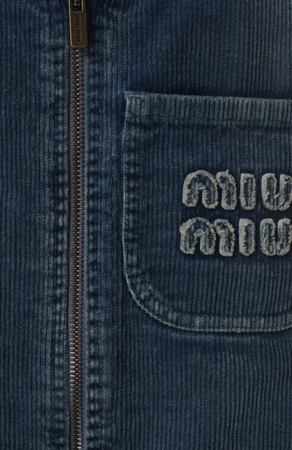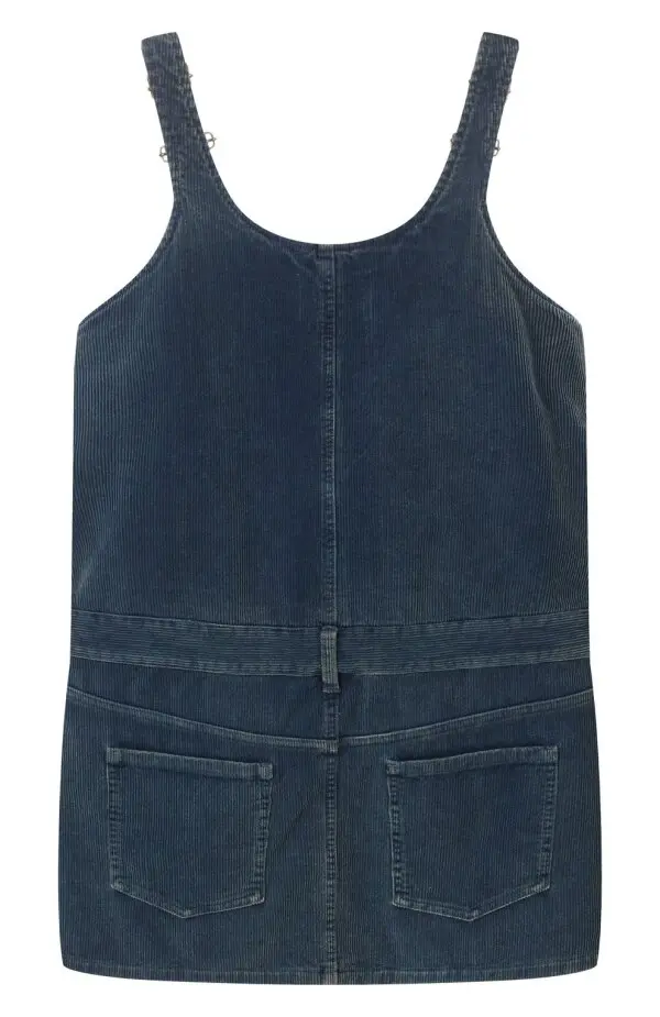 Сарафан Miu Miu выполнен из вельвета глубокого синего оттенка. Модель имеет молнию по центру, регулируемые лямки на металлических пряжках и накладной карман с фирменным вышитым логотипом бренда. Нижняя часть оформлена в стиле джинсовых изделий с поясными шлёвками и боковыми карманами, что придаёт сарафану повседневный и одновременно игривый характер.