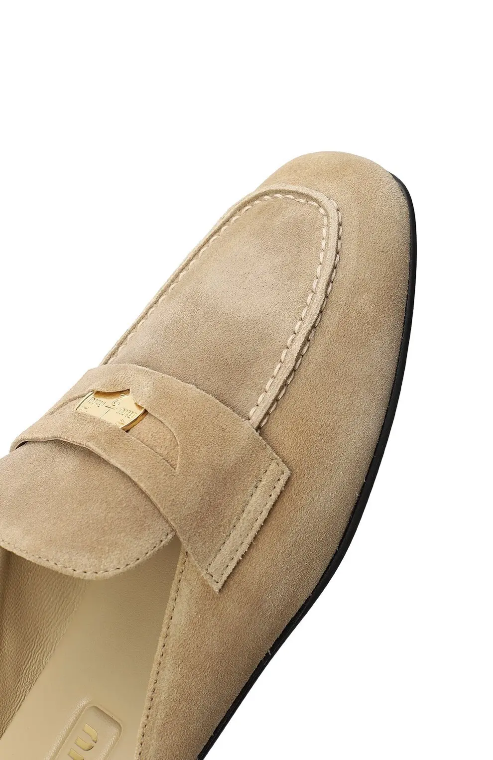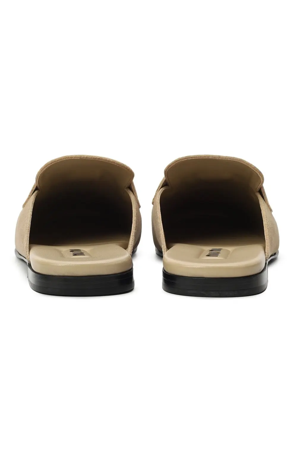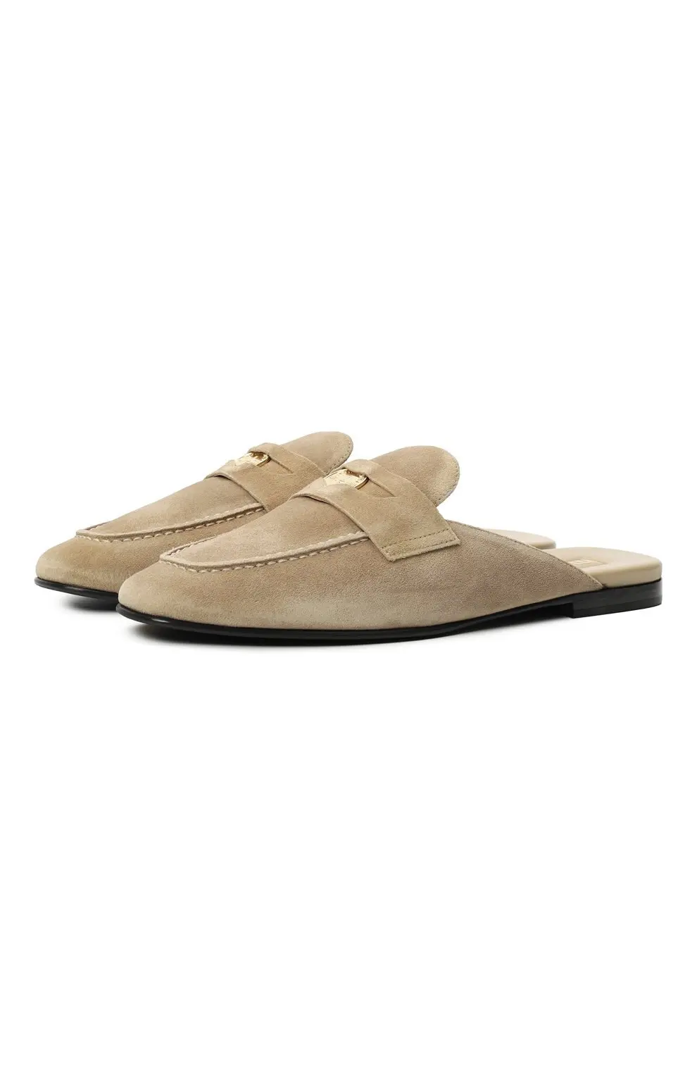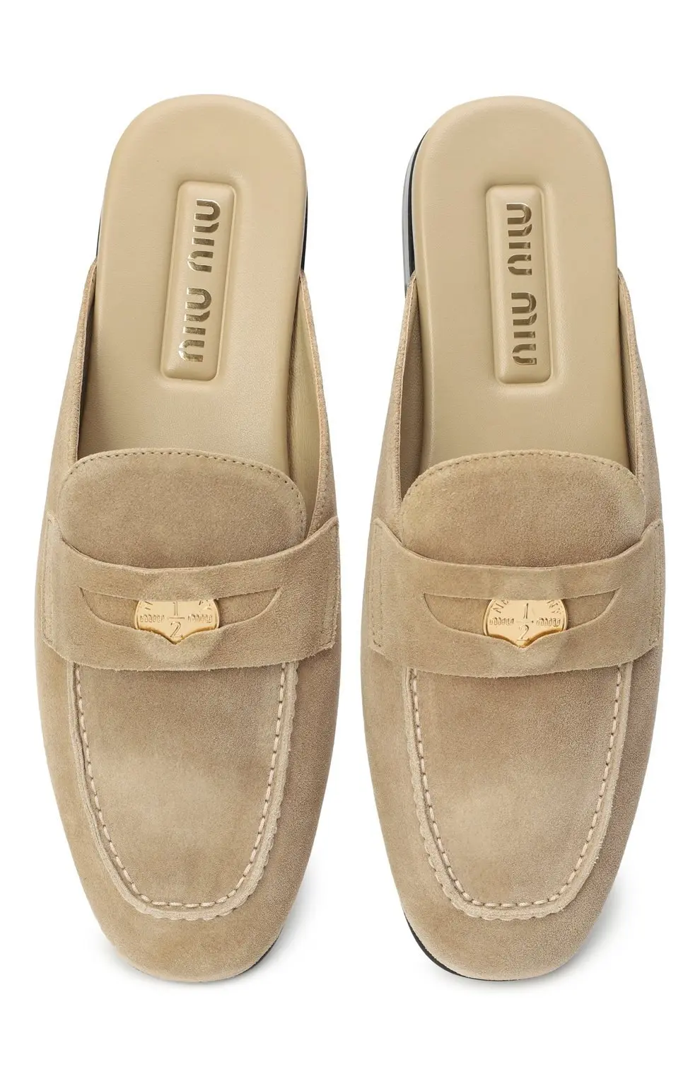 Сабо Miu Miu выполнены из мягкой замши бежевого оттенка. Модель имеет лаконичный дизайн в стиле лоферов с открытой пяткой, что придаёт обуви современный и лёгкий характер. Дополняет образ золотистый акцент в виде фирменной детали, создающий элегантный вид.
