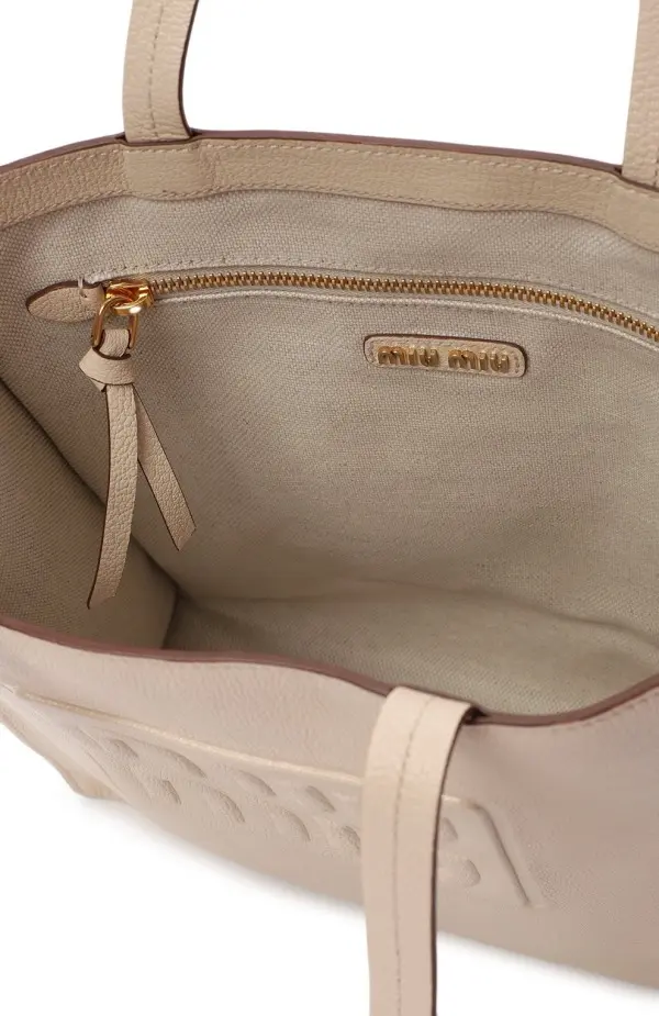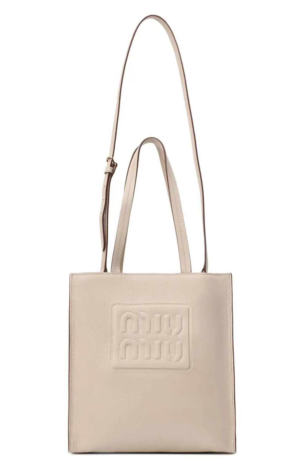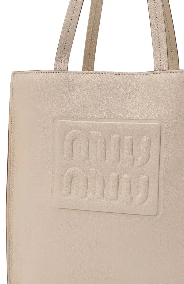 Просторная сумка-шоппер от Miu Miu из мягкой бежевой кожи станет идеальным аксессуаром для повседневного использования. Минималистичный дизайн дополнен тиснёным логотипом бренда, а длинные ручки позволяют носить модель как в руке, так и на плече. Лёгкая и универсальная, она сочетает в себе практичность и современную эстетику.