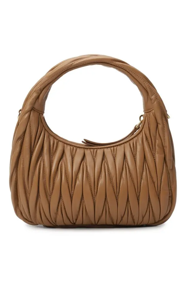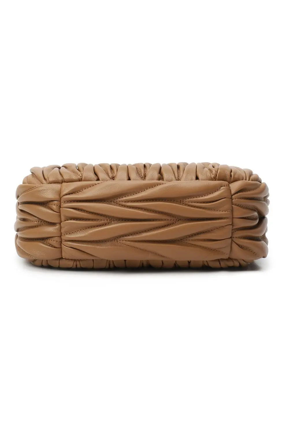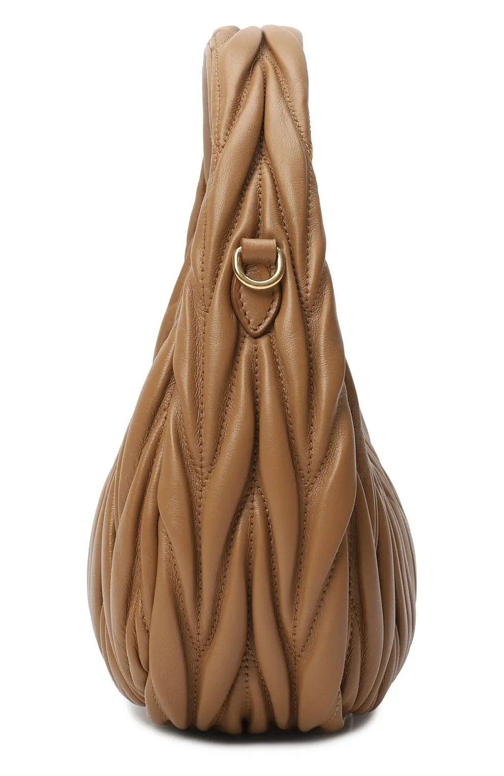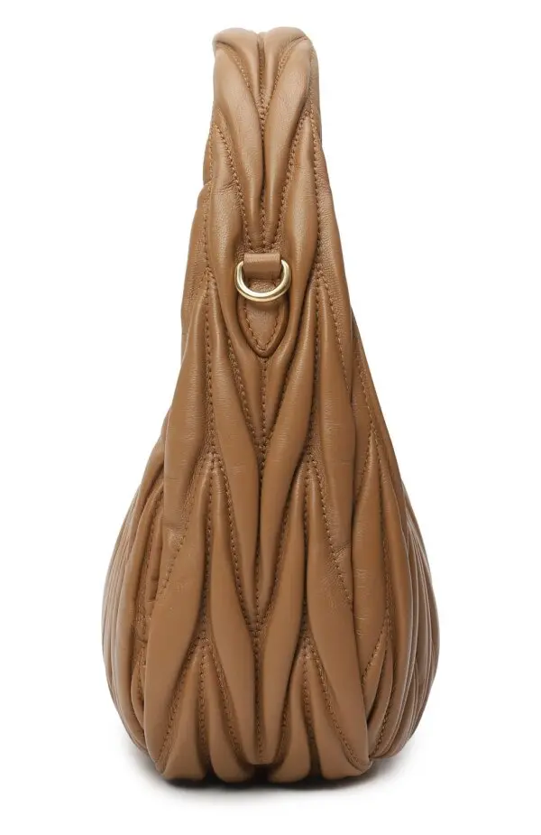 Сумка Wander Miu Miu выполнена из мягкой кожи в карамельном оттенке с фирменной стеганой текстурой Matelassé. Закругленная форма-хобо придает модели современный и женственный силуэт. Металлический логотип бренда в золотистом цвете акцентирует элегантность аксессуара, а широкая ручка делает его удобным для повседневной носки.