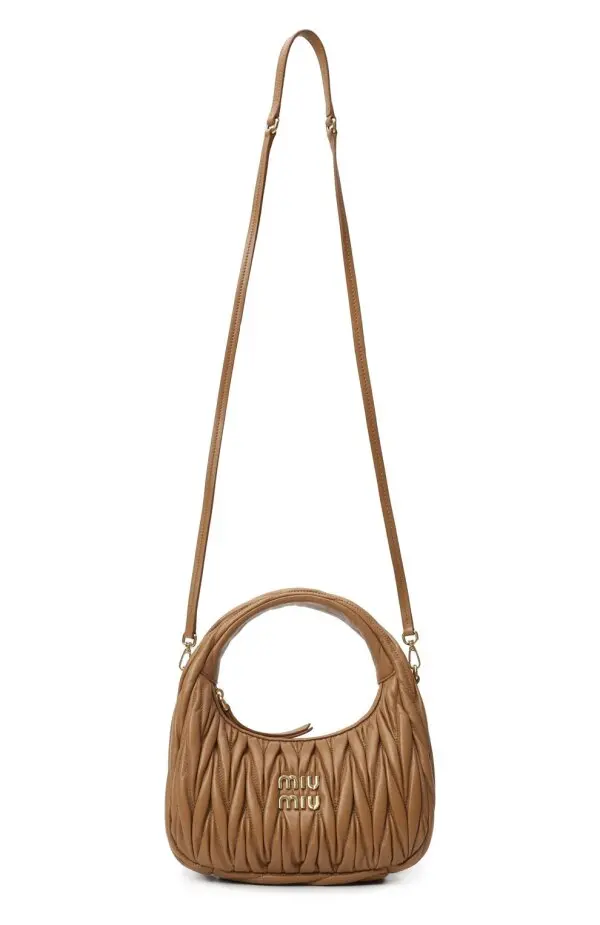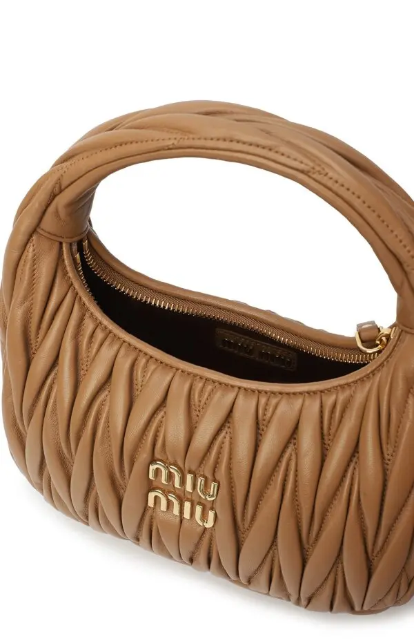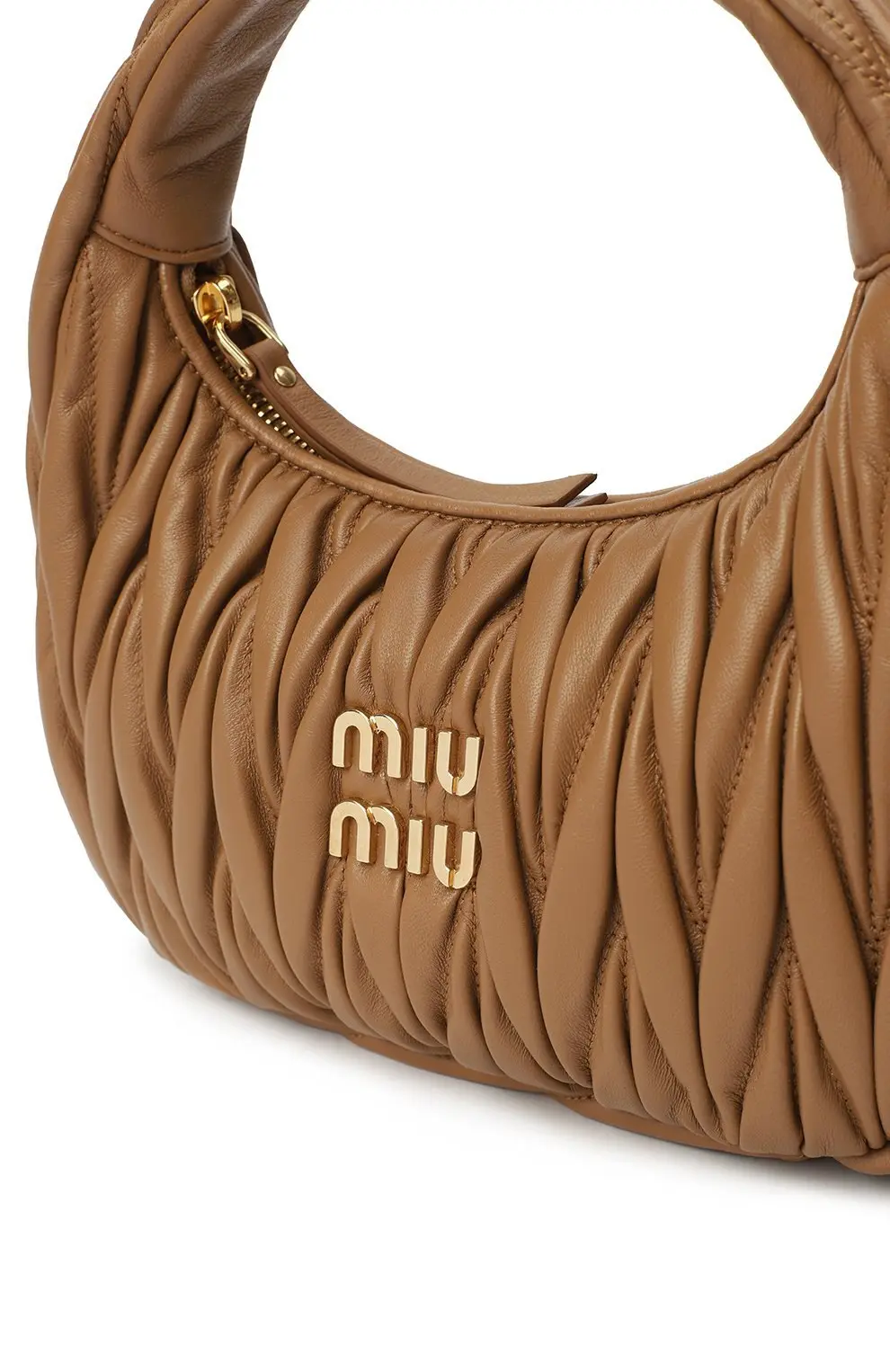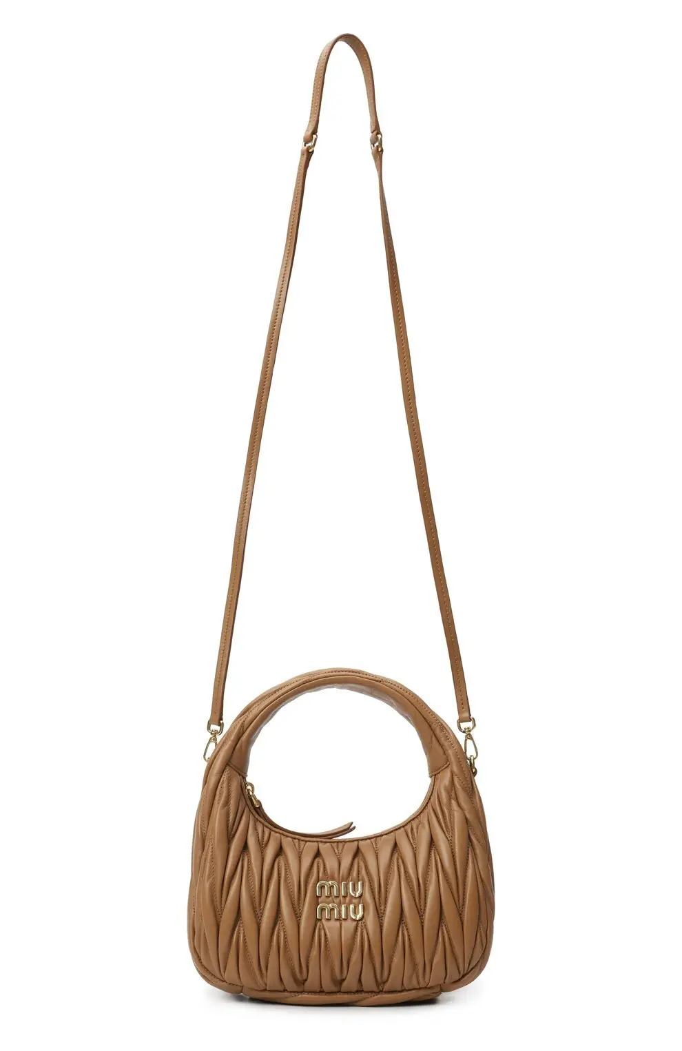 Сумка Wander Miu Miu выполнена из мягкой кожи в карамельном оттенке с фирменной стеганой текстурой Matelassé. Закругленная форма-хобо придает модели современный и женственный силуэт. Металлический логотип бренда в золотистом цвете акцентирует элегантность аксессуара, а широкая ручка делает его удобным для повседневной носки.