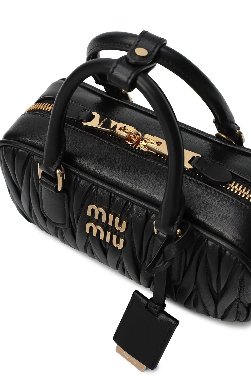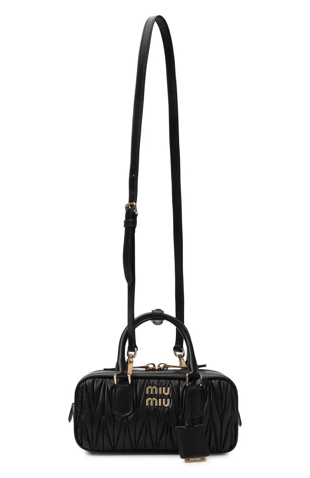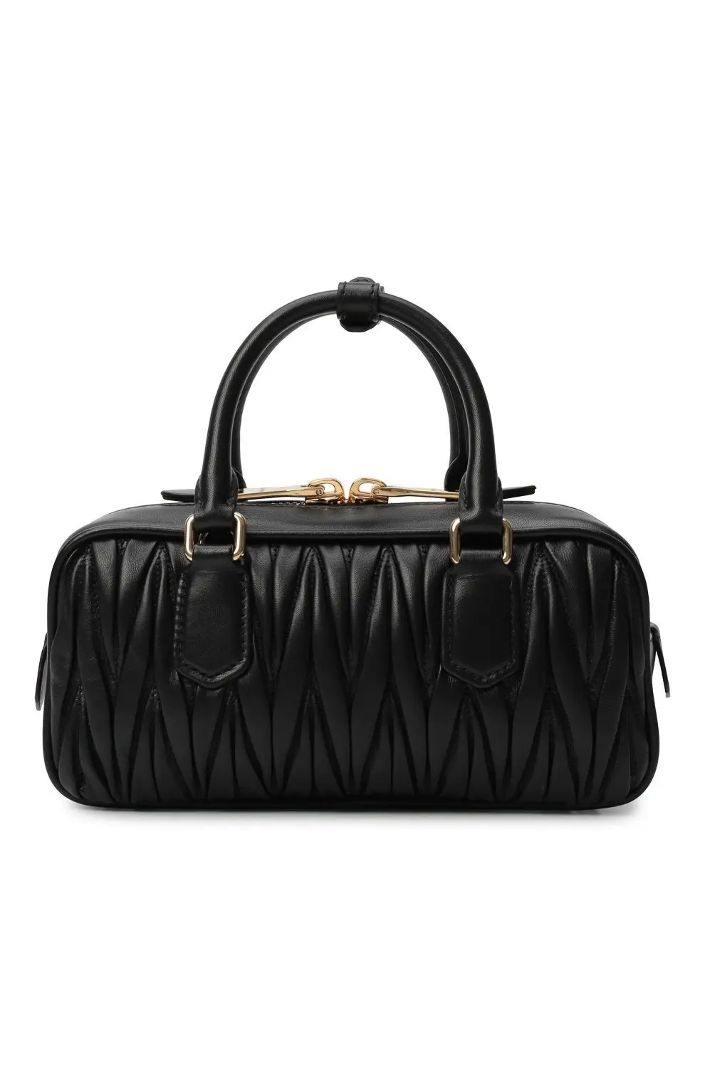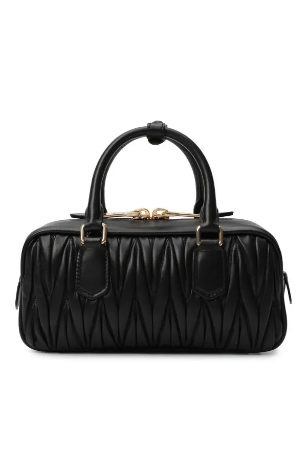 Сумка Arcadie от Miu Miu выполнена из мягкой чёрной кожи и украшена фирменным мателассé-декором, создающим объёмную фактуру и элегантный силуэт. Компактная форма в стиле «боулинг» дополнена двумя короткими ручками и застёжкой на молнию, что делает модель практичной для повседневного использования. Золотистый логотип Miu Miu на передней панели подчеркивает изысканный характер аксессуара. Сумка Arcadie гармонично сочетает функциональность и современный дизайн, оставаясь универсальным акцентом в образе.