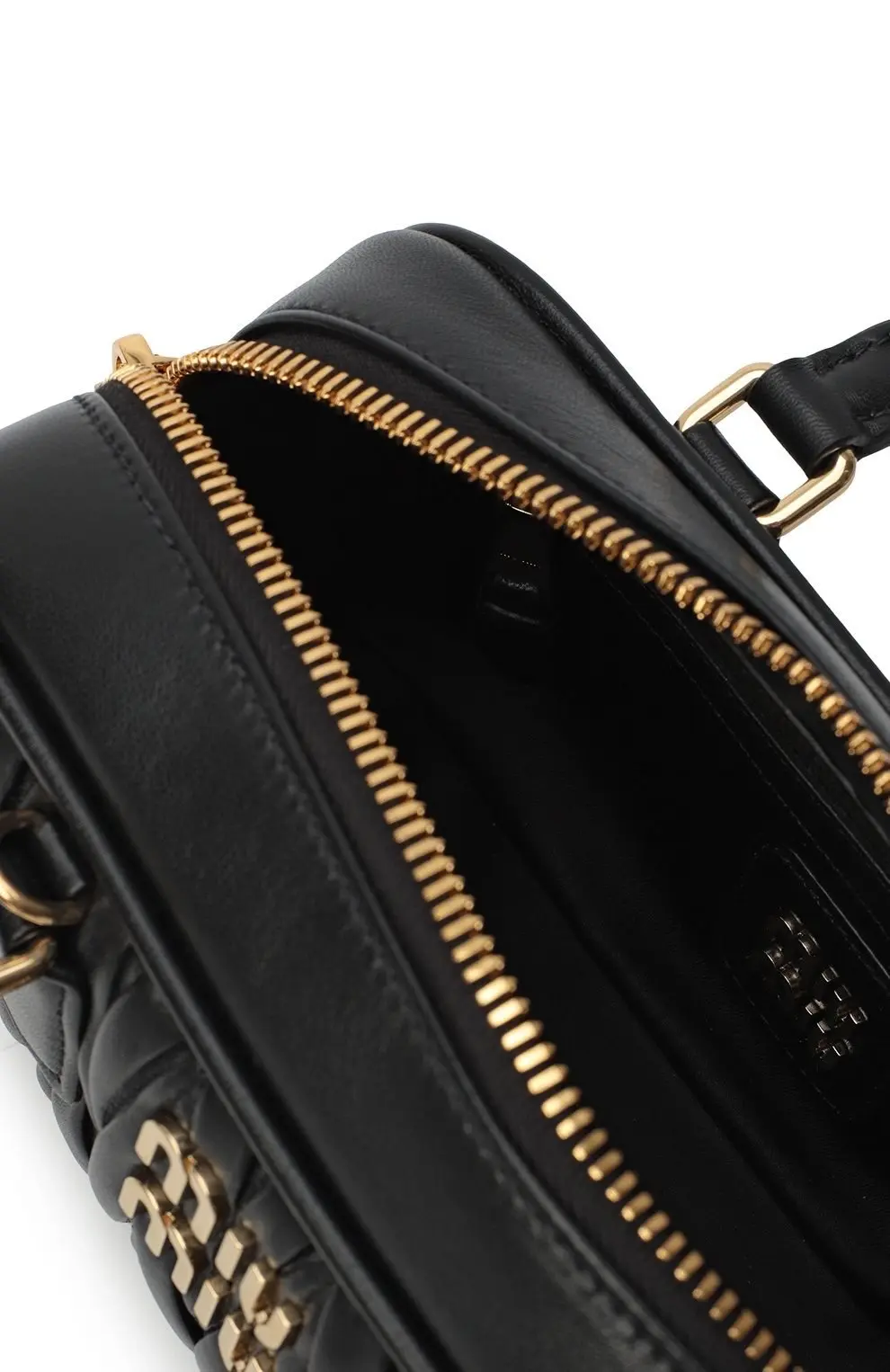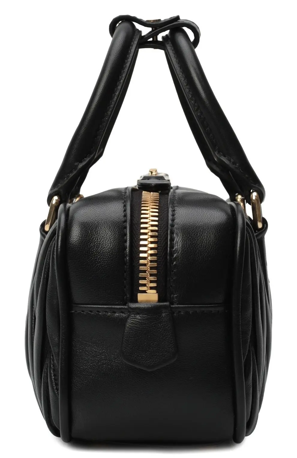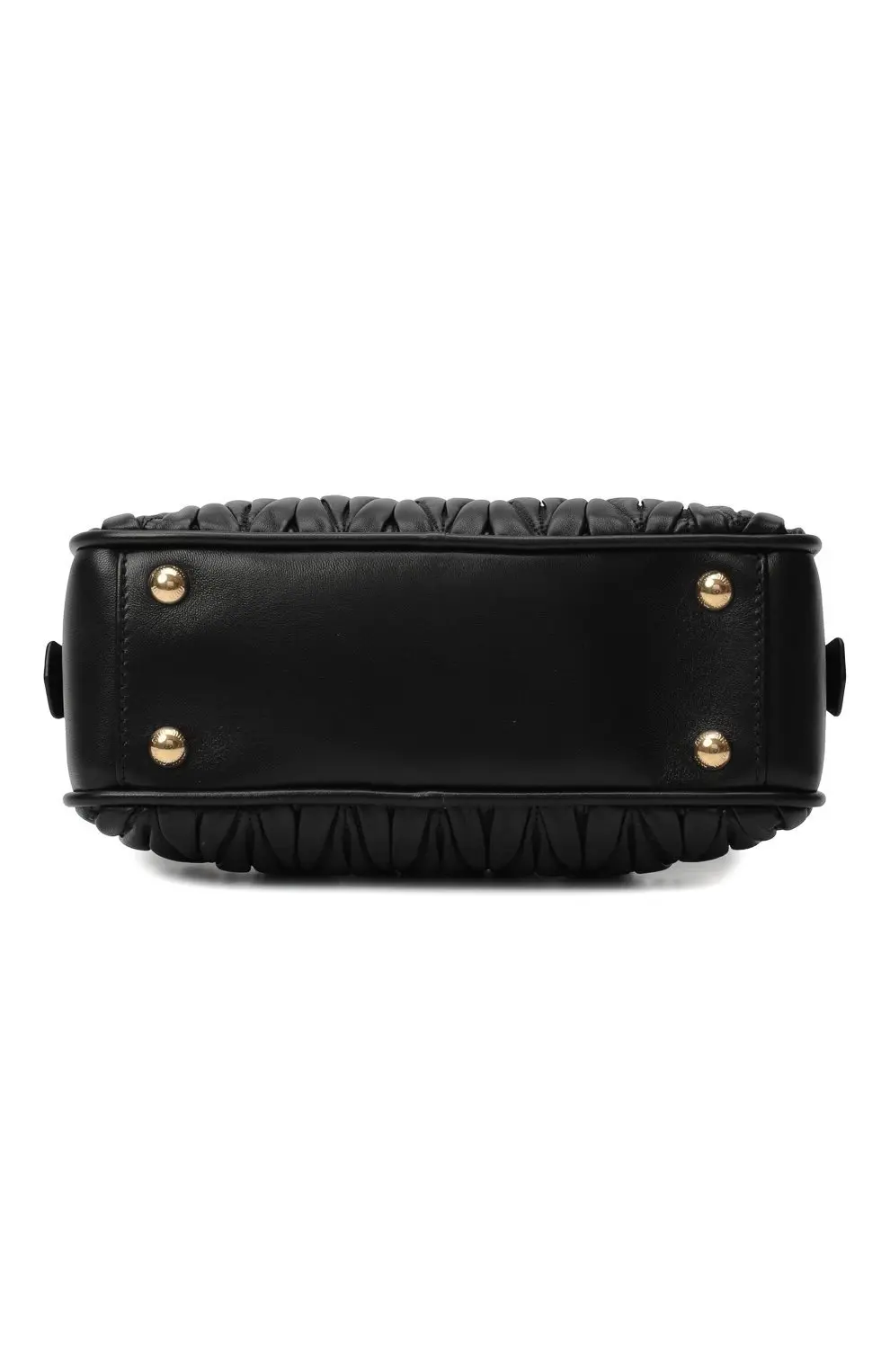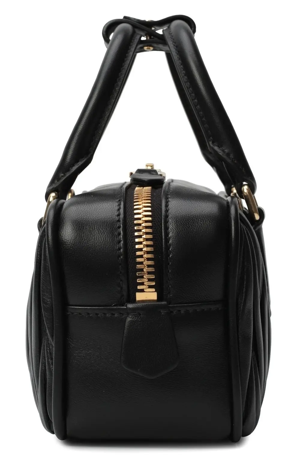 Сумка Arcadie от Miu Miu выполнена из мягкой чёрной кожи и украшена фирменным мателассé-декором, создающим объёмную фактуру и элегантный силуэт. Компактная форма в стиле «боулинг» дополнена двумя короткими ручками и застёжкой на молнию, что делает модель практичной для повседневного использования. Золотистый логотип Miu Miu на передней панели подчеркивает изысканный характер аксессуара. Сумка Arcadie гармонично сочетает функциональность и современный дизайн, оставаясь универсальным акцентом в образе.