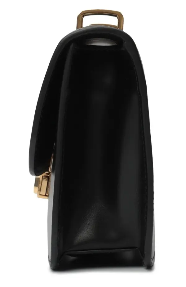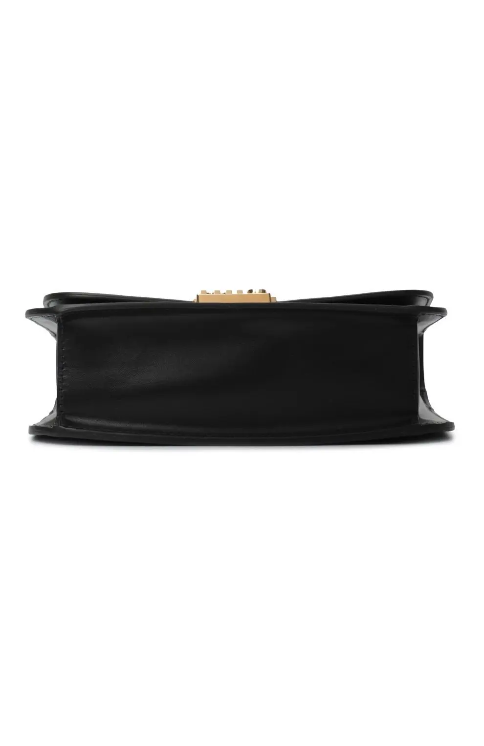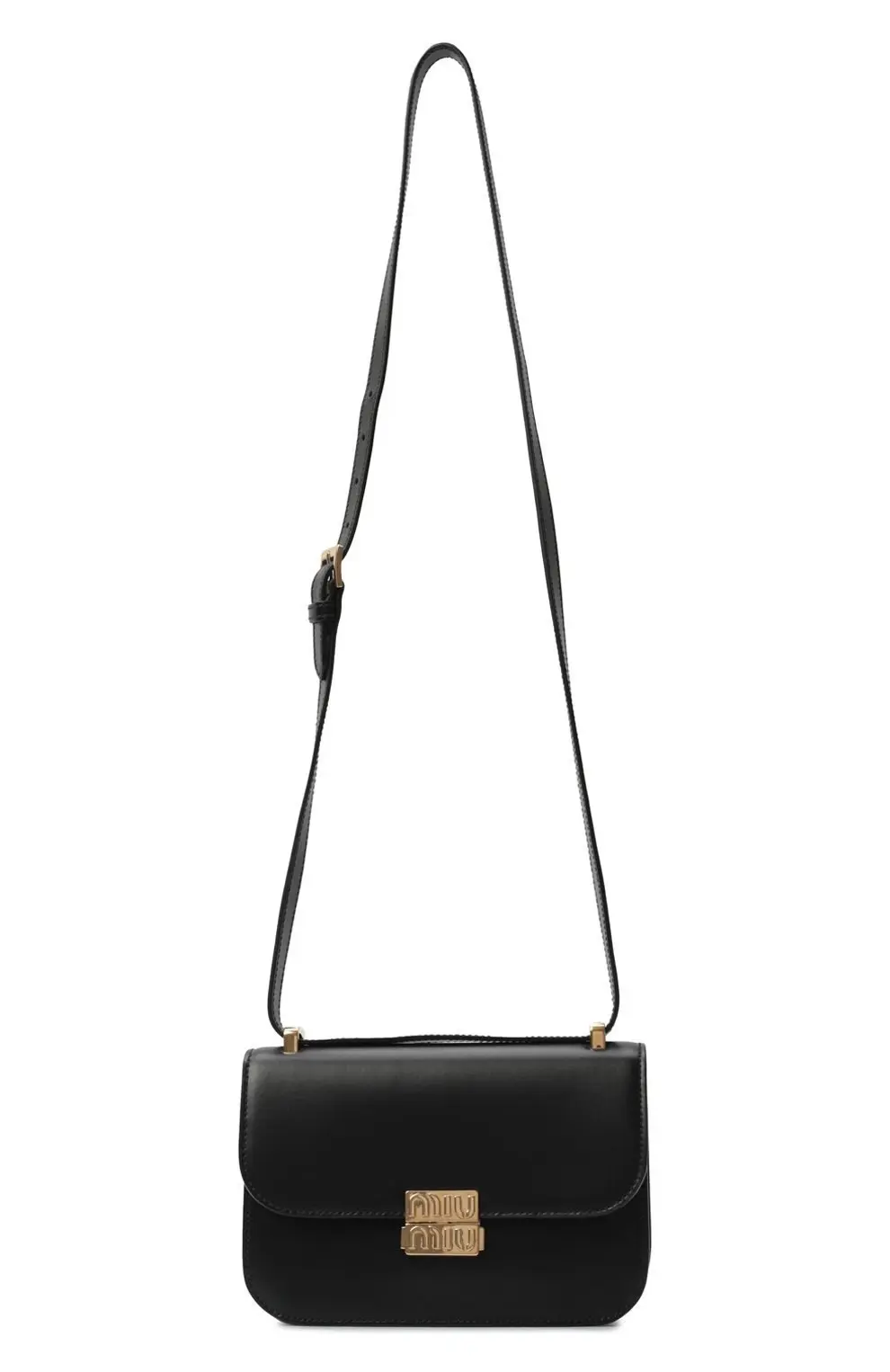 Элегантная чёрная сумка от Miu Miu выполнена из гладкой кожи и украшена фирменной золотистой пряжкой с тиснением логотипа бренда. Лаконичный дизайн делает её универсальным аксессуаром — она идеально дополнит как деловой образ, так и вечерний наряд.