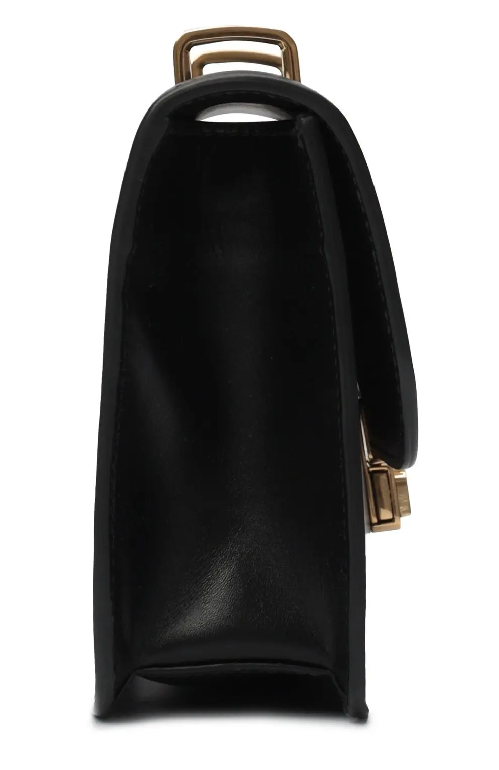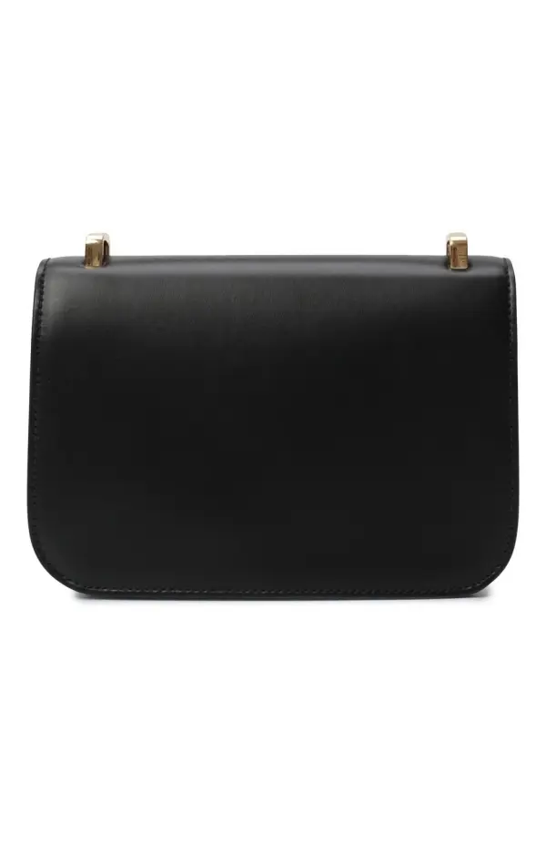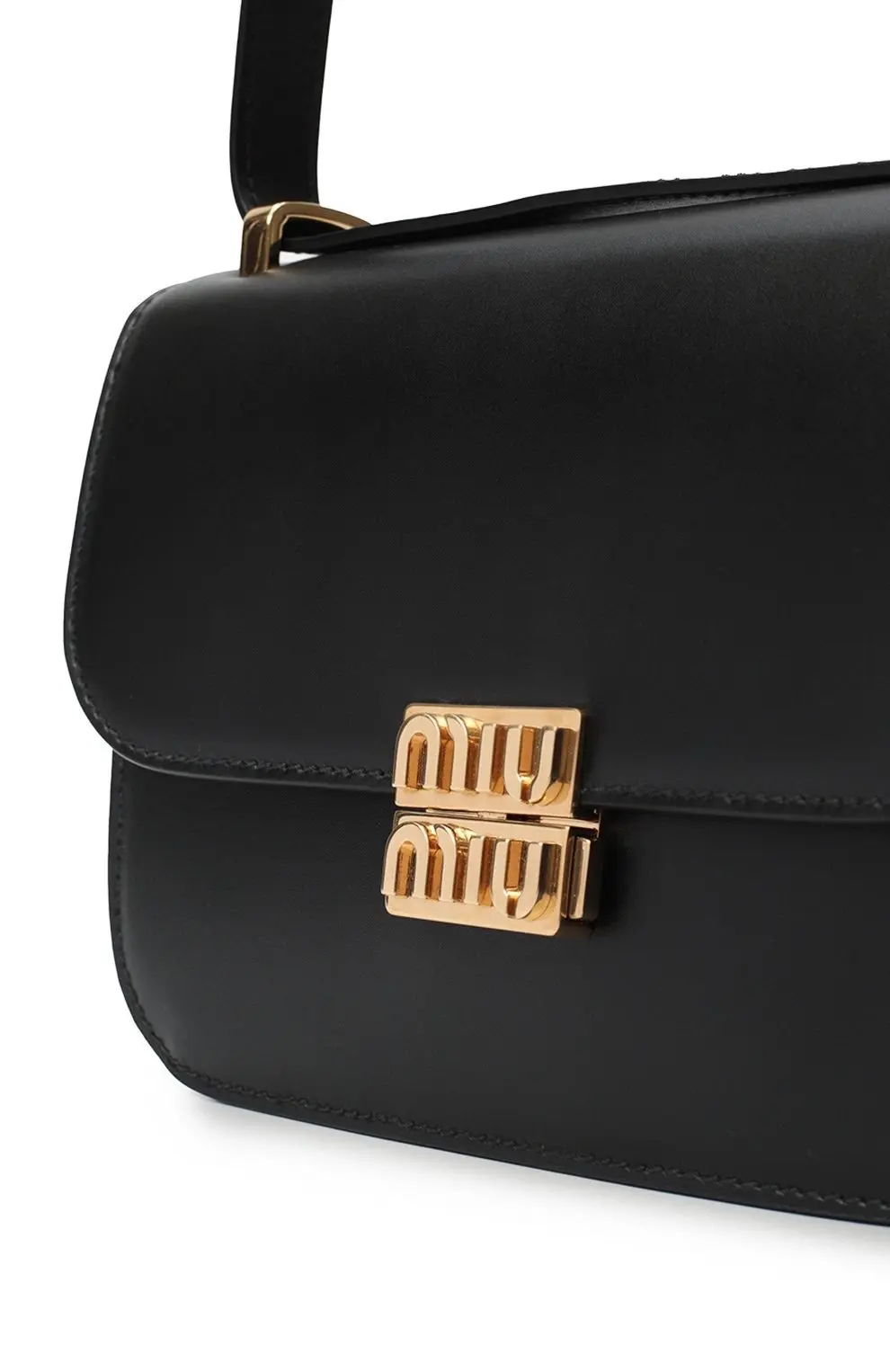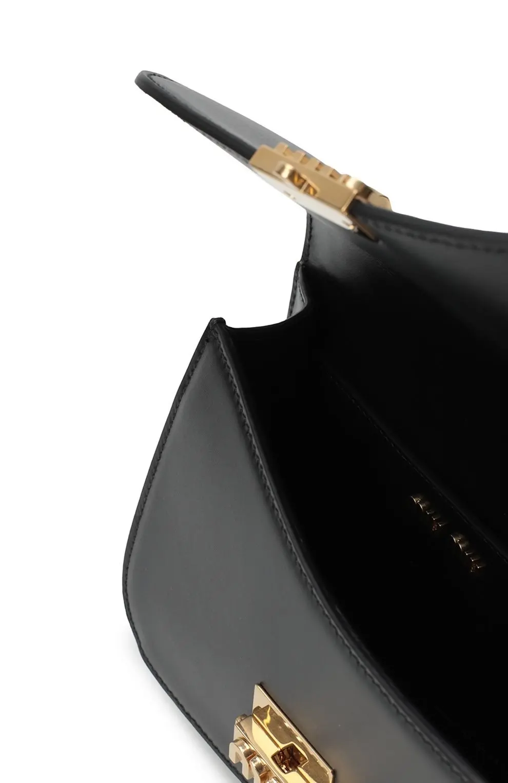 Элегантная чёрная сумка от Miu Miu выполнена из гладкой кожи и украшена фирменной золотистой пряжкой с тиснением логотипа бренда. Лаконичный дизайн делает её универсальным аксессуаром — она идеально дополнит как деловой образ, так и вечерний наряд.