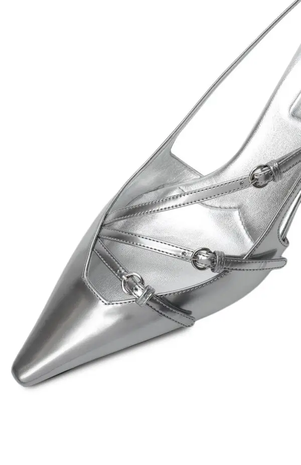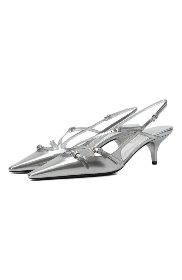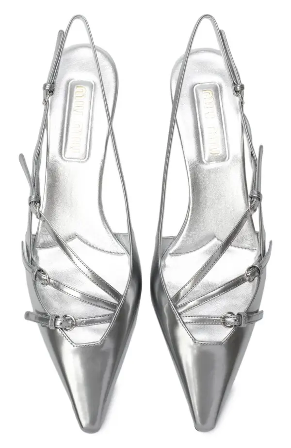 Туфли Miu Miu 055 в серебристом оттенке выполнены в футуристичном стиле. Модель имеет острый мыс и изящные ремешки с миниатюрными пряжками, которые создают утончённый акцент. Невысокий каблук-«kitten heel» придаёт обуви элегантность и комфорт, делая её идеальным выбором для вечерних образов.