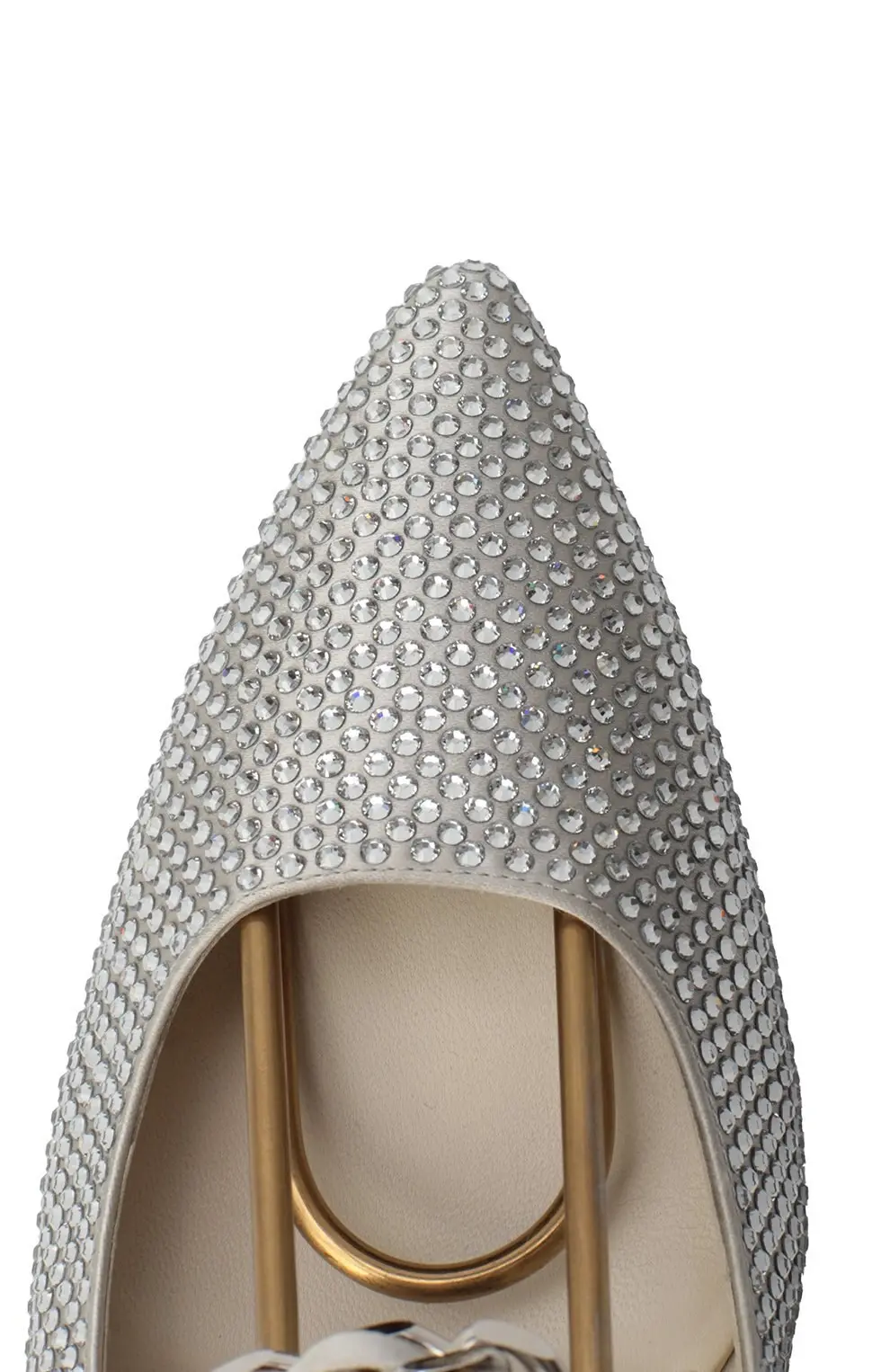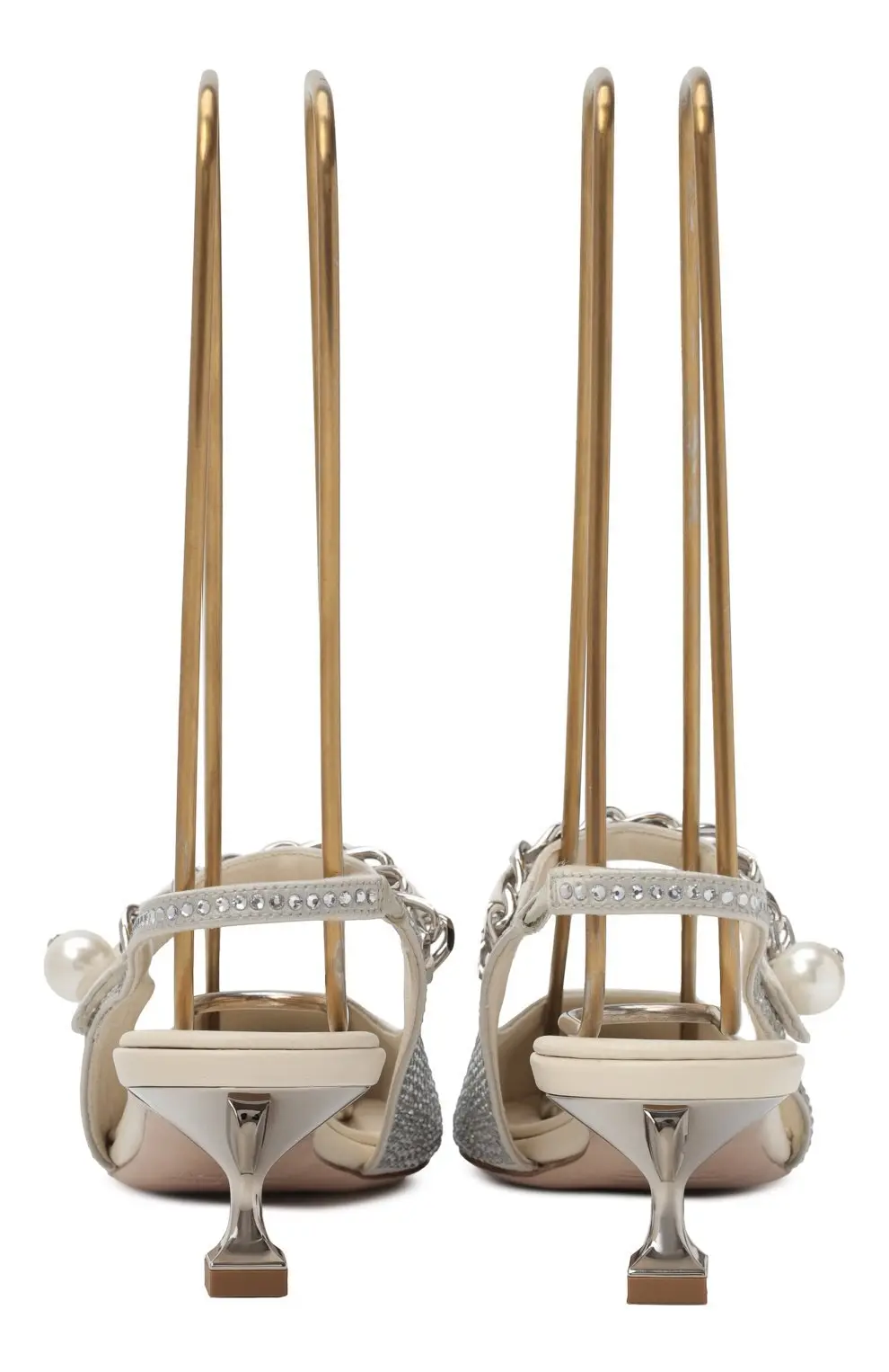 Туфли выполнены из блестящего текстиля, расшитого кристаллами, создающими эффект мягкого сияния. Изящный ремешок с металлическим звеном и декоративной жемчужиной подчёркивает женственность модели. Укороченный фигурный каблук завершает образ, добавляя элегантности и лёгкости.