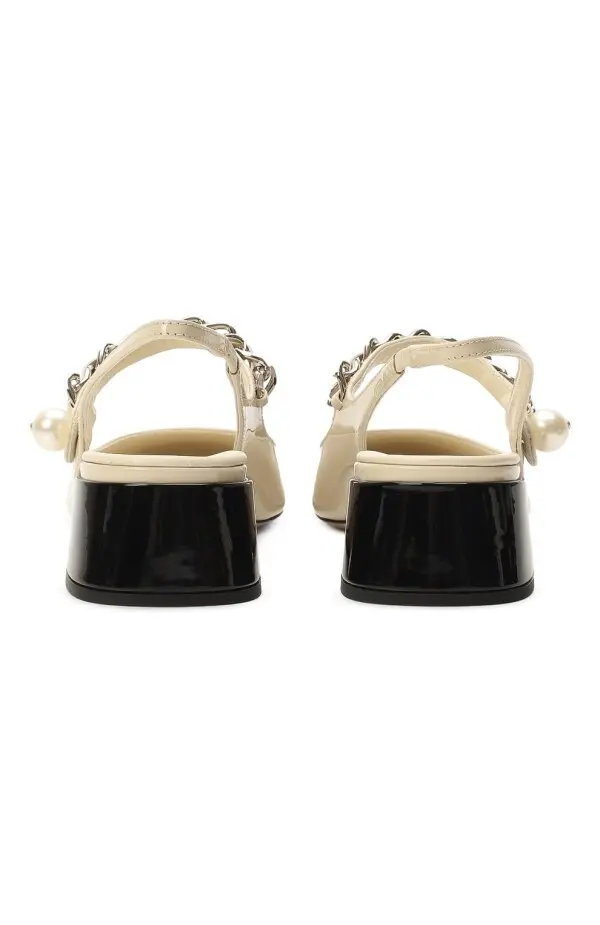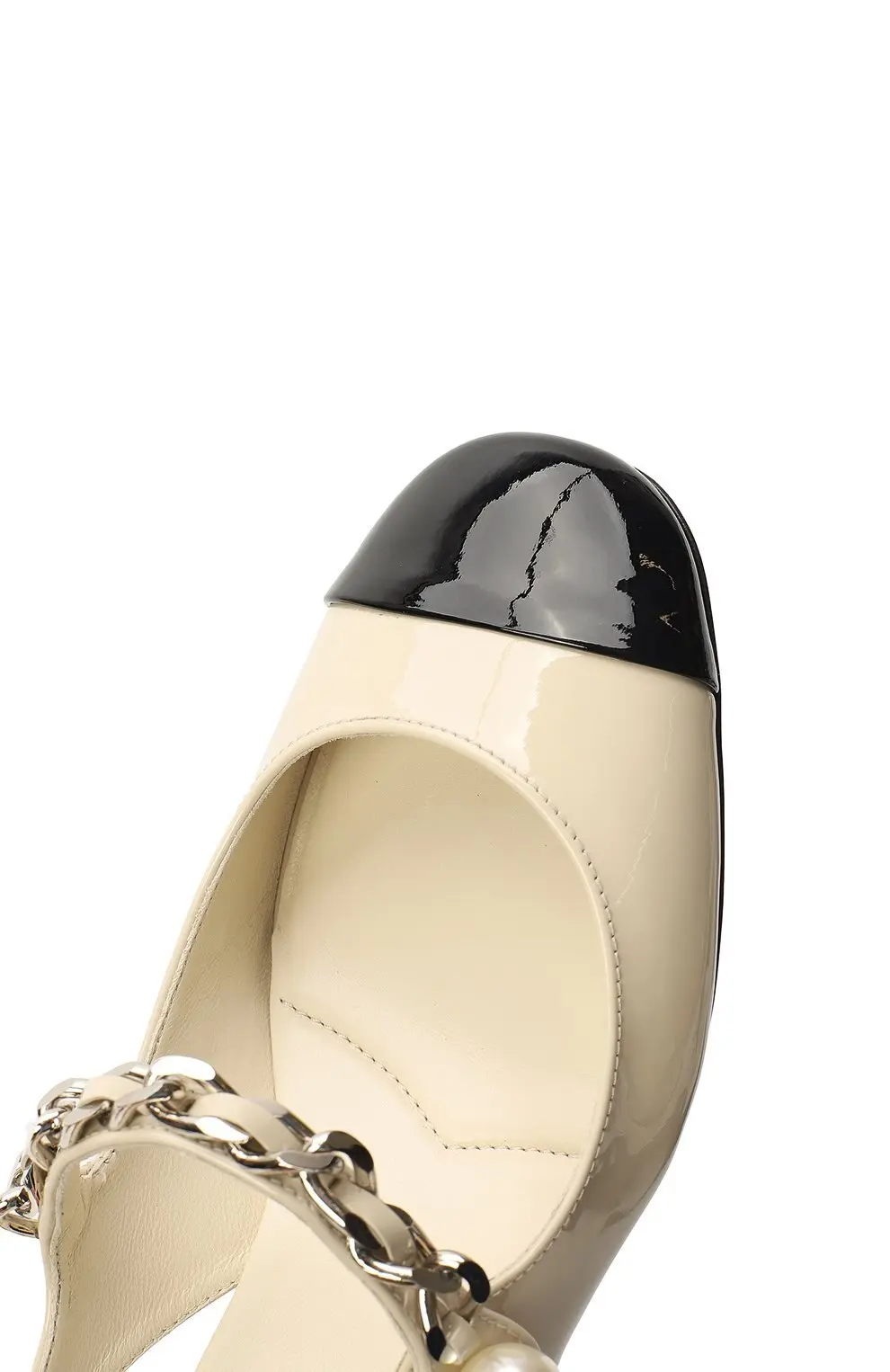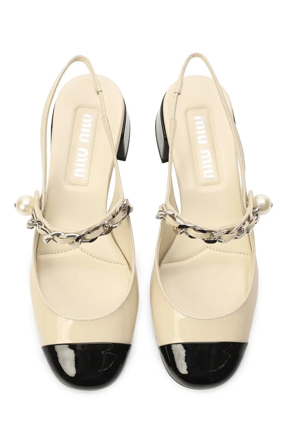 Туфли Miu Miu из лакированной кожи в бежевом цвете с контрастным чёрным мысом. Модель украшена ремешком-цепочкой с декоративной жемчужиной сбоку, что придаёт образу винтажное и женственное звучание. Удобный невысокий каблук обеспечивает комфорт, сохраняя при этом элегантность и изысканный стиль.