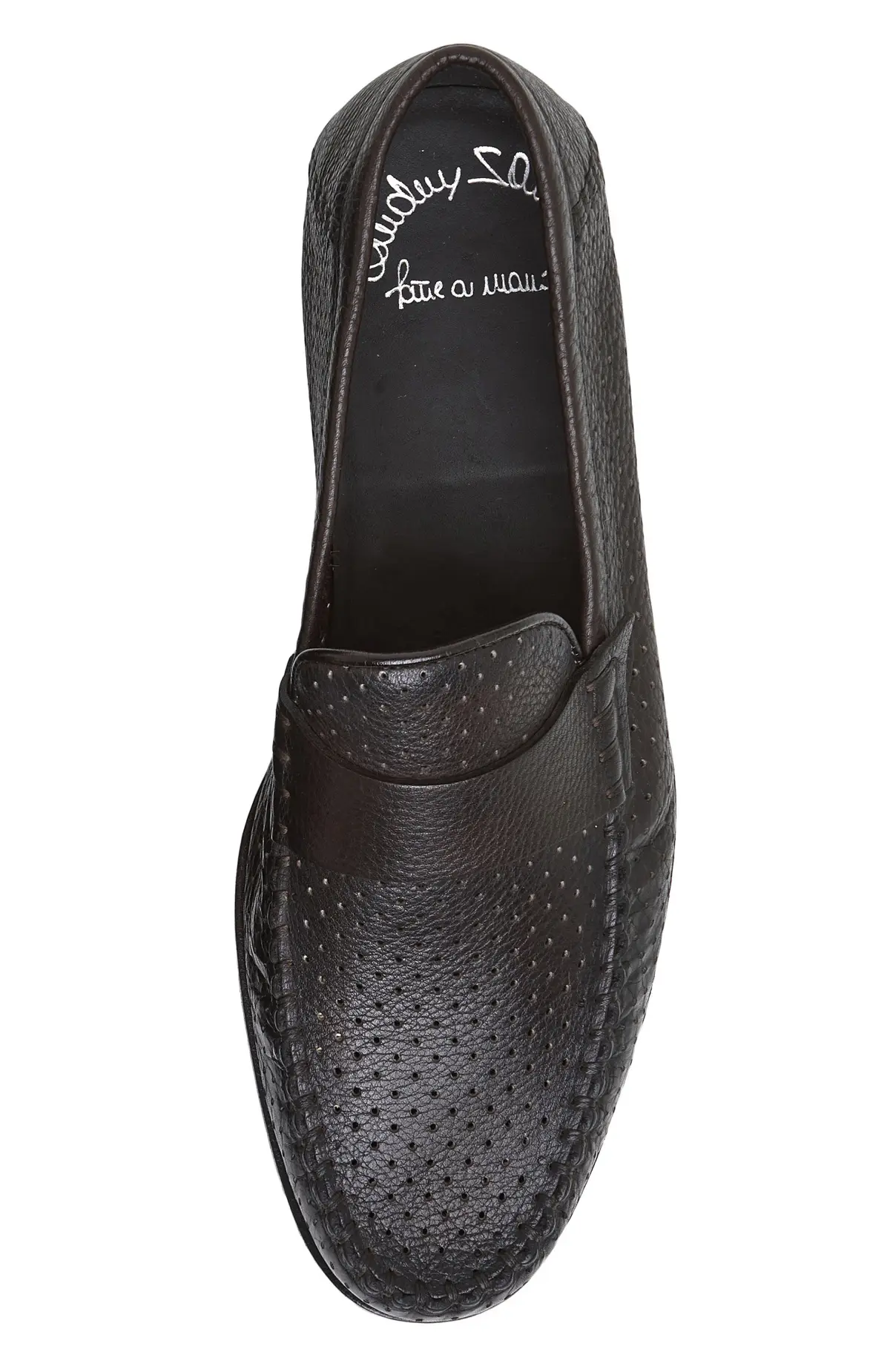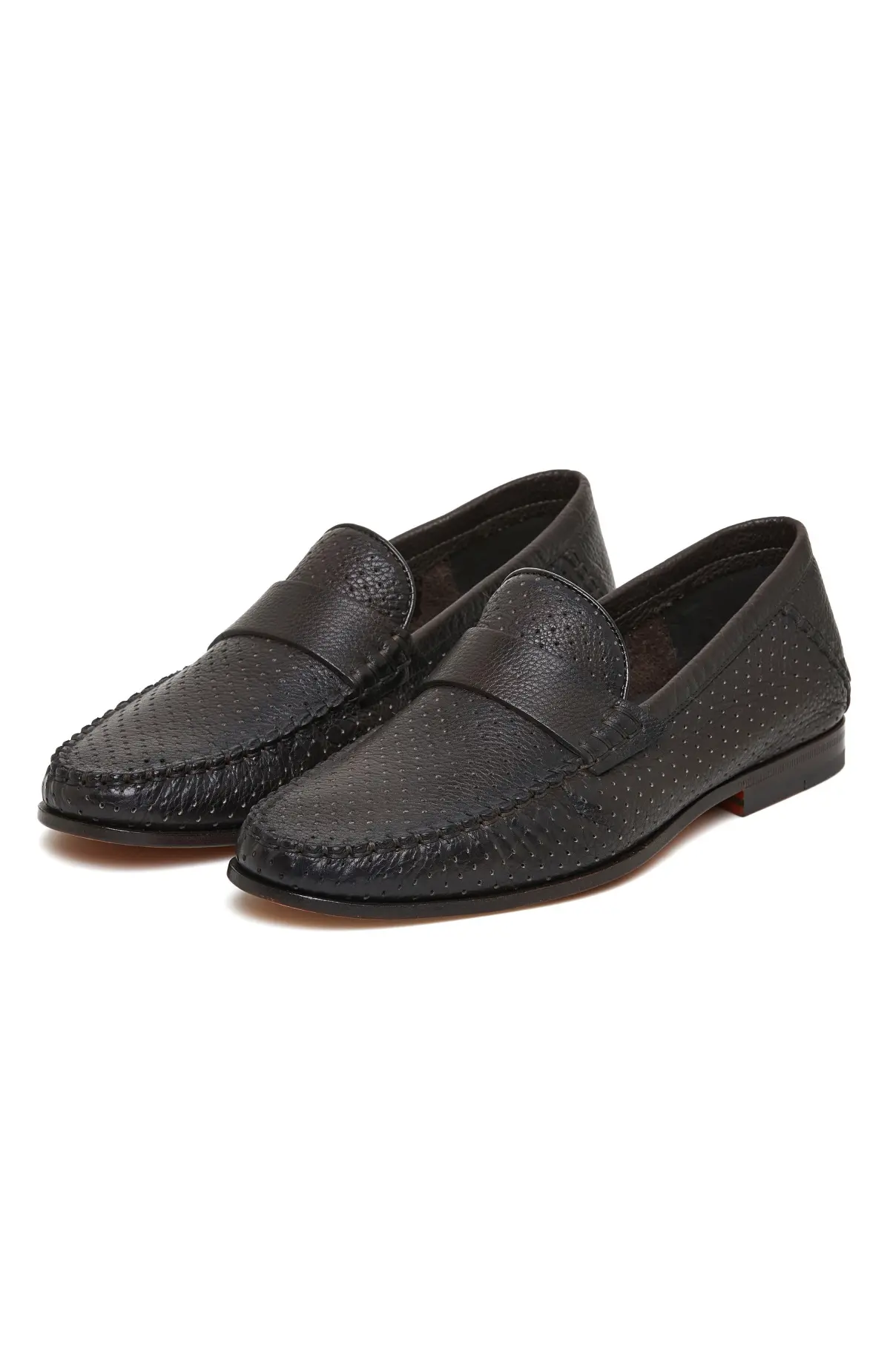 Мокасины выполнены из мягкой кожи с выразительным тиснением и ручной простёжкой по мыску. Классическая перемычка подчёркивает элегантный силуэт, тонкая подошва с аккуратным рантом смотрится лаконично. Внутренняя отделка из кожи обеспечивает комфортное прилегание в течение дня.