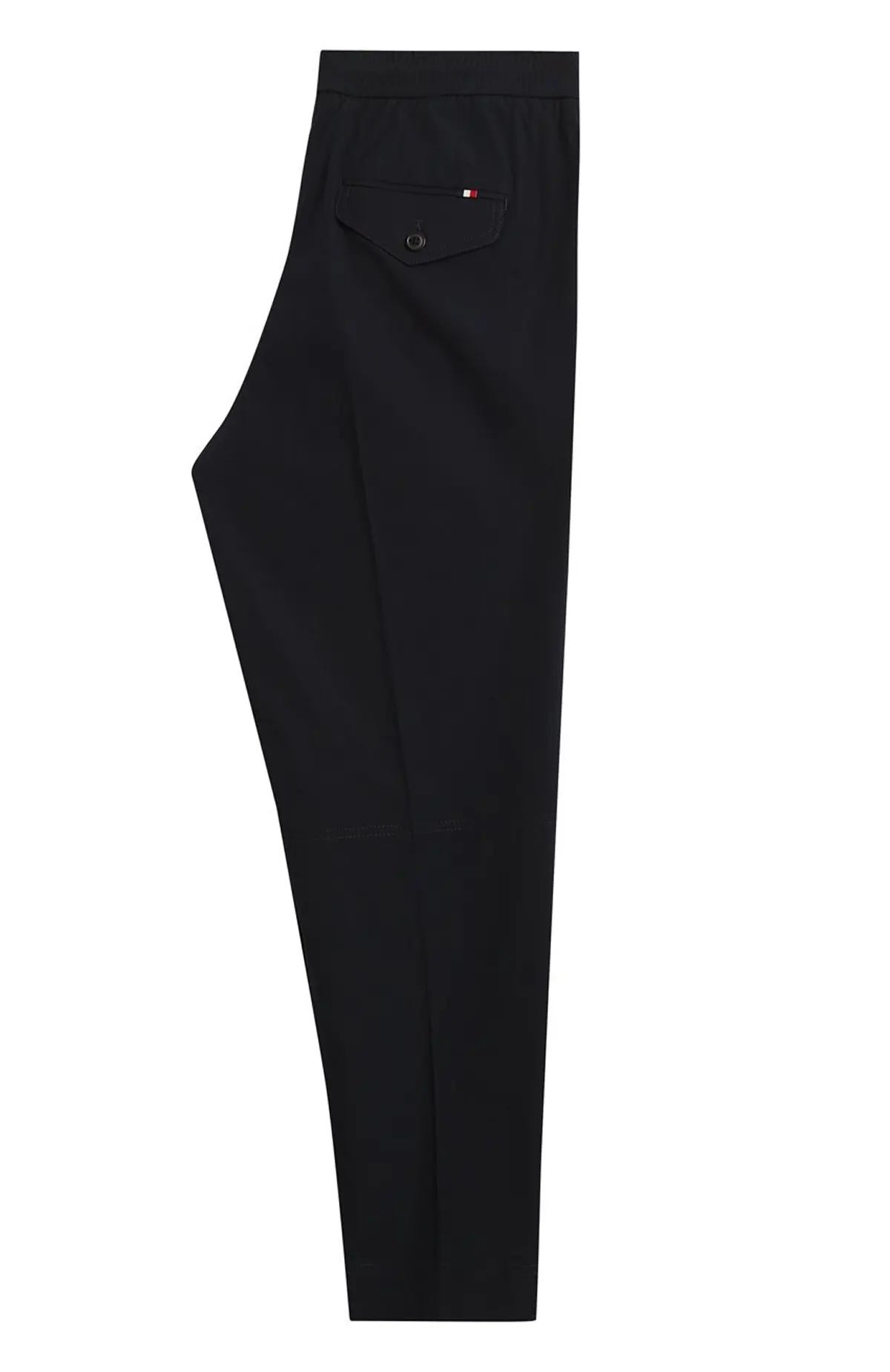 Хлопковые брюки Moncler выполнены из мягкого и прочного хлопка с добавлением эластана для комфорта и свободы движений. Модель прямого кроя с эластичным поясом и регулируемым шнурком сочетает спортивный стиль с элегантной лаконичностью. Универсальный тёмно-синий оттенок делает их подходящими как для повседневных, так и для путешествий или smart-casual образов.
