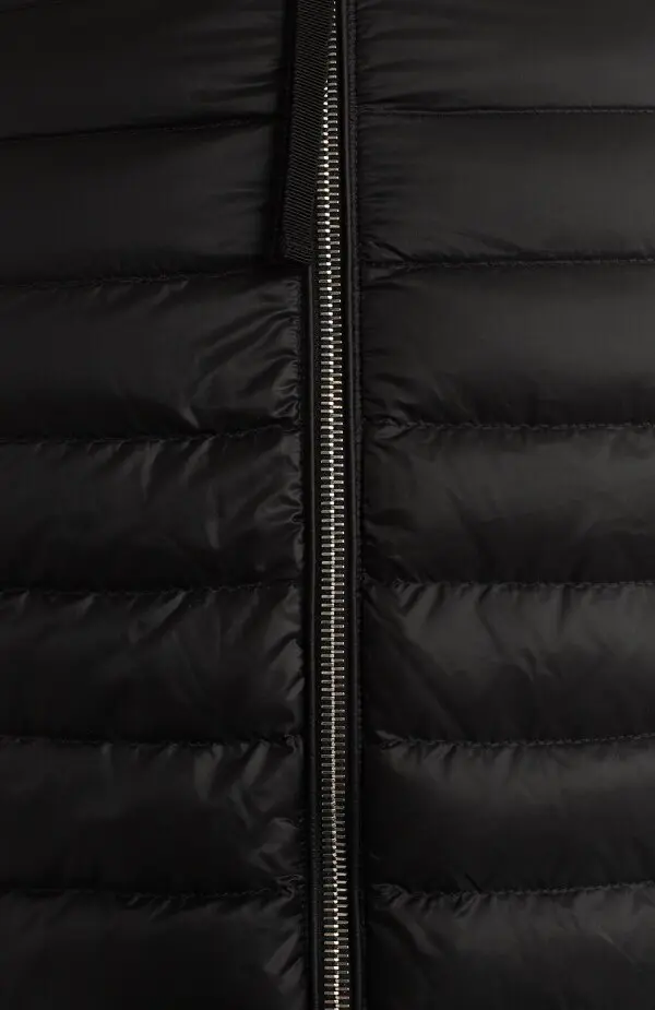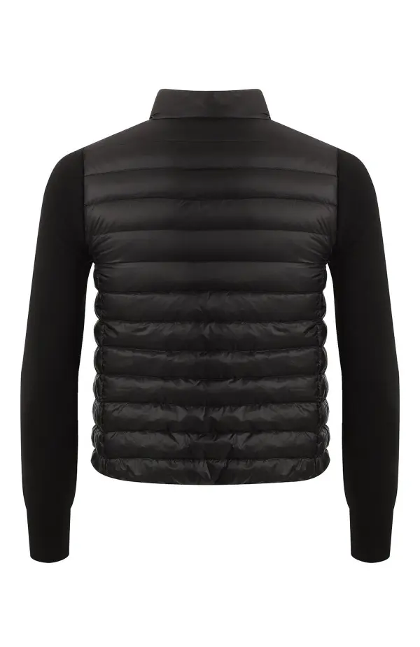 Легкая комбинированная куртка с пуховым стеганым корпусом из гладкого нейлона и трикотажными рукавами обеспечивает комфортное тепло без лишнего объема. Прямой силуэт с высоким воротником и застежкой на молнию подойдет как для самостоятельной носки, так и в качестве утепляющего слоя под верхнюю одежду. Лаконичный черный цвет делает модель универсальной для городских образов.
