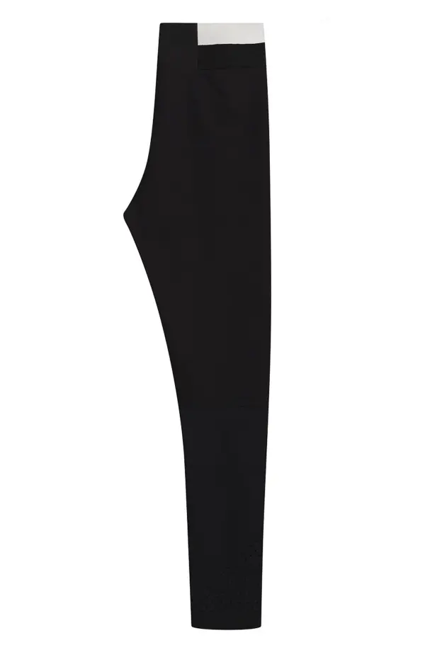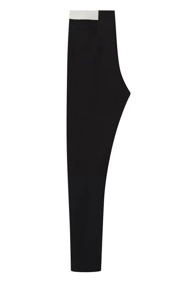 Легинсы Moncler черного цвета с эластичным поясом, украшенным контрастным логотипом бренда. Изделие выполнено из плотного эластичного материала с перфорацией и глянцевыми вставками, что подчеркивает спортивный стиль и современный силуэт.