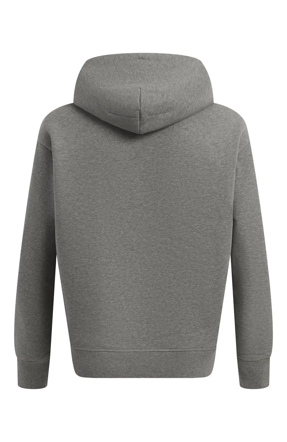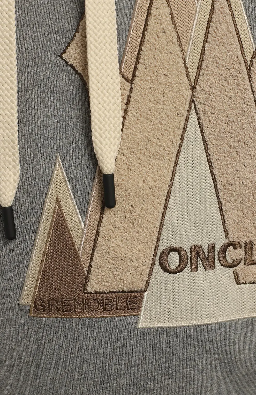 Худи Moncler из хлопка в сером цвете. Модель с капюшоном на шнурках и эластичными манжетами, украшена крупным декоративным принтом-нашивкой с логотипом бренда и горной символикой в бежево-коричневой гамме. Стильный и комфортный вариант для повседневного образа.