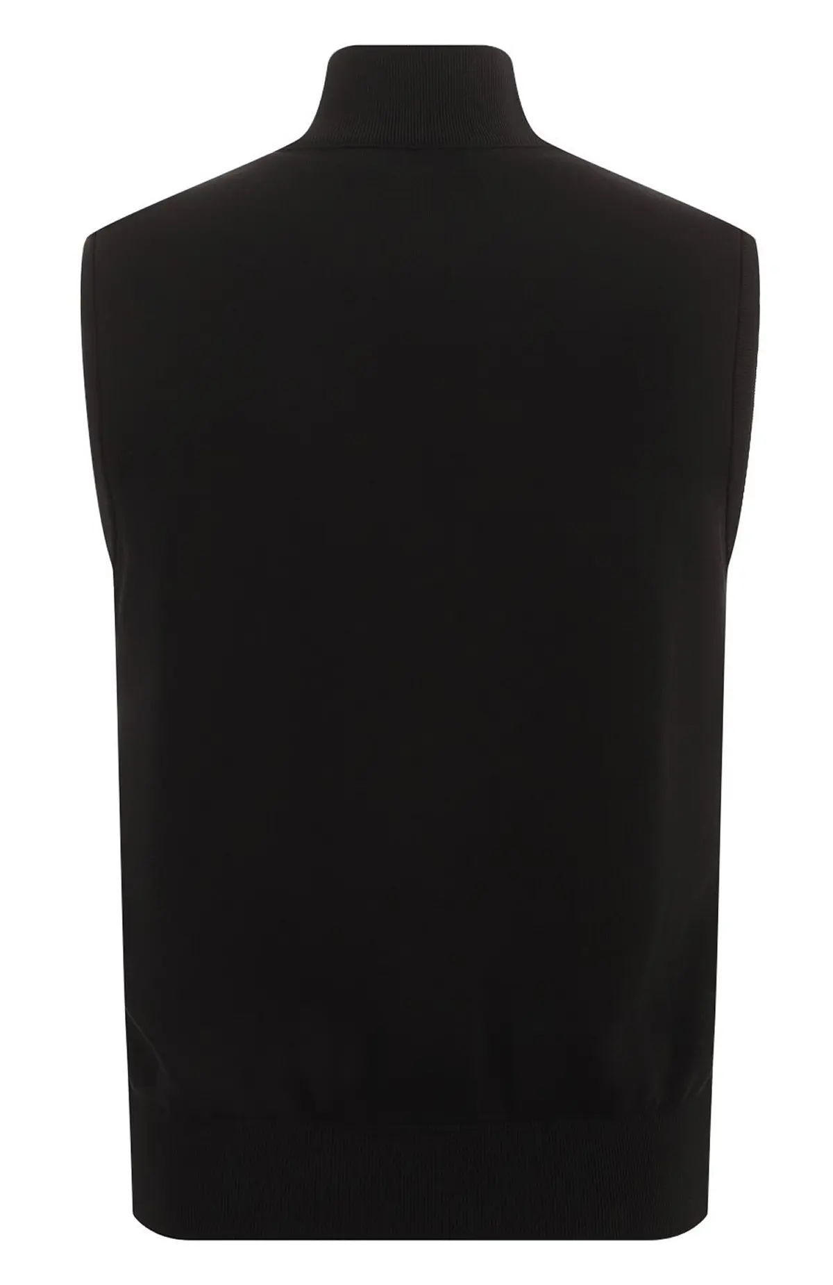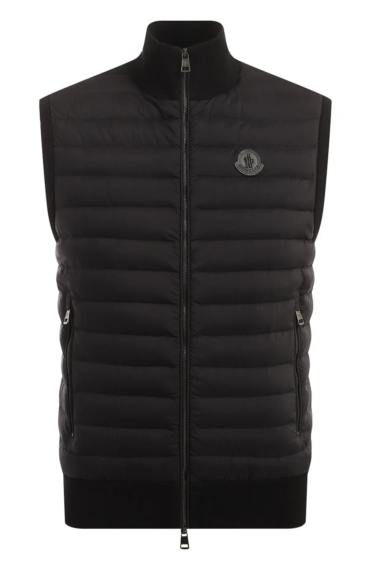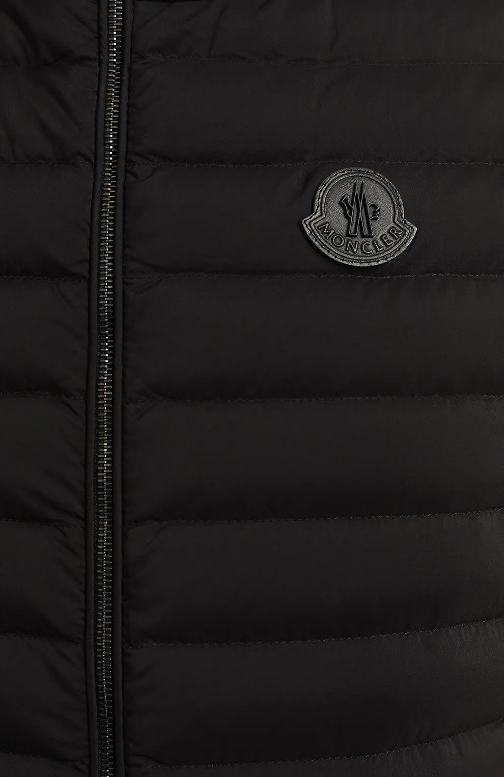 Пуховый жилет Moncler выполнен из лёгкого матового нейлона чёрного цвета и наполнен натуральным пухом, что обеспечивает оптимальное тепло без утяжеления. Модель имеет прямой силуэт, высокий воротник и застёжку-молнию с двух сторон. Эластичные вставки по бокам и фирменный логотип на груди придают образу спортивную элегантность, характерную для бренда.