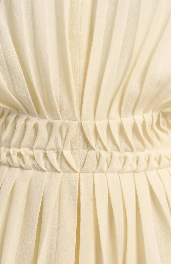 Шерстяное платье Nina Ricci выполнено из мягкой тонкой шерсти светлого оттенка ванили. Модель отличается изящными драпировками на лифе и мелкими складками по всей длине юбки, создающими эффект лёгкости и движения. Завышенная талия подчеркнута декоративным плетёным поясом, визуально формирующим силуэт «песочные часы». Платье сочетает элегантность и комфорт, идеально подходя для дневных выходов и вечерних событий, когда требуется сдержанная женственность и утончённый стиль.