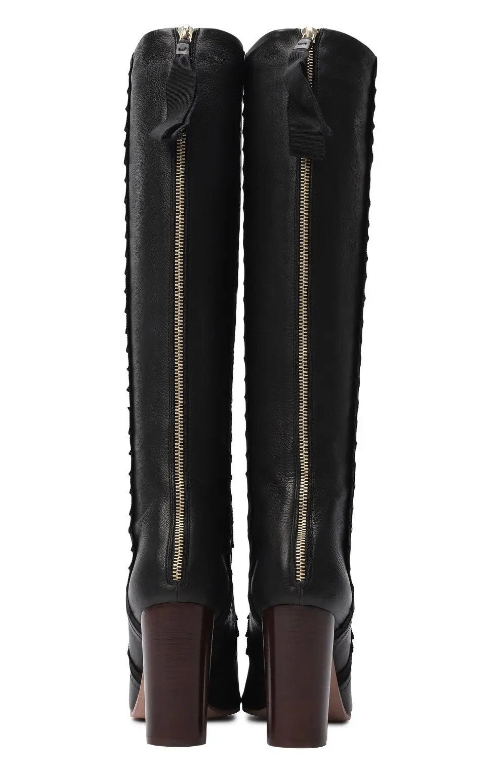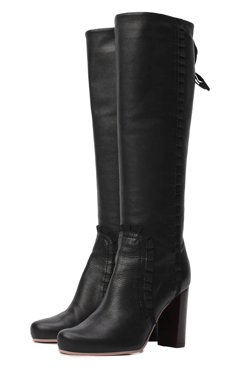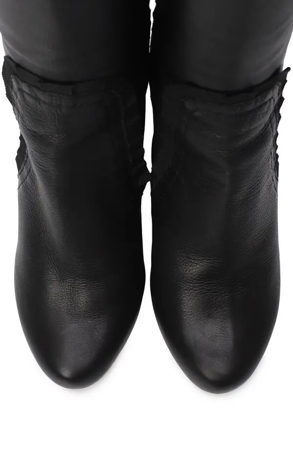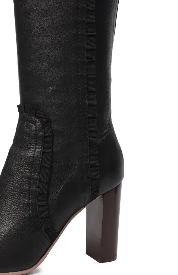 Эти сапоги Nina Ricci выполнены из чёрной кожи с естественной текстурой, что придаёт модели благородный и элегантный вид. Декоративные рюши вдоль голенища добавляют женственности, а высокий устойчивый каблук подчёркивает изящество силуэта. Практичные и стильные, они идеально подойдут для создания утончённых повседневных и вечерних образов.