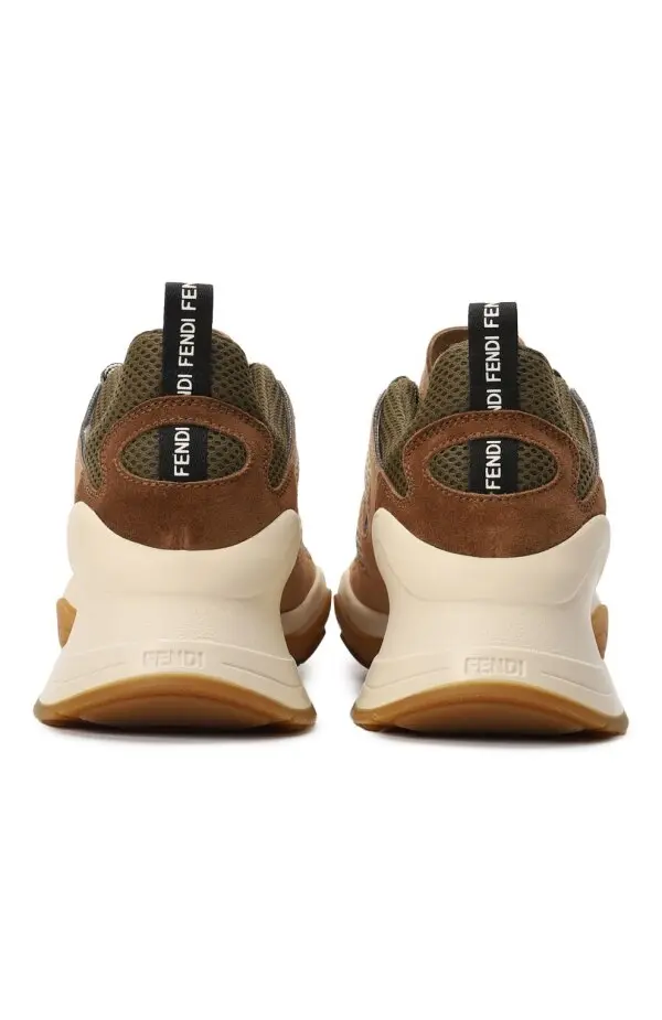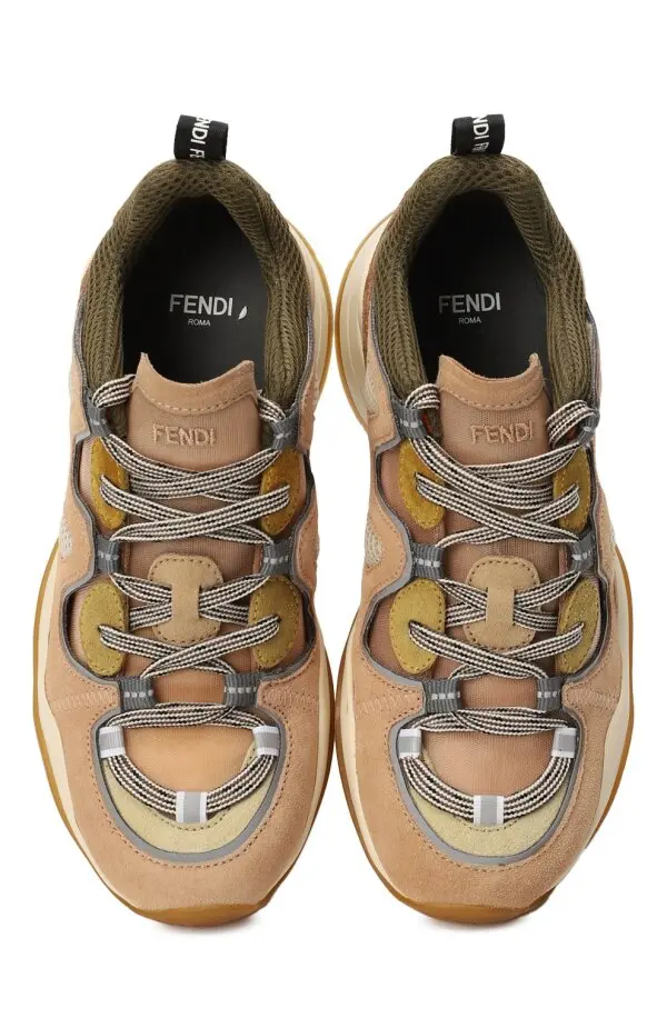 Кроссовки FFluid Fendi в бежево-коричневых тонах сочетают замшу, текстиль и сетчатые вставки, создавая стильный спортивный образ. Объёмная рифлёная подошва и контрастная шнуровка обеспечивают комфорт и динамику, а логотип Fendi завершает современный дизайн.