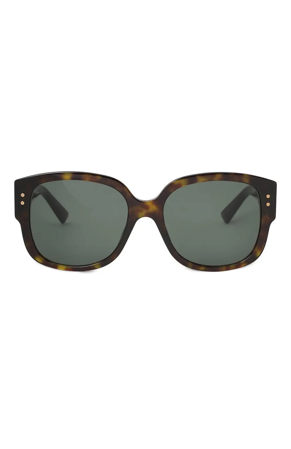 Солнцезащитные очки Dior в оправе из ацетата цвета «тёмный черепах». Углы декорированы золотистыми заклёпками и логотипом DIOR, что придаёт модели утончённый винтажный акцент.