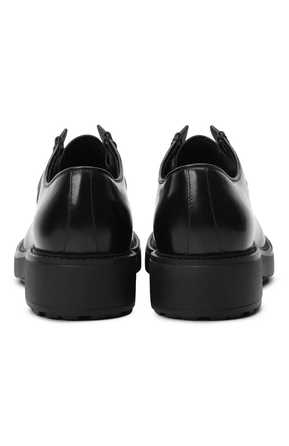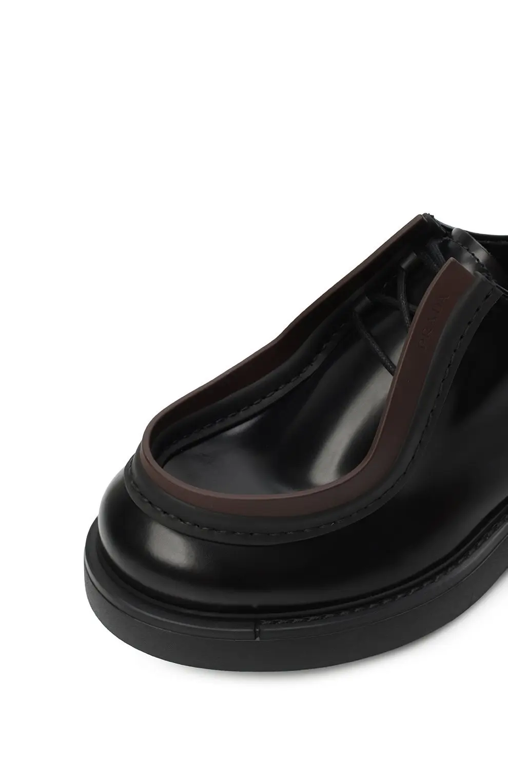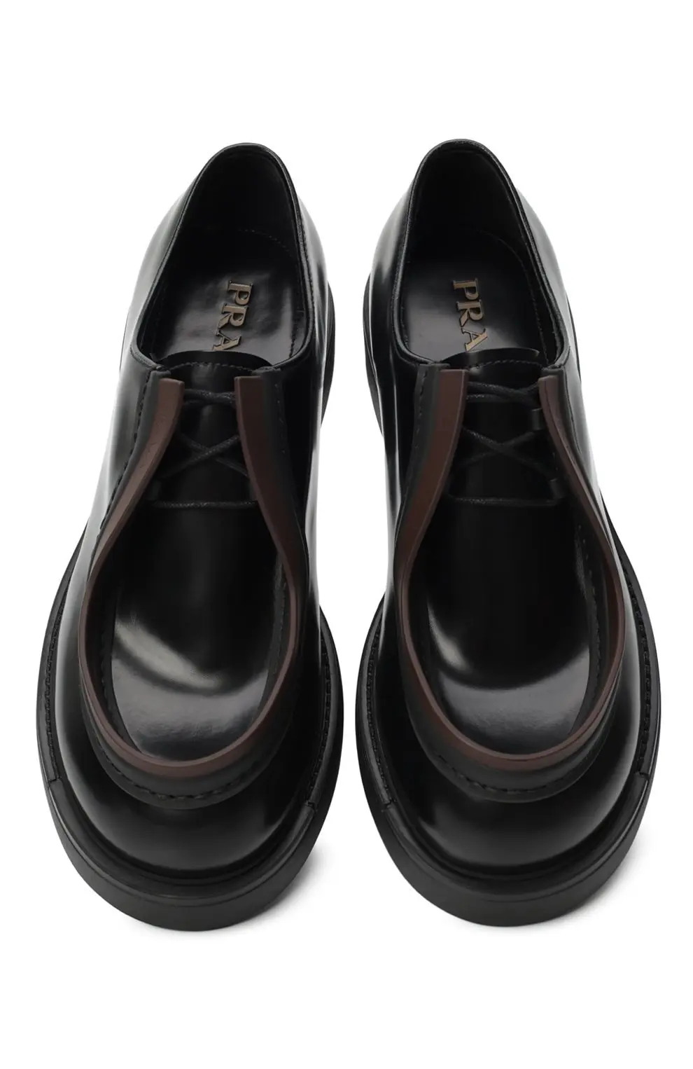 Ботинки Prada Diapason из черной полированной кожи с акцентной окантовкой шоколадного цвета. Массивная подошва придает модели современный характер и обеспечивает комфорт при носке.
