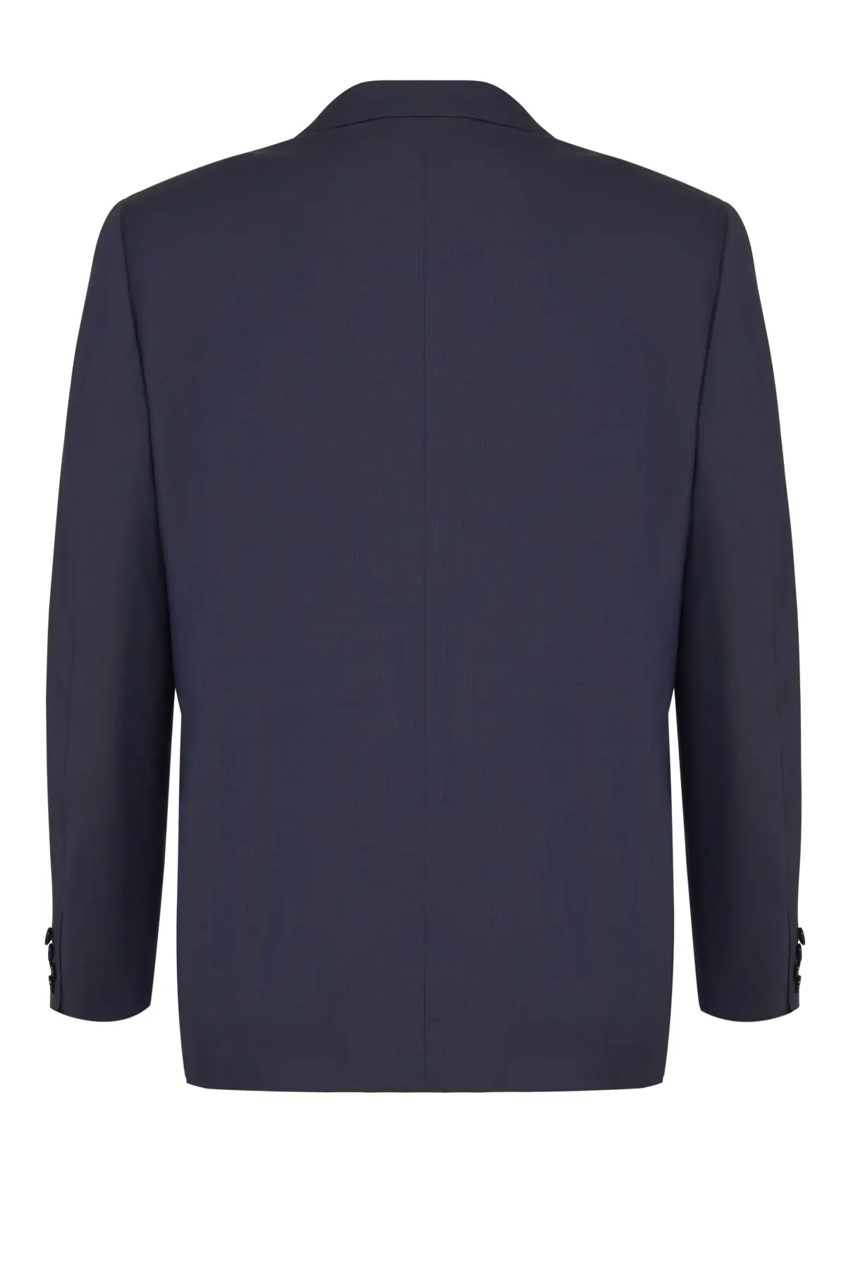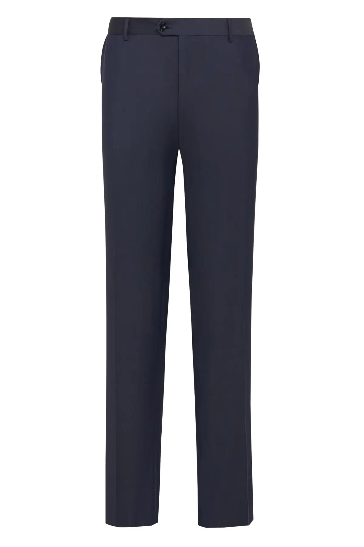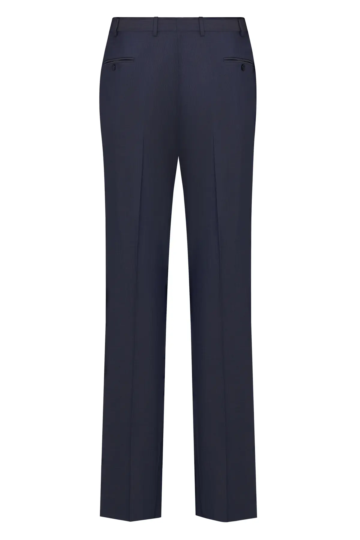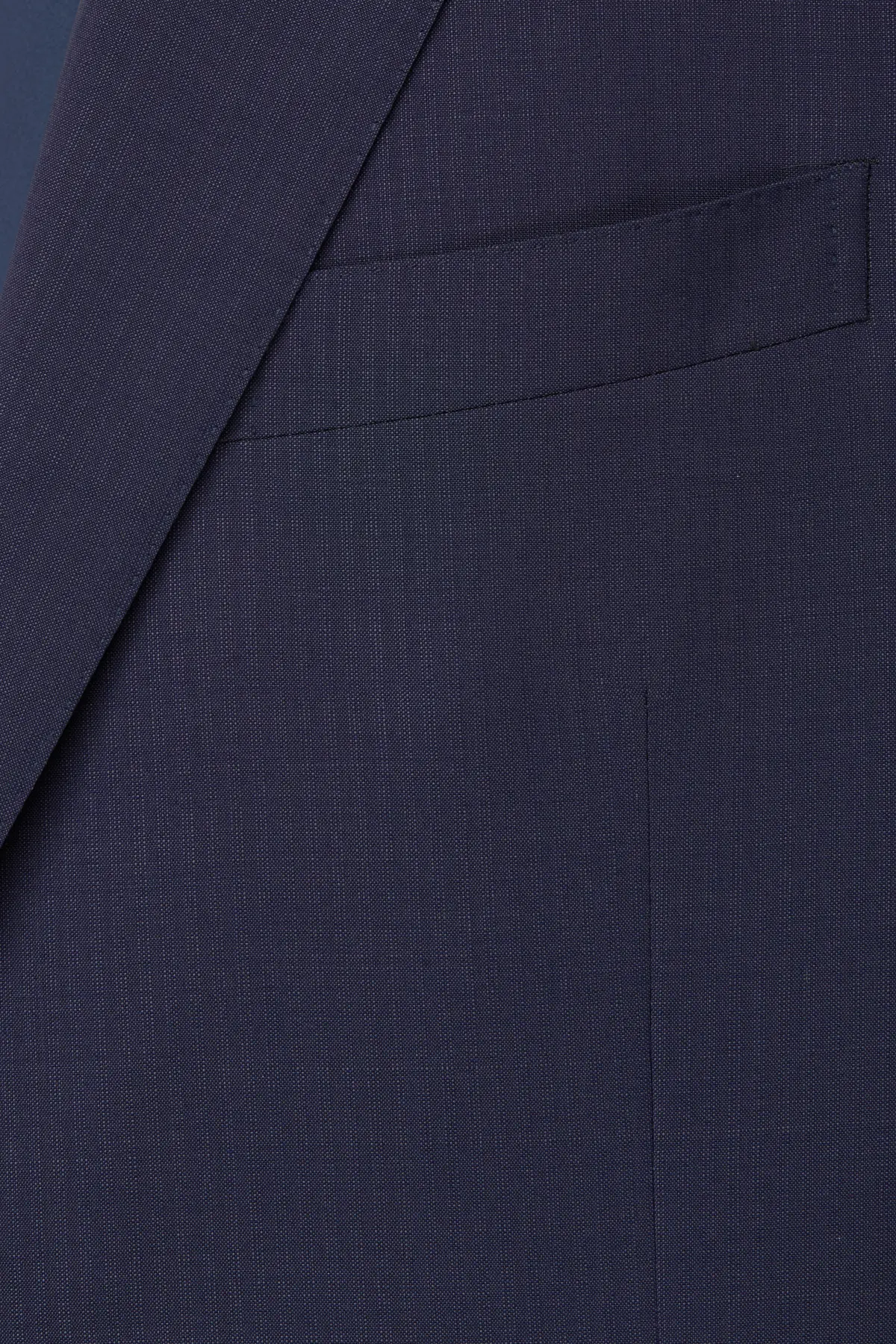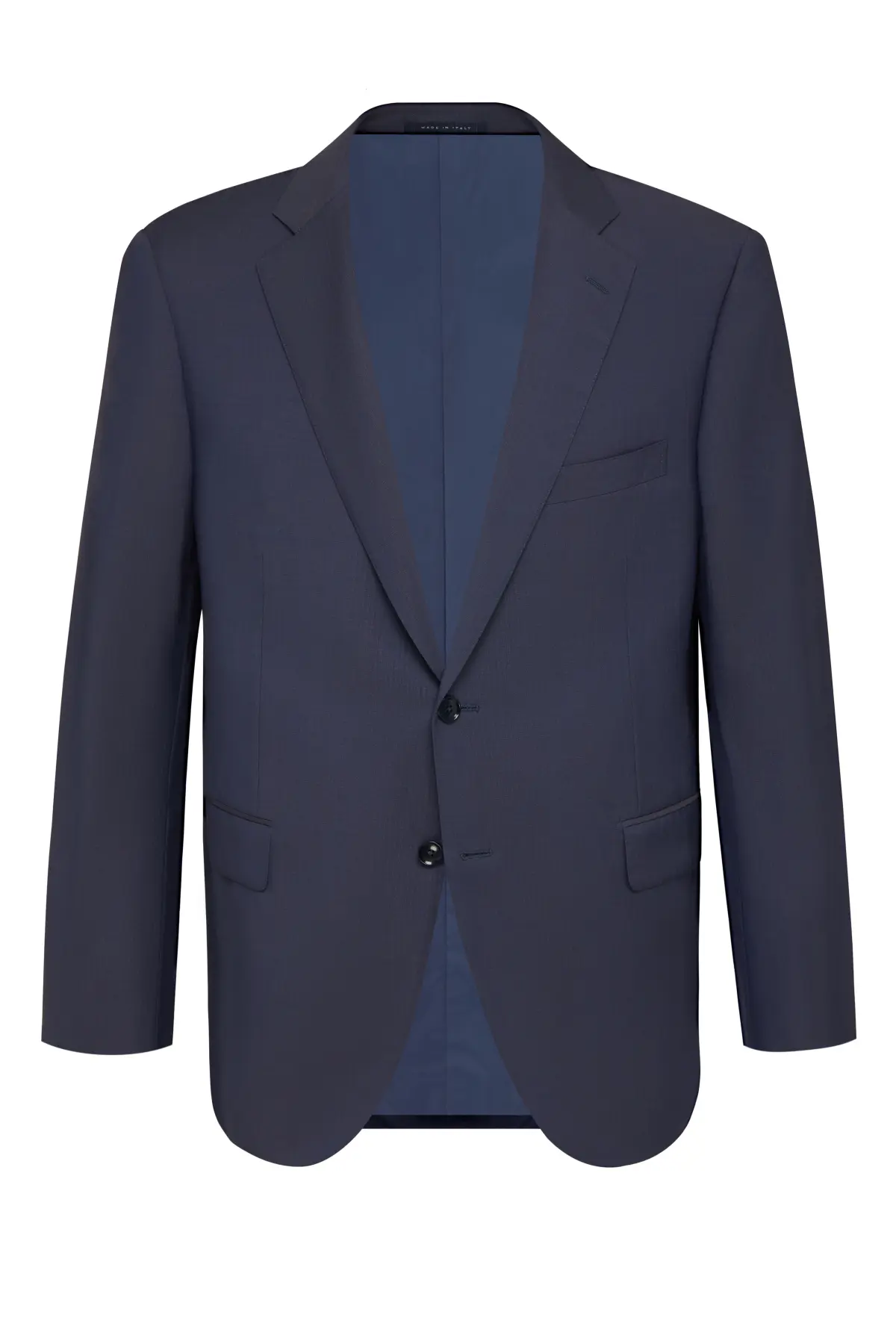 Однобортный костюм глубокого синего оттенка, выполненный из тонкой шерсти с гладкой фактурой. Пиджак на две пуговицы с классическими лацканами и карманами с клапанами подчёркивает строгие линии силуэта. Брюки прямого кроя со стрелками визуально вытягивают силуэт и легко сочетаются с классическими дерби или оксфордами. Универсальная модель для деловых встреч, официальных мероприятий и повседневного офисного гардероба.
