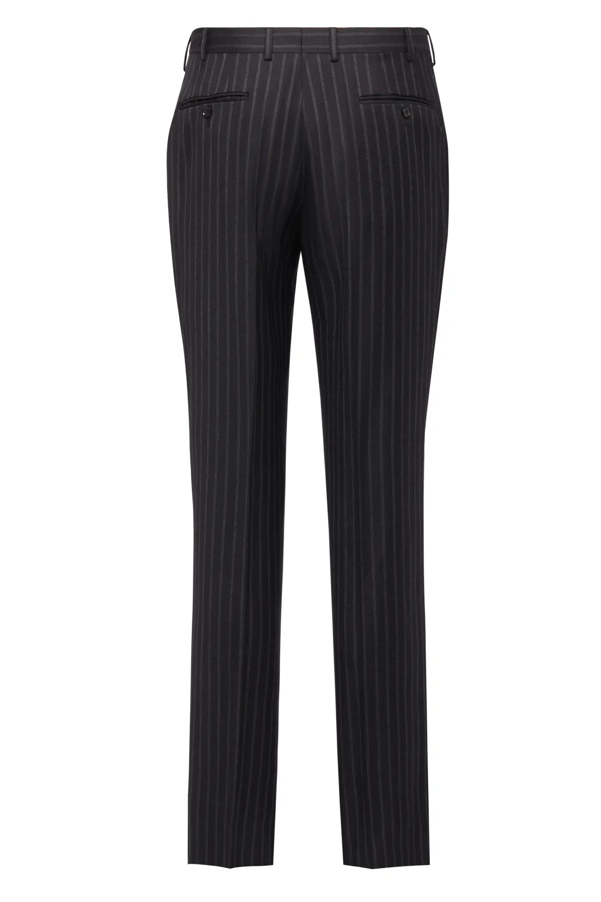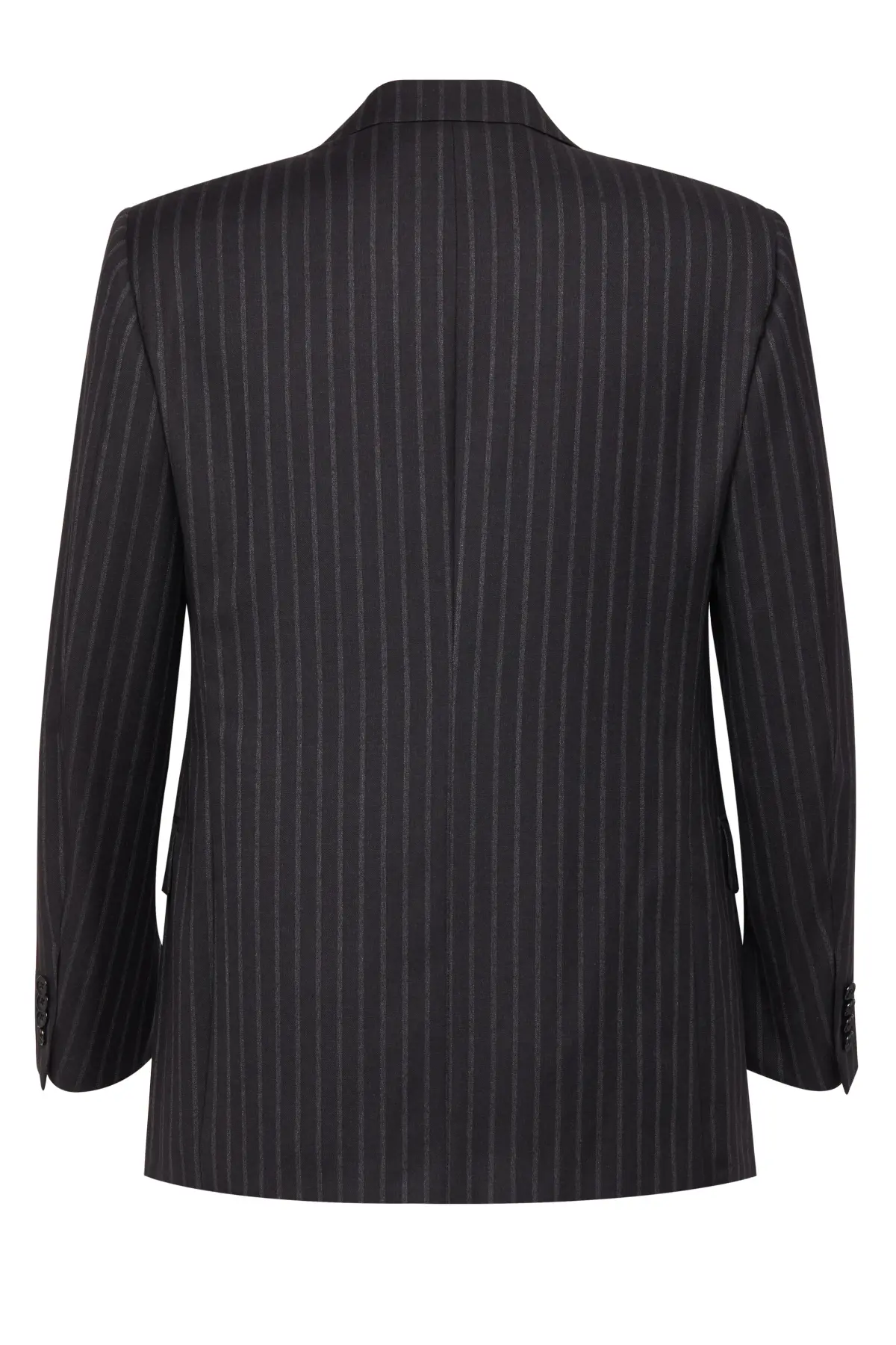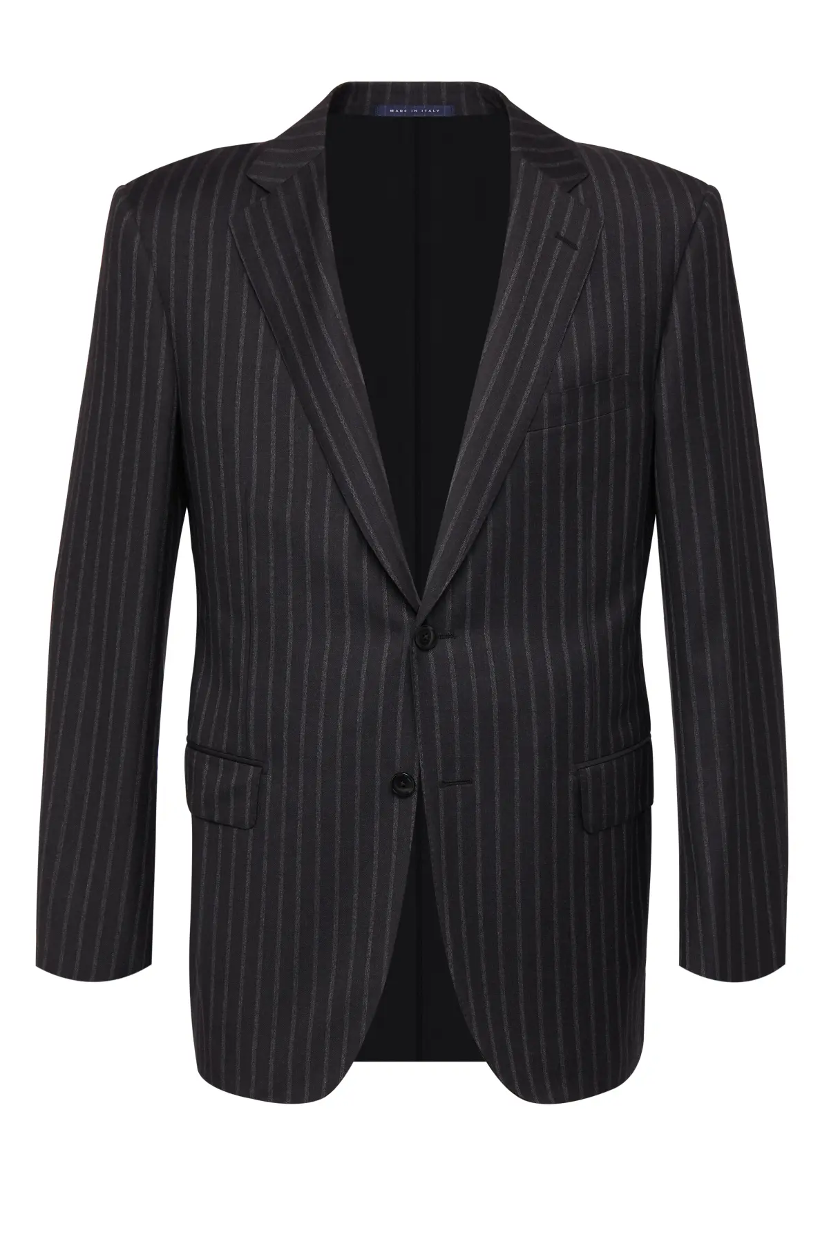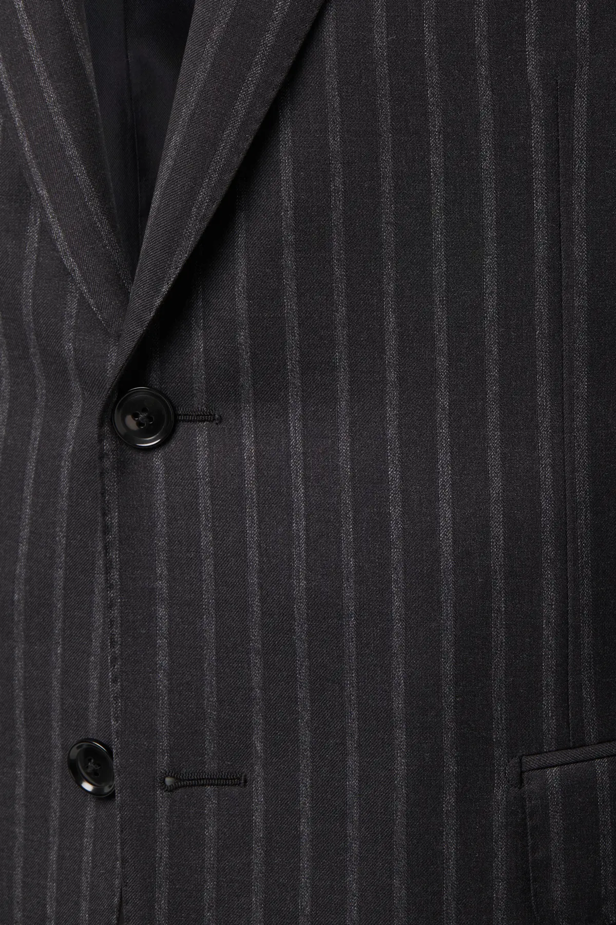 Строгий костюм в темно-серой гамме с выразительной мелкой полоской. Однобортный пиджак на две пуговицы с классическими лацканами и карманами с клапанами дополнен прямыми брюками со стрелками, формируя вытянутый силуэт. Универсальное решение для деловых встреч, официальных мероприятий и дресс-кода в консервативном офисе.
