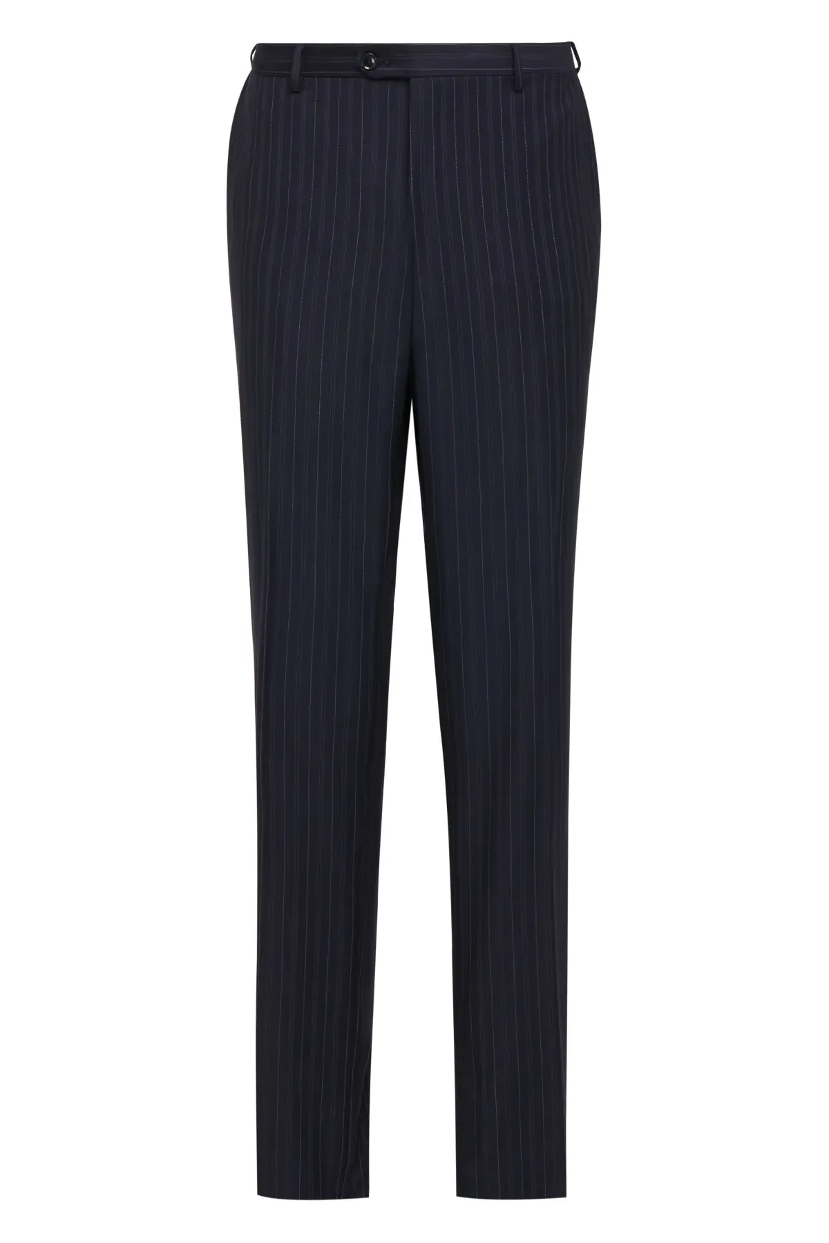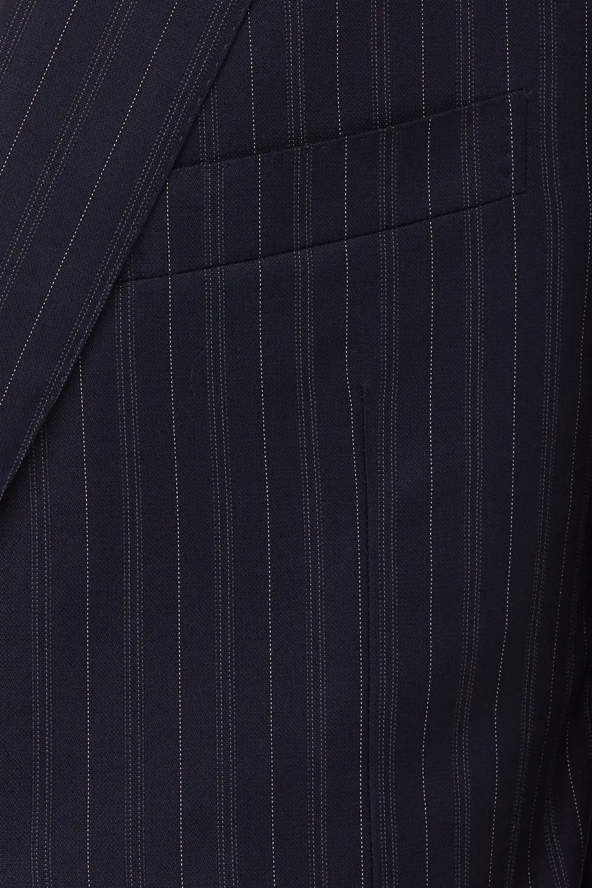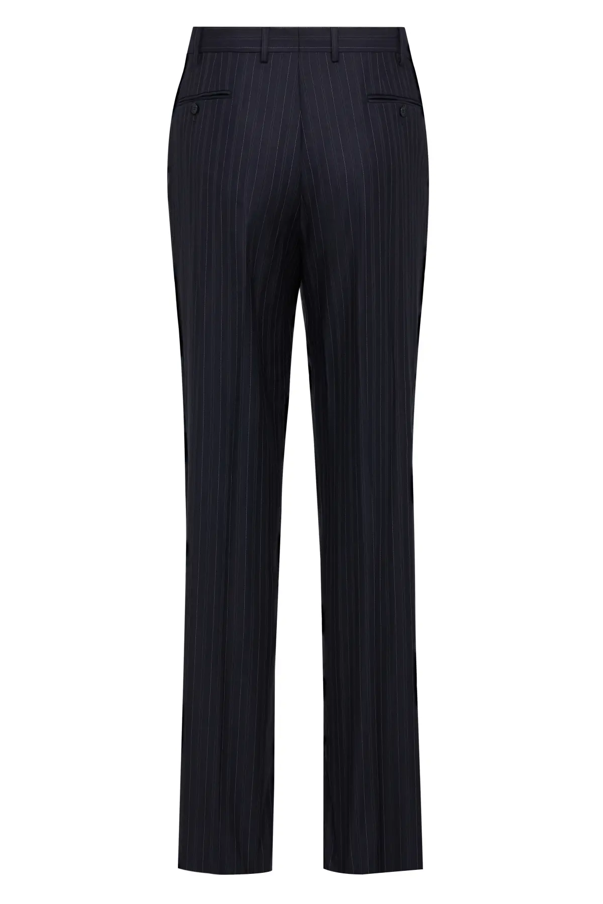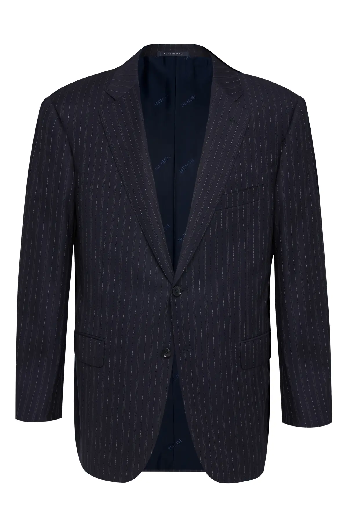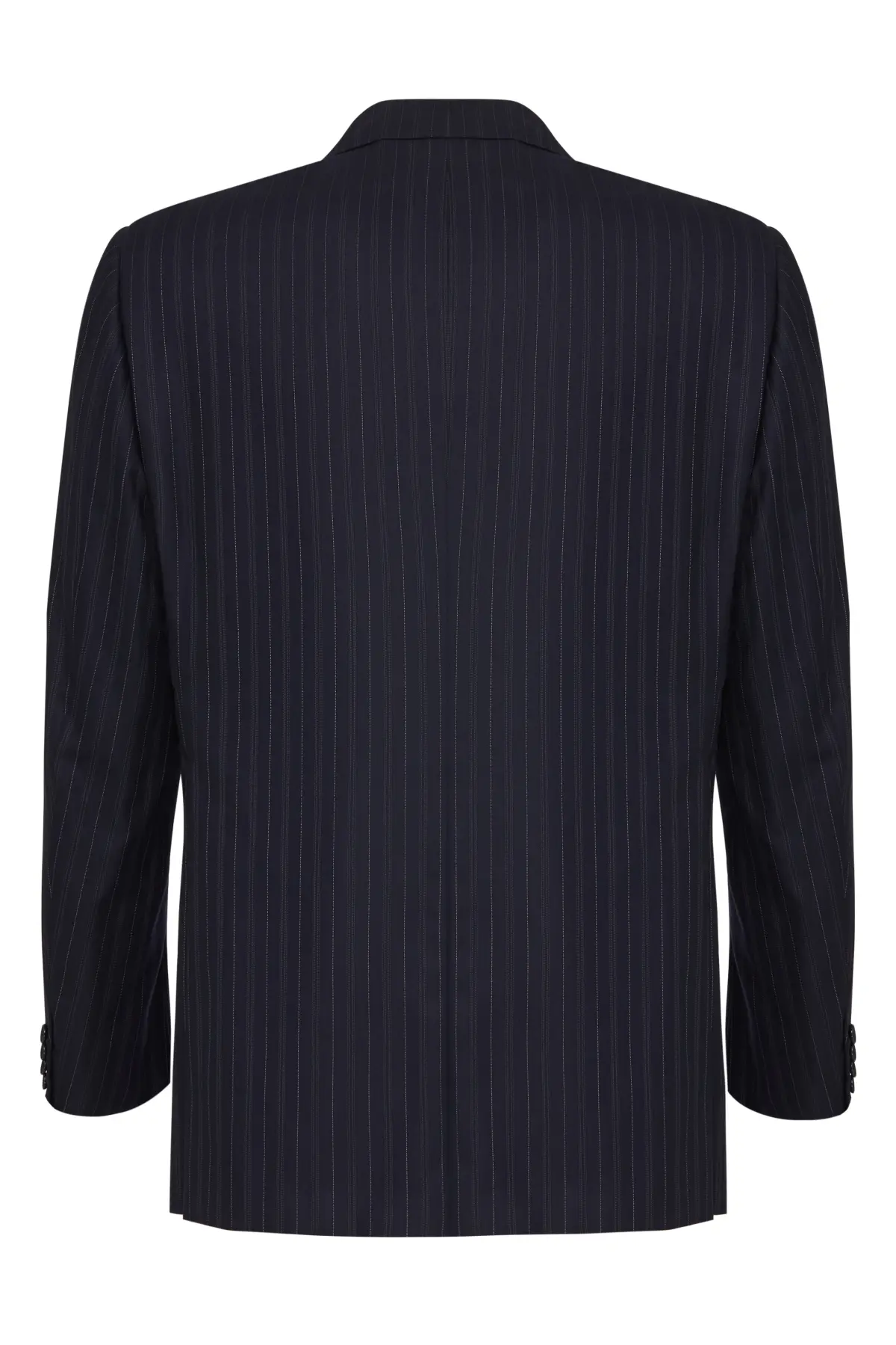 Классический костюм в насыщенном темно-синем оттенке с элегантной тонкой полоской. Однобортный пиджак на две пуговицы с аккуратными лацканами, прорезным нагрудным карманом и карманами с клапанами дополнен прямыми брюками со стрелками, формируя вытянутый, строгий силуэт. Безупречный выбор для деловых встреч, офисного дресс-кода и формальных мероприятий.