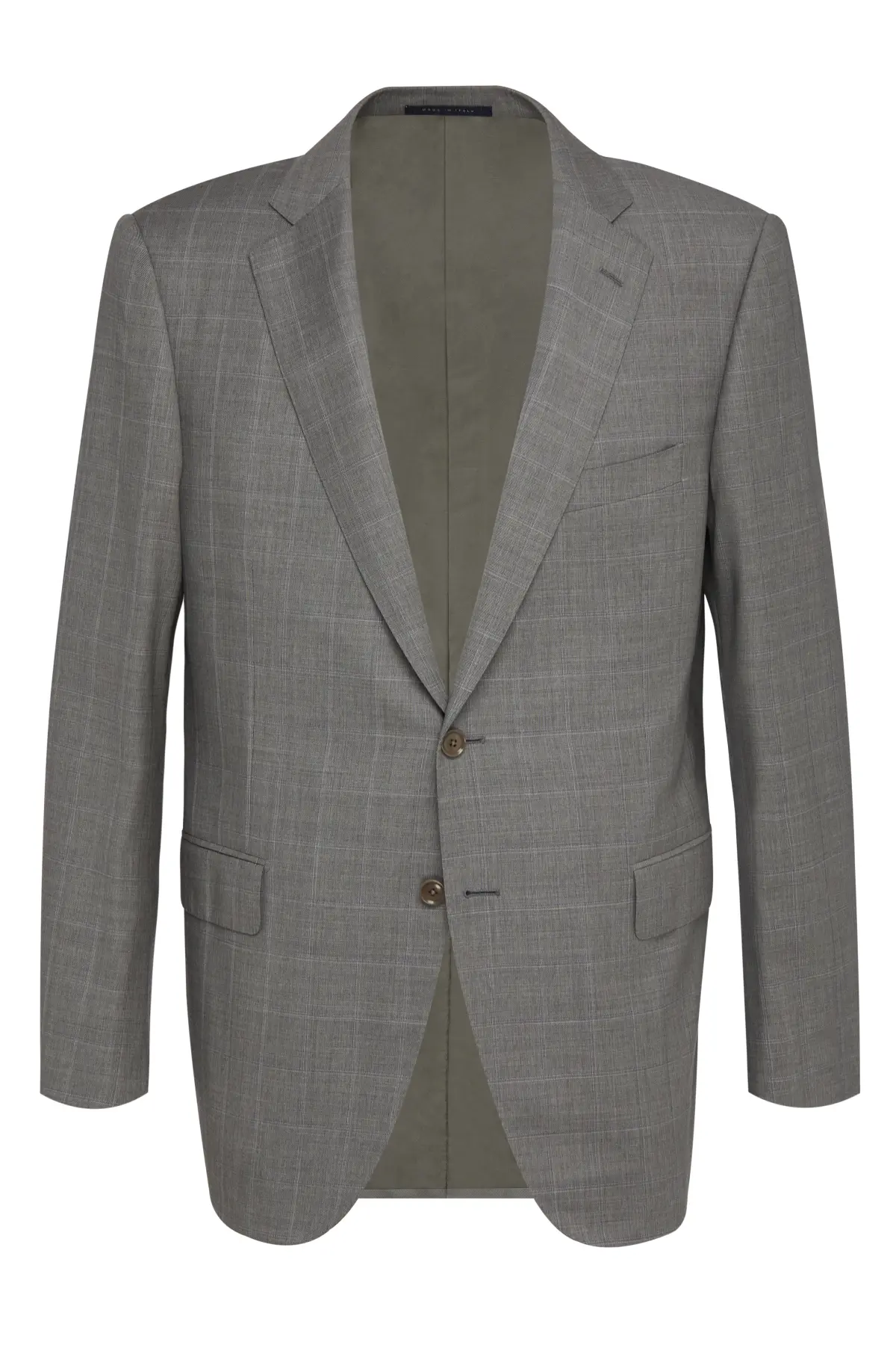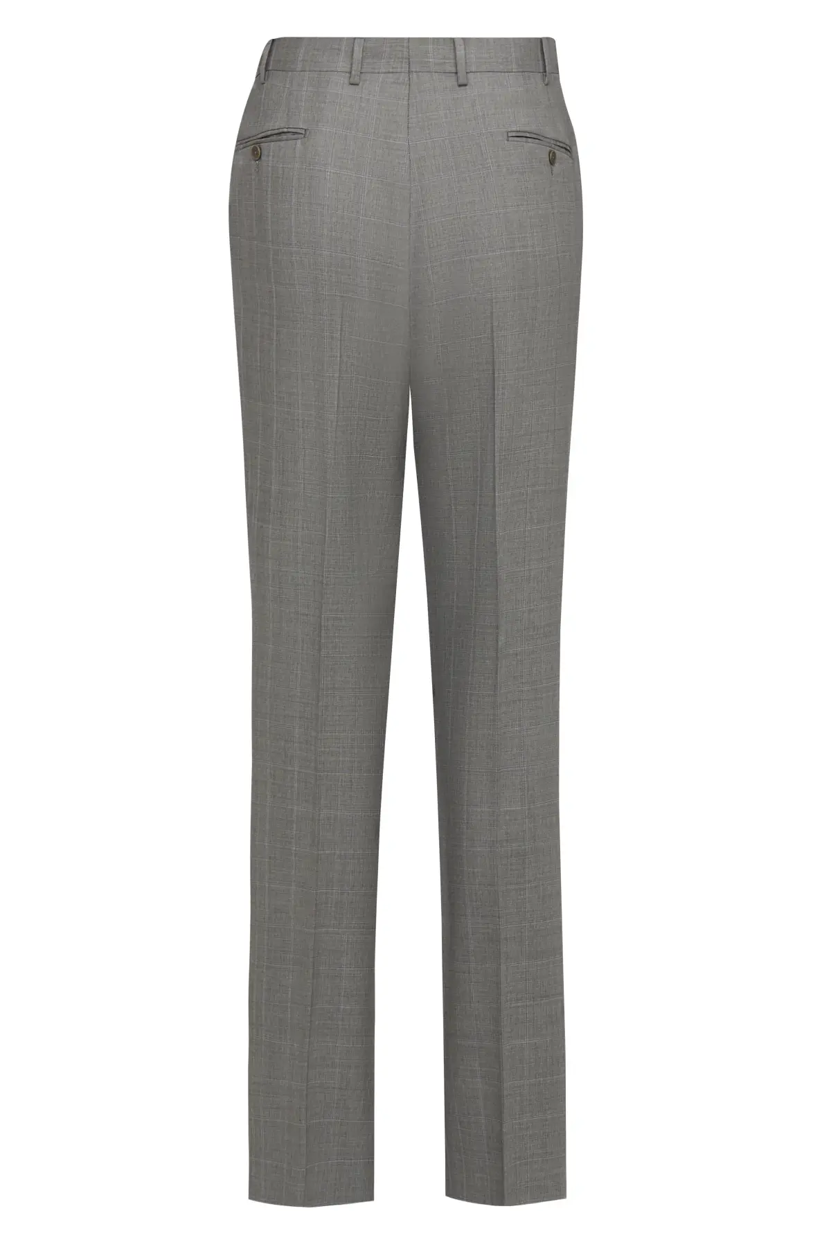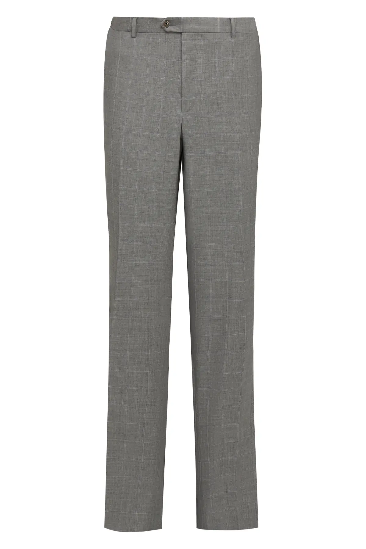 Лаконичный костюм из гладкой шерсти благородного светло-серого оттенка с едва заметным мелким рисунком. Однобортный пиджак на две пуговицы с классическими лацканами и карманами с клапанами сочетается с прямыми брюками со стрелками и формирует безупречно строгий силуэт. Универсальный вариант для офиса, деловых встреч и торжественных мероприятий.