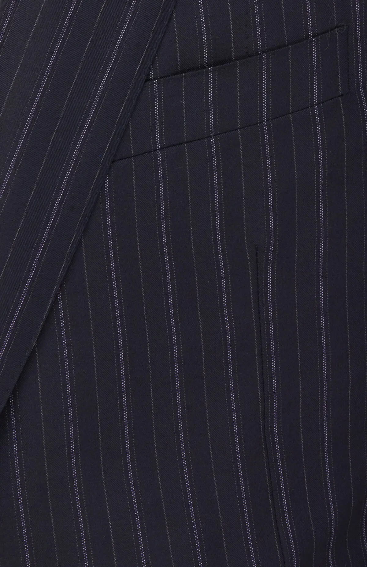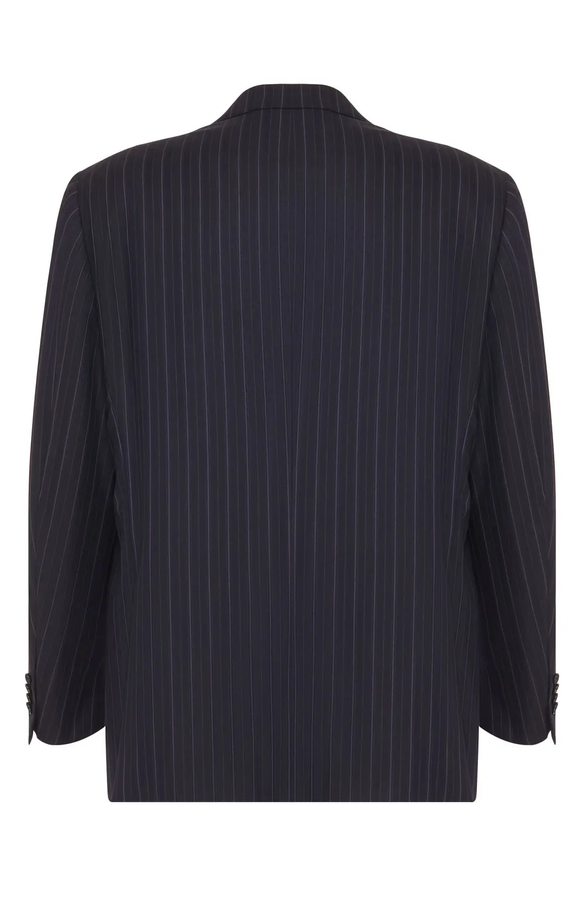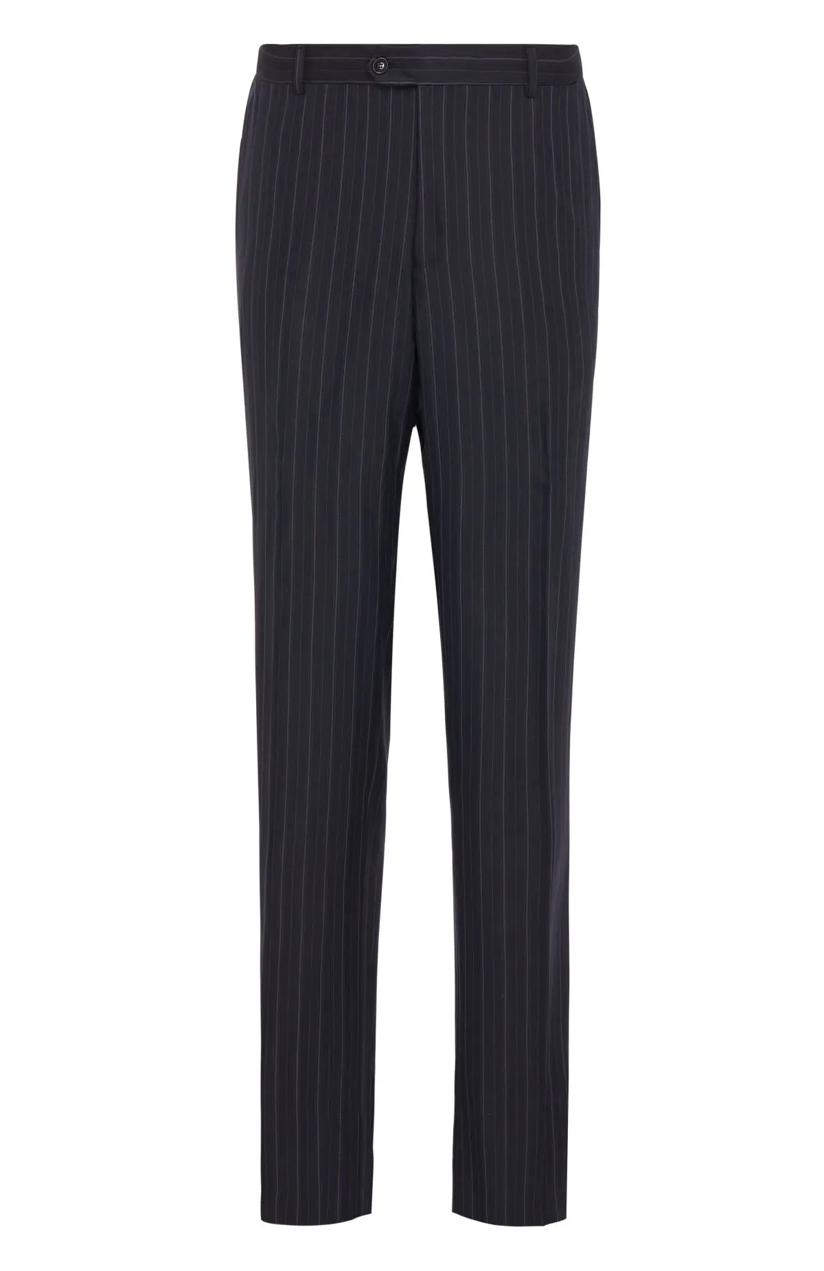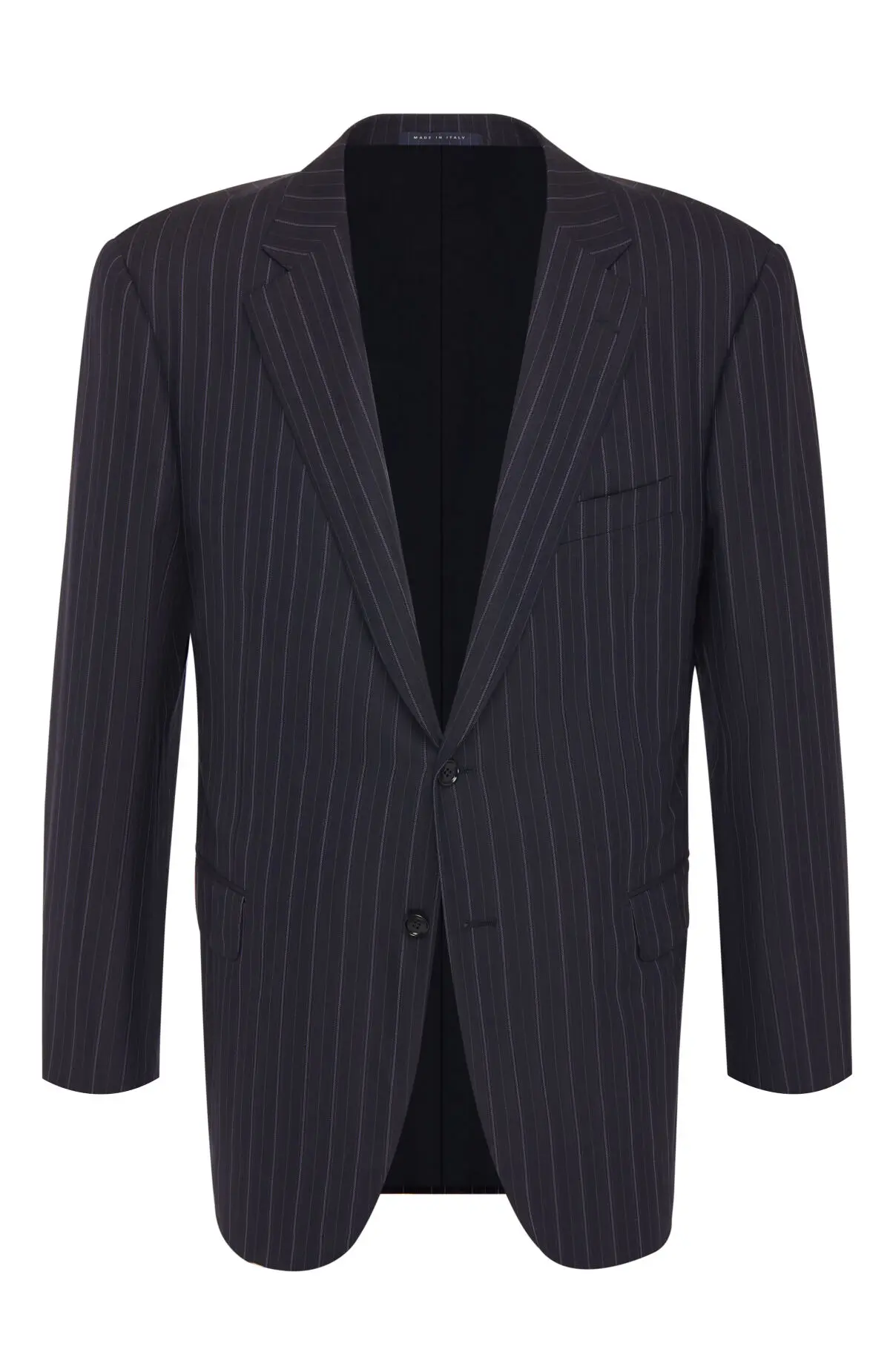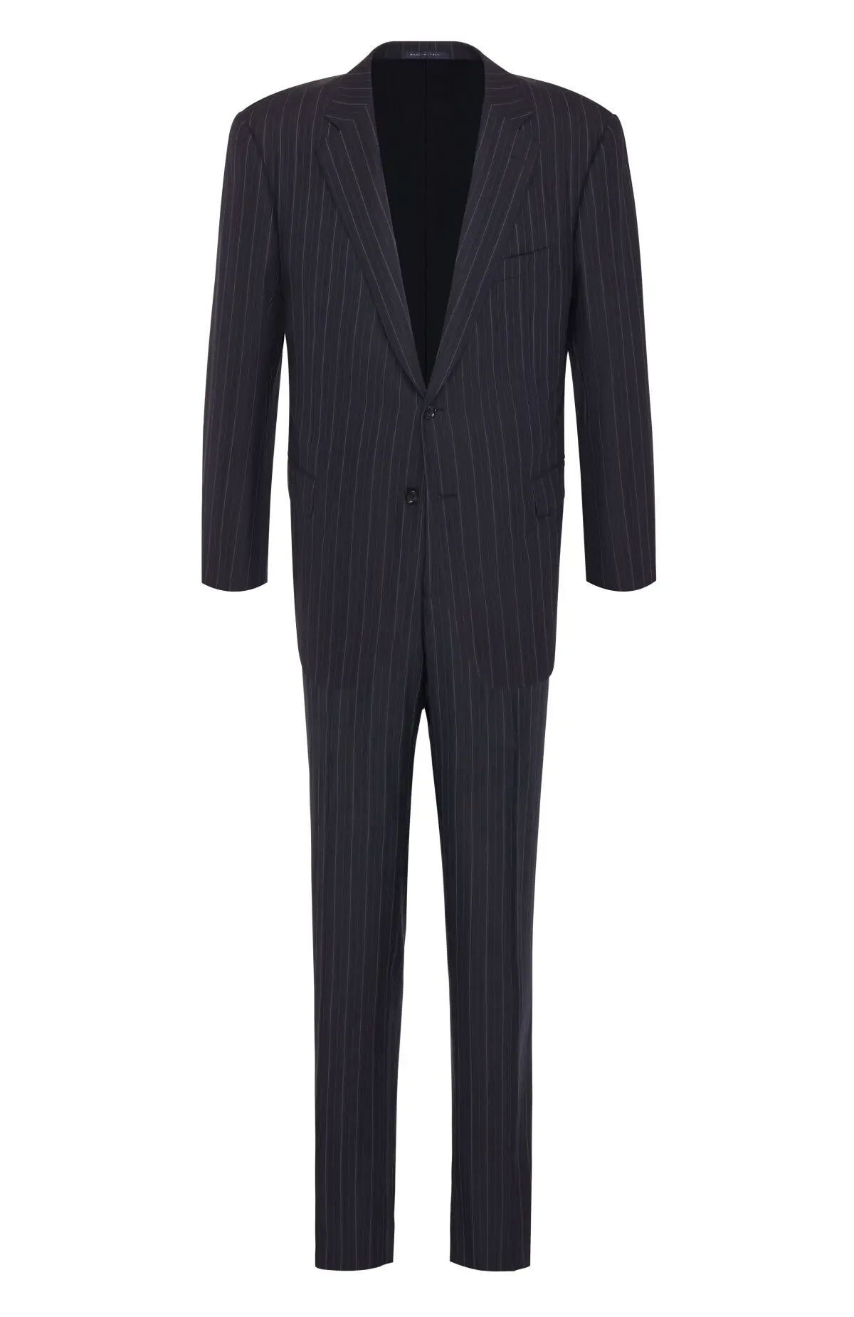Классический костюм в тонкую светлую полоску выполнен из гладкой шерсти, которая хорошо держит форму и комфортна в течение всего дня. Однобортный пиджак с заостренными лацканами и прорезными карманами дополняют прямые брюки со стрелками, визуально вытягивающие силуэт. Строгий темный оттенок подчеркивает деловой характер модели и уместен как в офисе, так и на официальных мероприятиях.