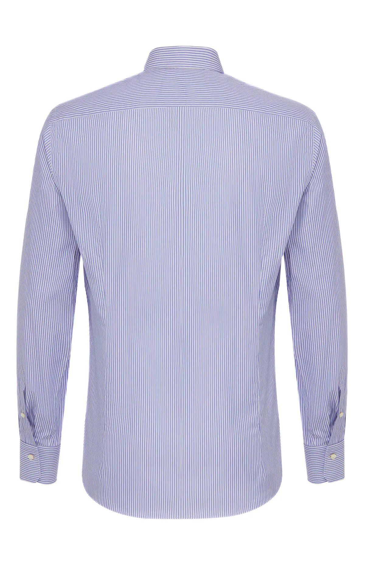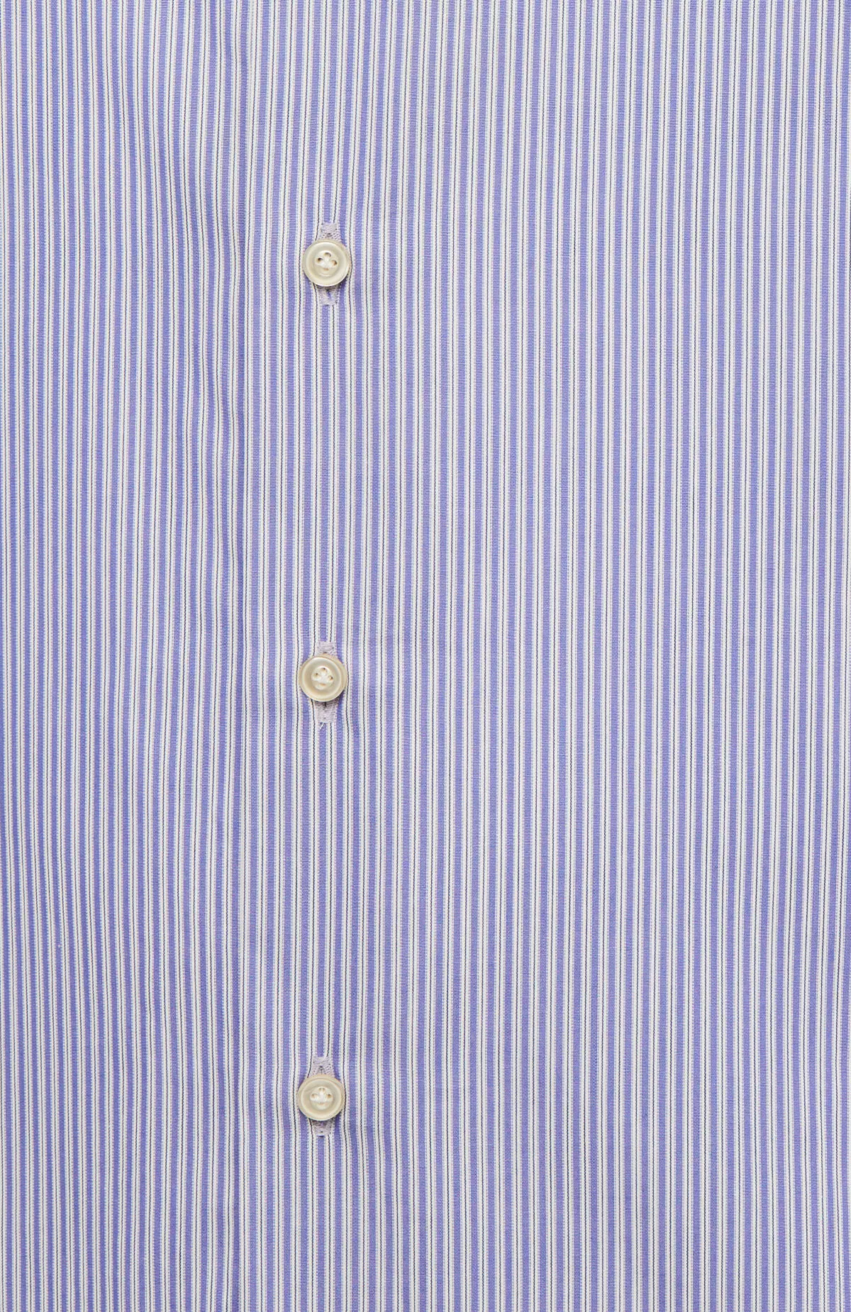 Рубашка прямого кроя с длинными рукавами выполнена из легкого хлопка в тонкую вертикальную полоску. Модель дополнена классическим отложным воротником, планкой на пуговицах и манжетами на пуговице. Лаконичный дизайн легко вписывается как в деловой, так и в повседневный гардероб.