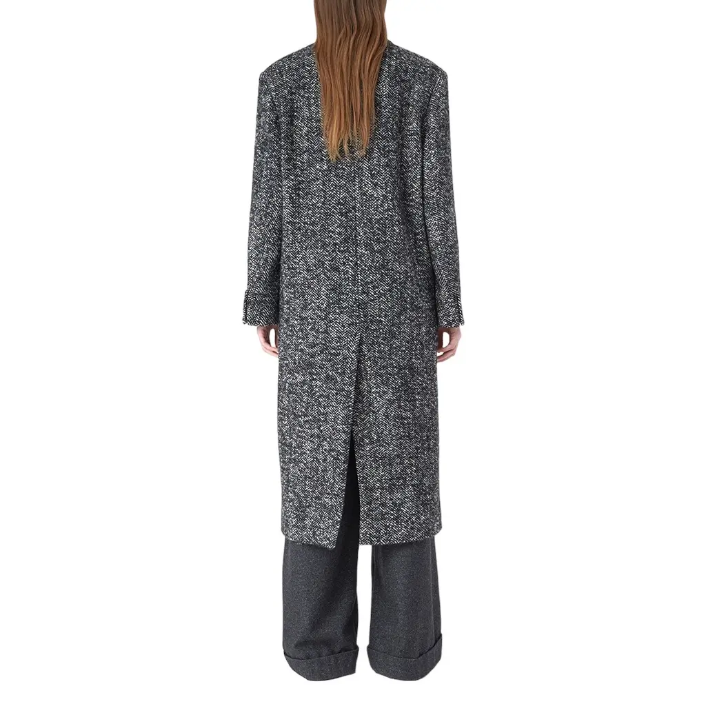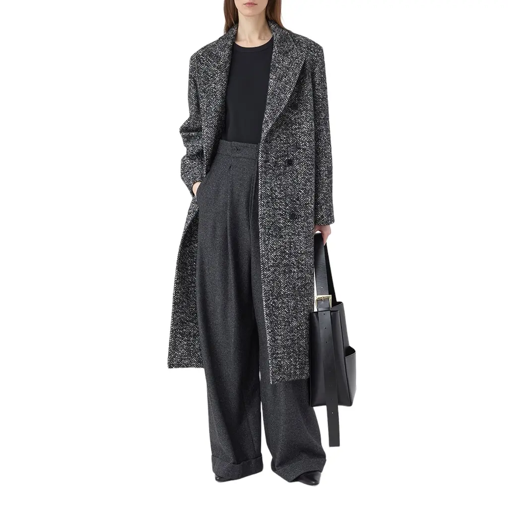 Двубортное пальто Closed изготовлено из итальянского букле с узором «елочка». Мягкое и теплое изделие - отличный вариант в непогоду. У модели есть поднимающиеся лацканы, прорезные карманы и манжеты на пуговицах. Пальто имеет подкладку и внутренний карман на пуговицах.