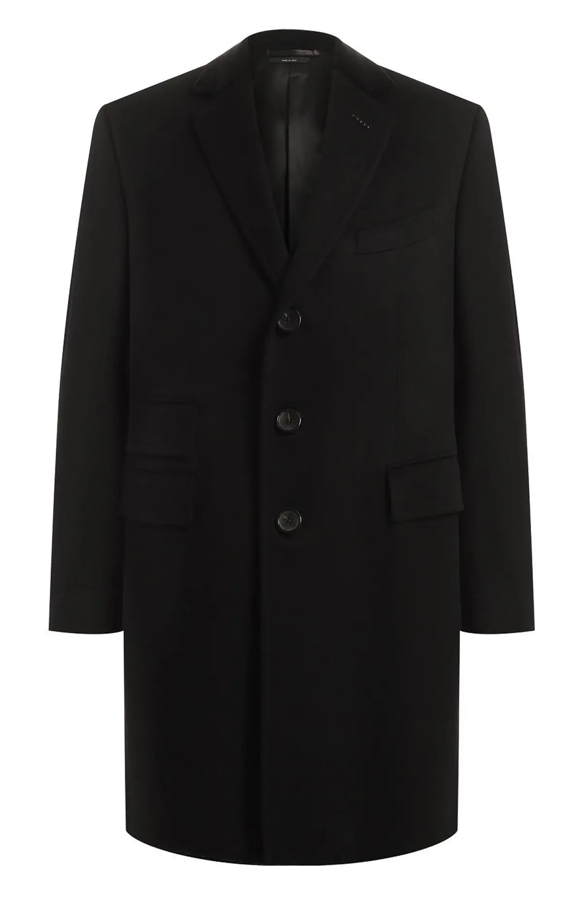 Шерстяное пальто Tom Ford в черном цвете выполнено в классическом крое с отложным воротником, застежкой на три пуговицы и карманами с клапанами. Элегантная и универсальная модель для делового и повседневного стиля.