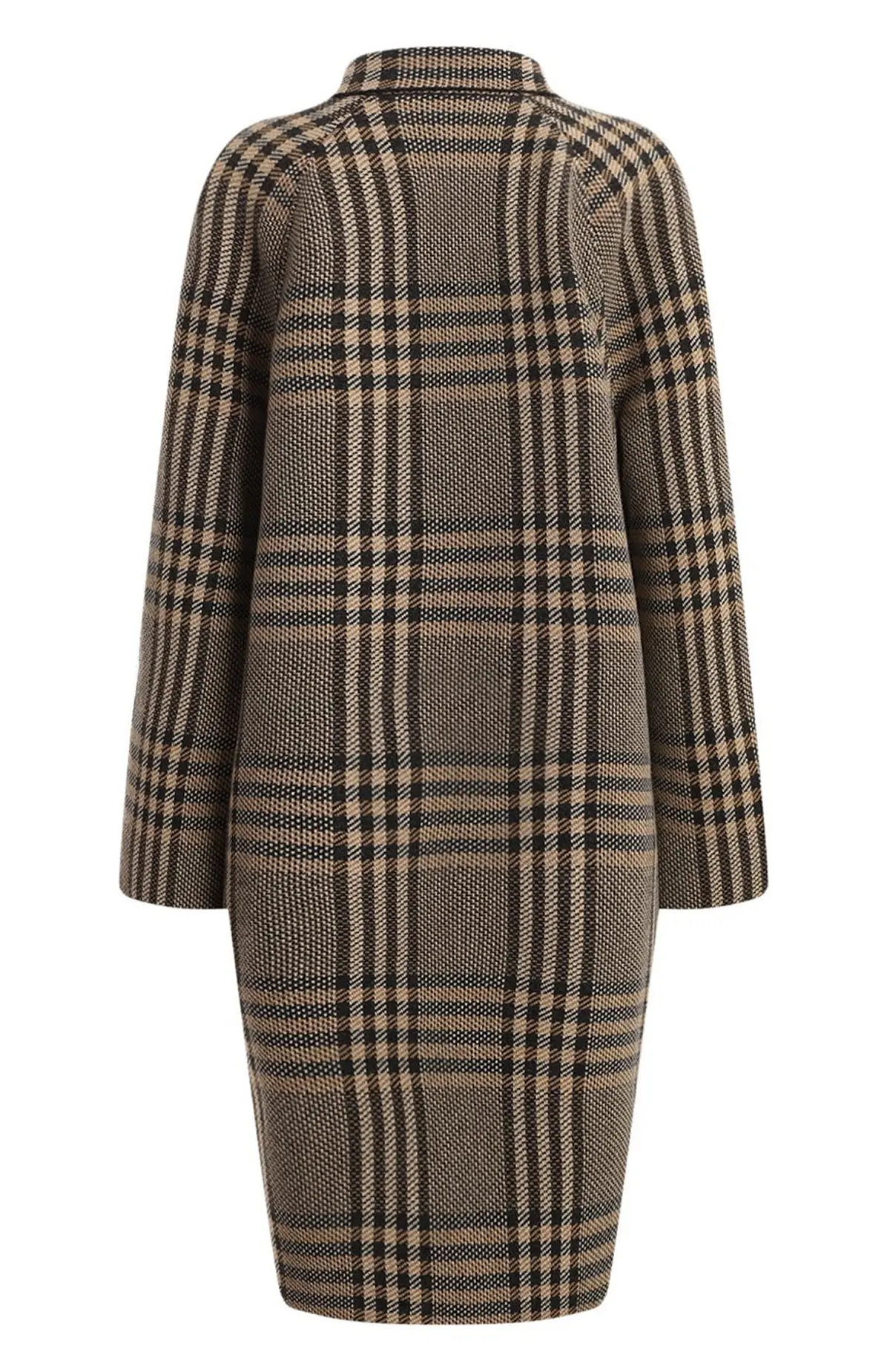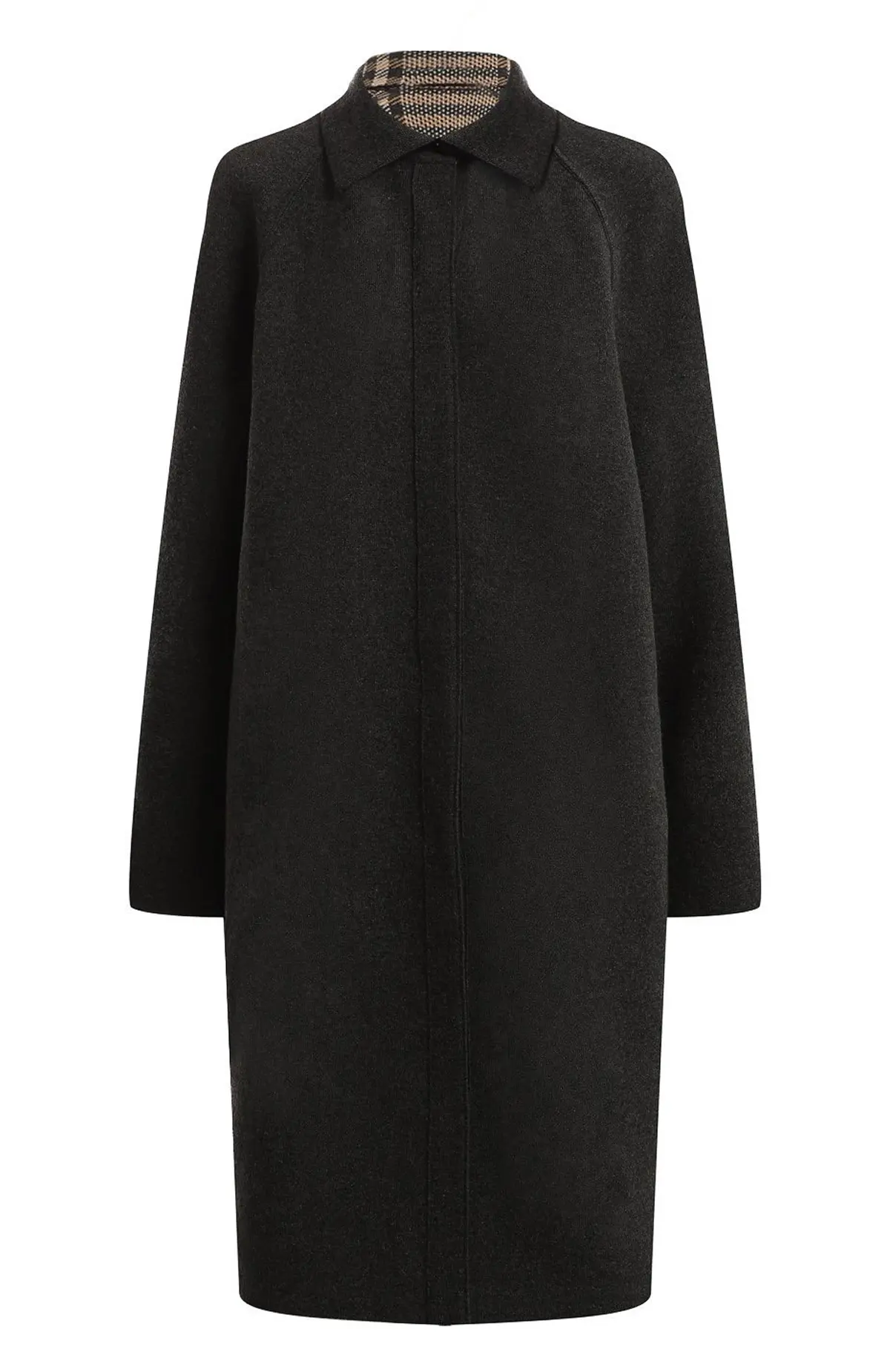 Двустороннее пальто Loro Piana из шерсти сочетает в себе практичность и изысканный стиль. С одной стороны оно выполнено в классическом клетчатом узоре в бежево-черной гамме, с другой — в однотонном черном цвете, что позволяет легко менять настроение образа. Прямой силуэт, аккуратный воротник и скрытая застежка подчеркивают элегантность и универсальность модели, которая идеально подходит как для деловых встреч, так и для повседневной носки.
