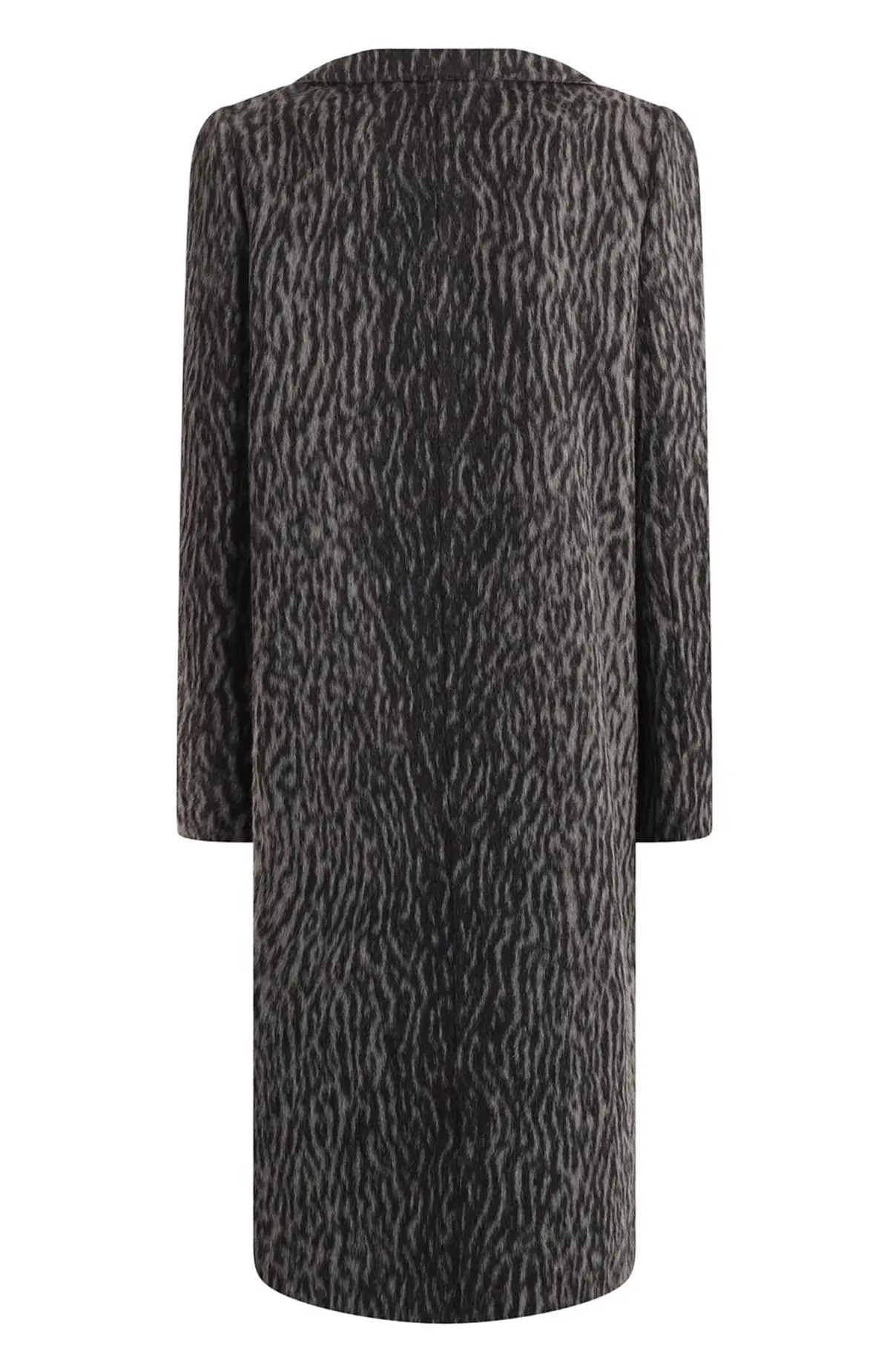 Шерстяное пальто Salvatore Ferragamo выполнено из мягкой фактурной шерсти в серо-графитовом оттенке с абстрактным леопардовым рисунком. Прямой силуэт, классический воротник и застёжка на пуговицы подчеркивают изысканную элегантность модели. Внутренняя отделка из шелковистой подкладки обеспечивает комфорт, а фирменная безупречная посадка делает пальто идеальным выбором для утончённого повседневного образа.