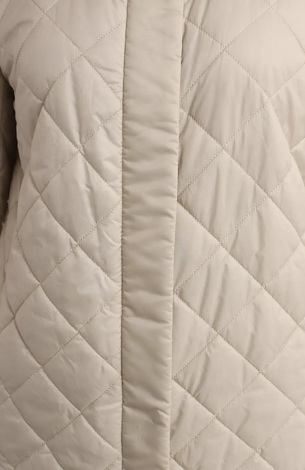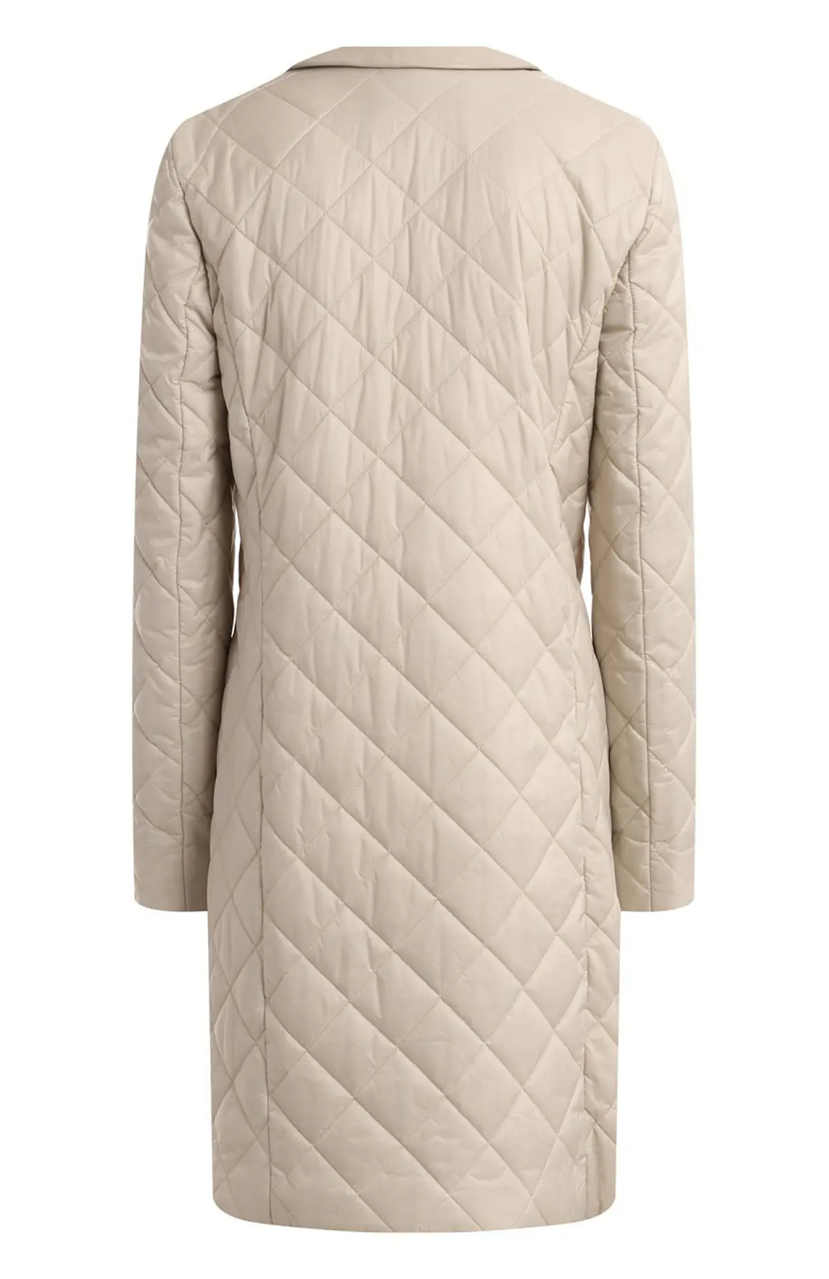 Пальто Salvatore Ferragamo выполнено из лёгкого, стёганого материала в оттенке бежевого шампань. Прямой силуэт и лаконичный дизайн подчёркнуты аккуратным отложным воротником и фирменной застёжкой с металлической пряжкой Gancini. Элегантная и функциональная модель идеально подойдёт для межсезонья, сочетая комфорт и безупречный итальянский стиль.
