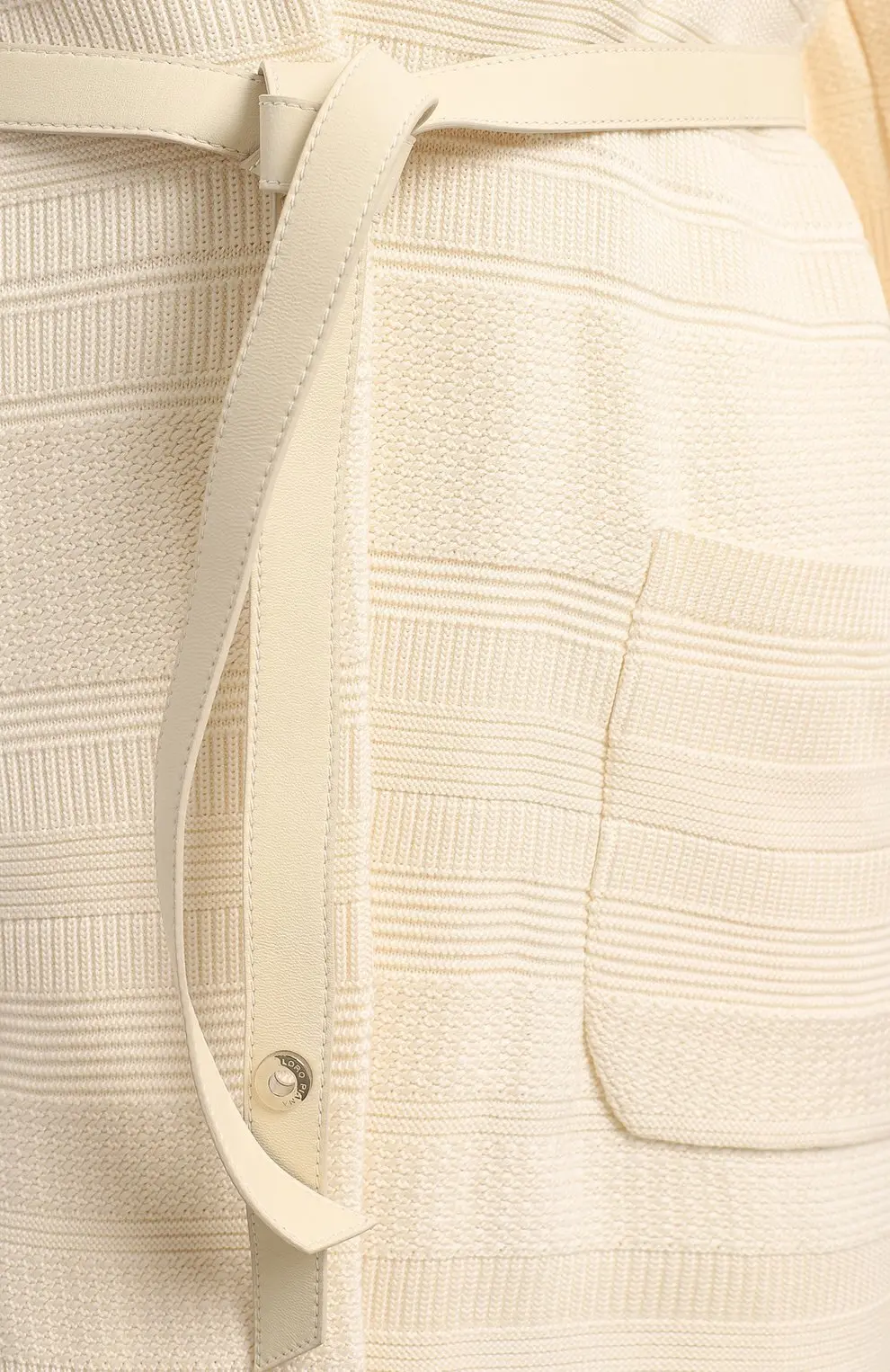 Кардиган из шелка и хлопка Loro Piana выполнен в светлом кремовом оттенке. Модель имеет расслабленный силуэт с длинными рукавами и акцентируется поясом на талии, что позволяет подчеркнуть фигуру. Фактурный узор в виде горизонтальных полос придаёт изделию утончённость и стиль. Накладные карманы добавляют практичности, а лёгкий и дышащий материал из смеси шёлка и хлопка обеспечивает комфорт при носке. Такой кардиган станет универсальной вещью в гардеробе, подходящей как для повседневных, так и для более элегантных образов.