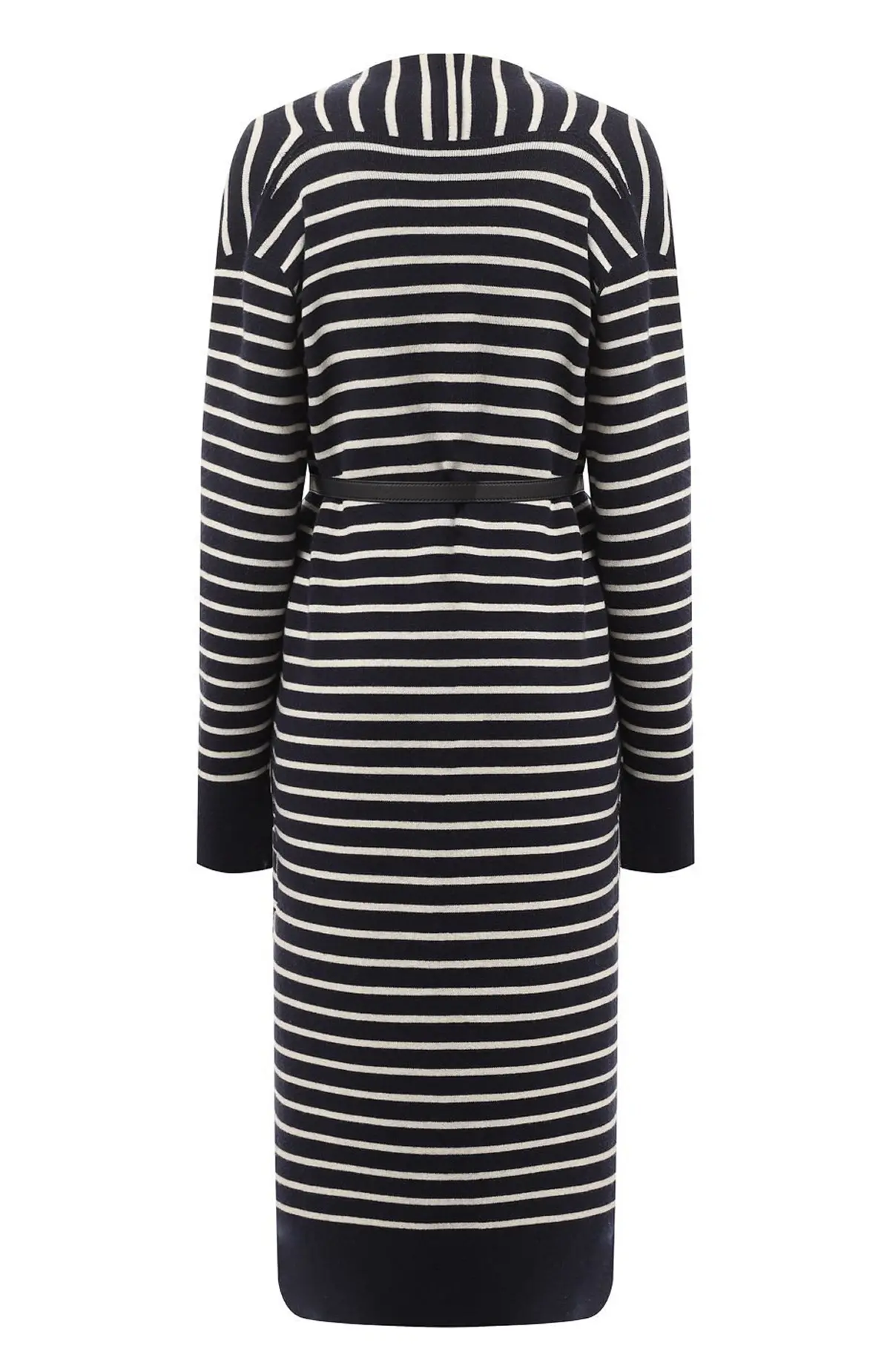 Кардиган Loro Piana в морском стиле с контрастным полосатым узором. Модель выполнена из мягкого замша с добавлением кашемира, отличается прямым силуэтом и акцентируется тонким кожаным поясом на талии. Удлинённый крой и глубокий V-образный вырез придают образу элегантность и универсальность.