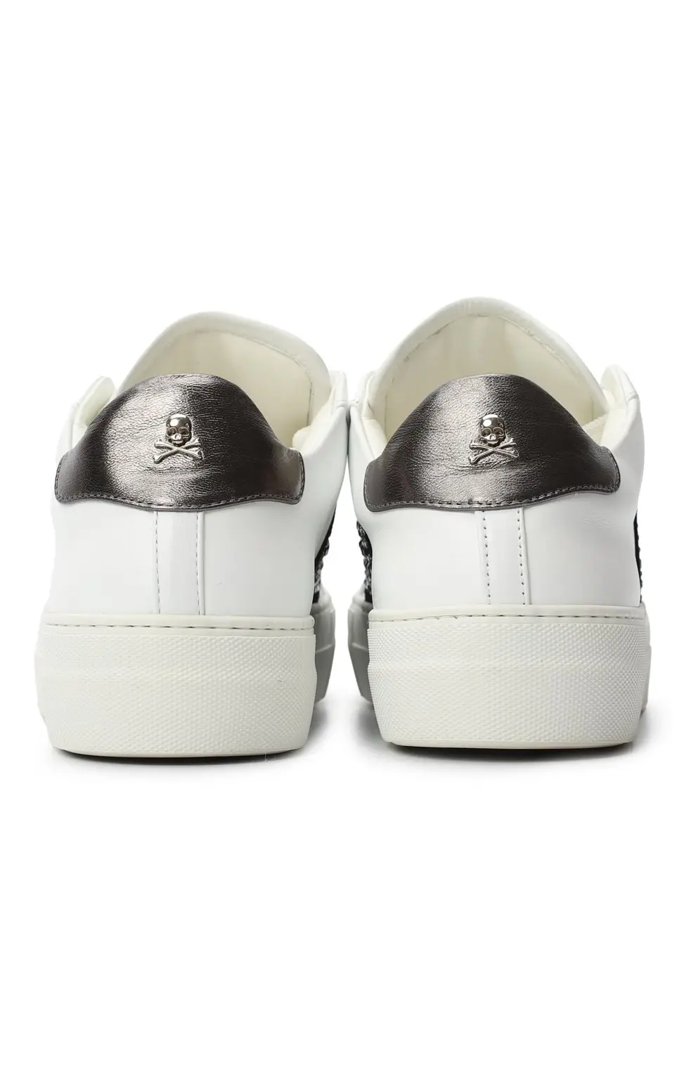 Белые кроссовки от Philipp Plein — эффектное сочетание спортивного силуэта и яркого декора. Модель выполнена из гладкой кожи и дополнена широкой черной вставкой, усыпанной мерцающими кристаллами, которые образуют фирменный мотив бренда. Контрастная деталь на пятке подчеркивает стильный дизайн. Объемная резиновая подошва с тиснением Philipp Plein обеспечивает комфорт и износостойкость, а отсутствие шнуровки делает пару максимально удобной для повседневной носки.
